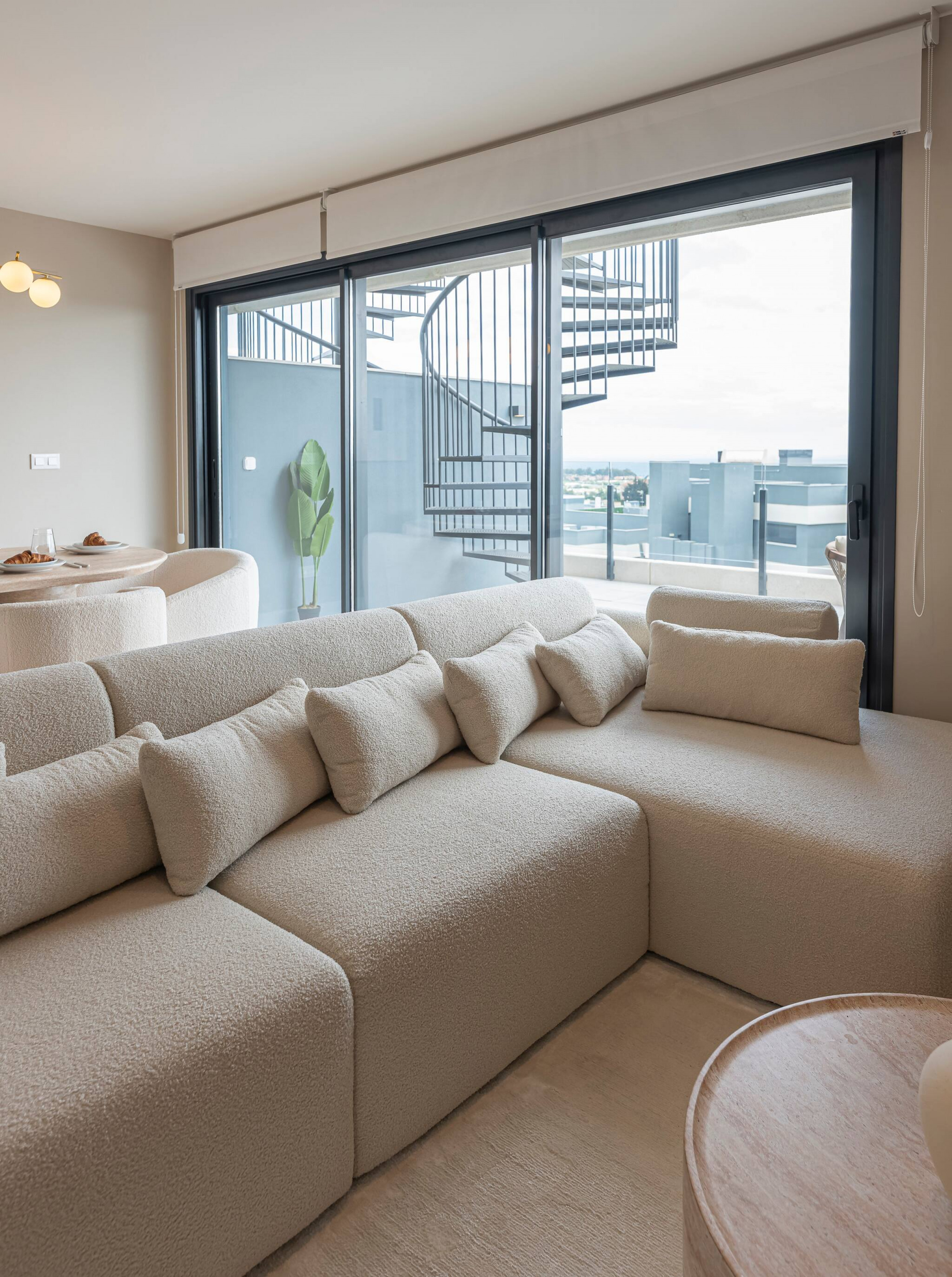 >Terraza: Un espacio al aire libre amplio y luminoso en forma de L, con vistas a la urbanización. Está equipada con una mesa y sillas para 6 comensales, dos tumbonas y muebles de exterior, ideales para relajarte tras un día de playa.