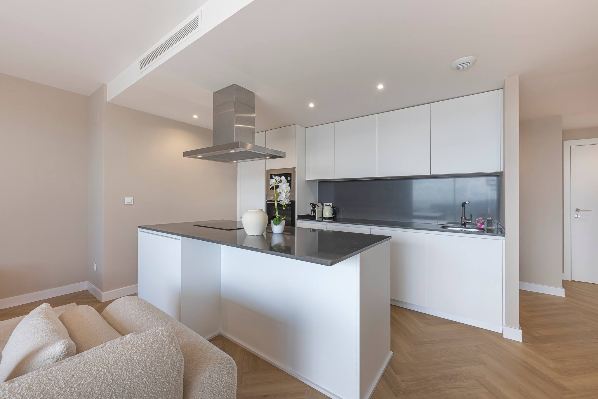 >Cocina: Una cocina completamente equipada con todos los electrodomésticos necesarios para disfrutar de tus comidas favoritas. Está separada del salón a través de una gran barra con banquetas donde podrás disfrutar de un desayuno o una comida informal.
