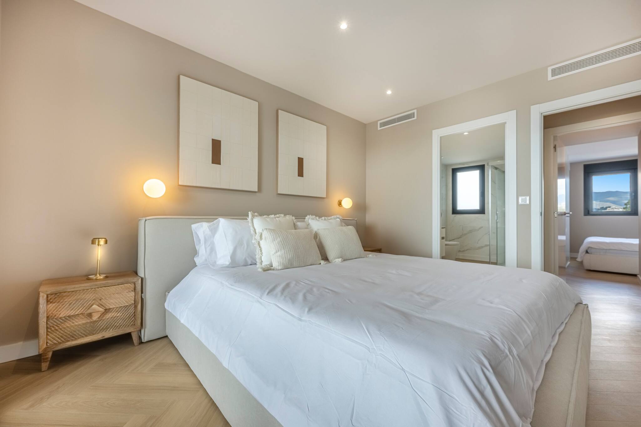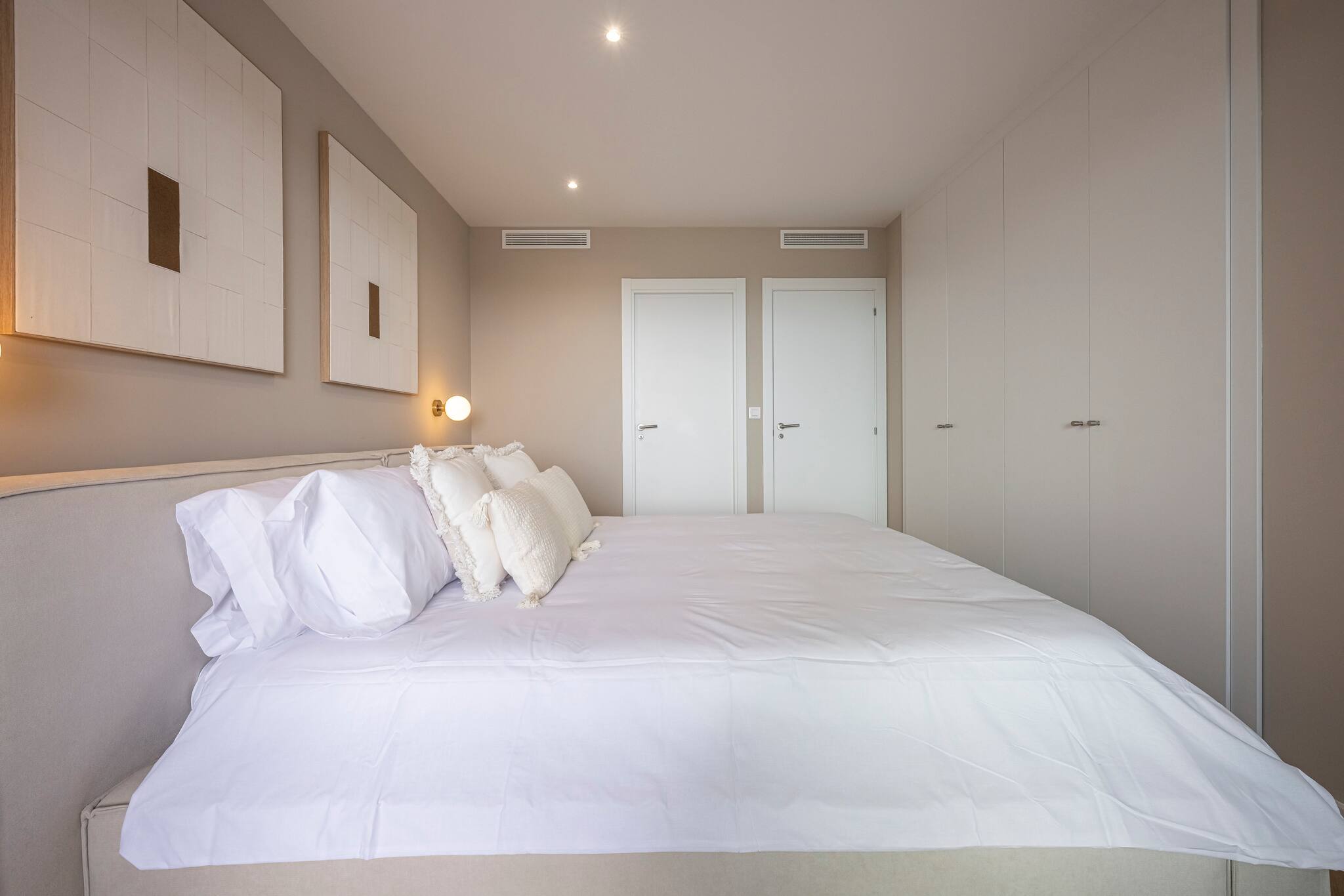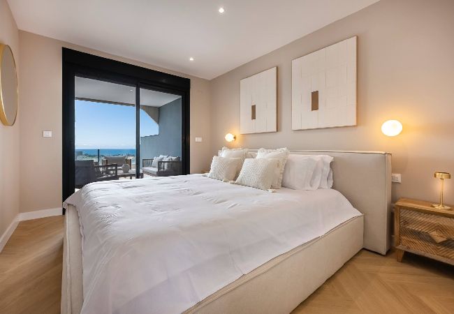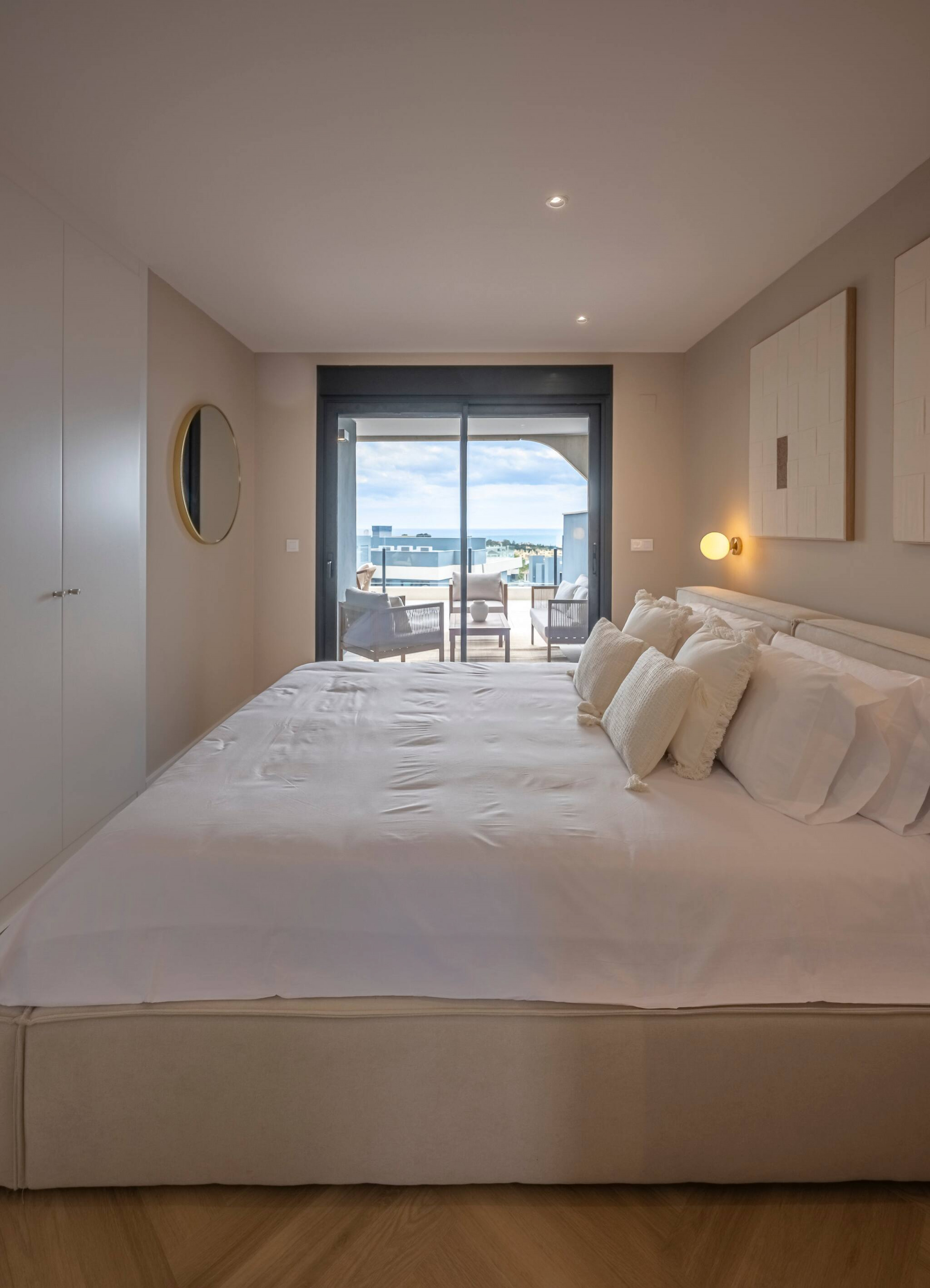 >Dormitorios: El apartamento dispone de tres dormitorios amplios, todos ellos con una cama doble, espacio de guardado y mesas de noche para mayor comodidad. El dormitorio principal cuenta con salida directa a la terraza y baño ensuite.