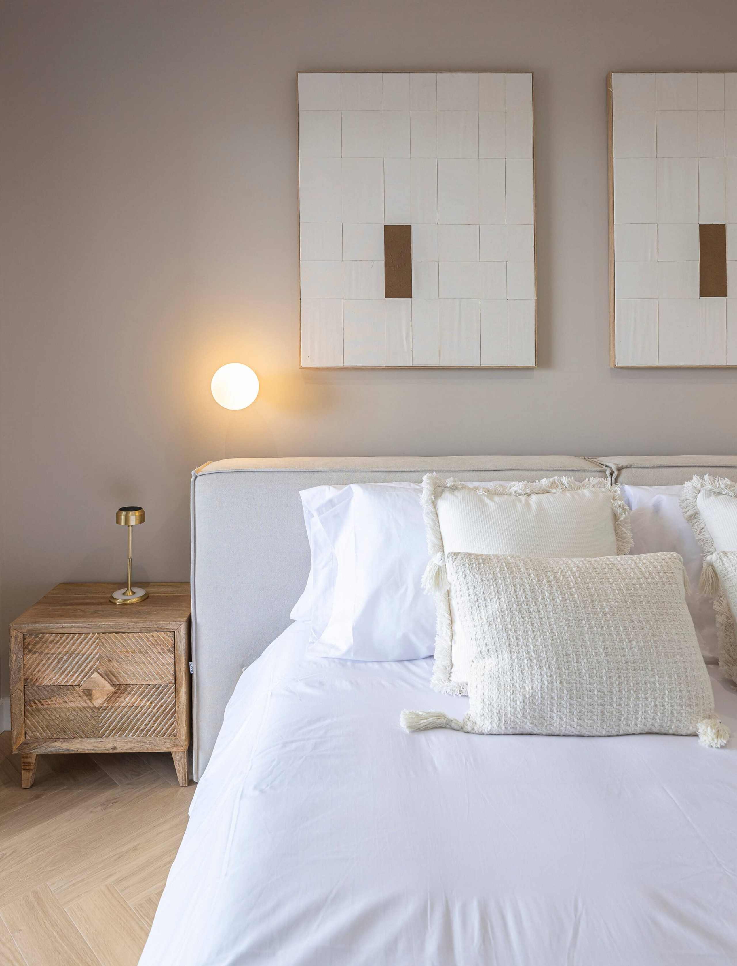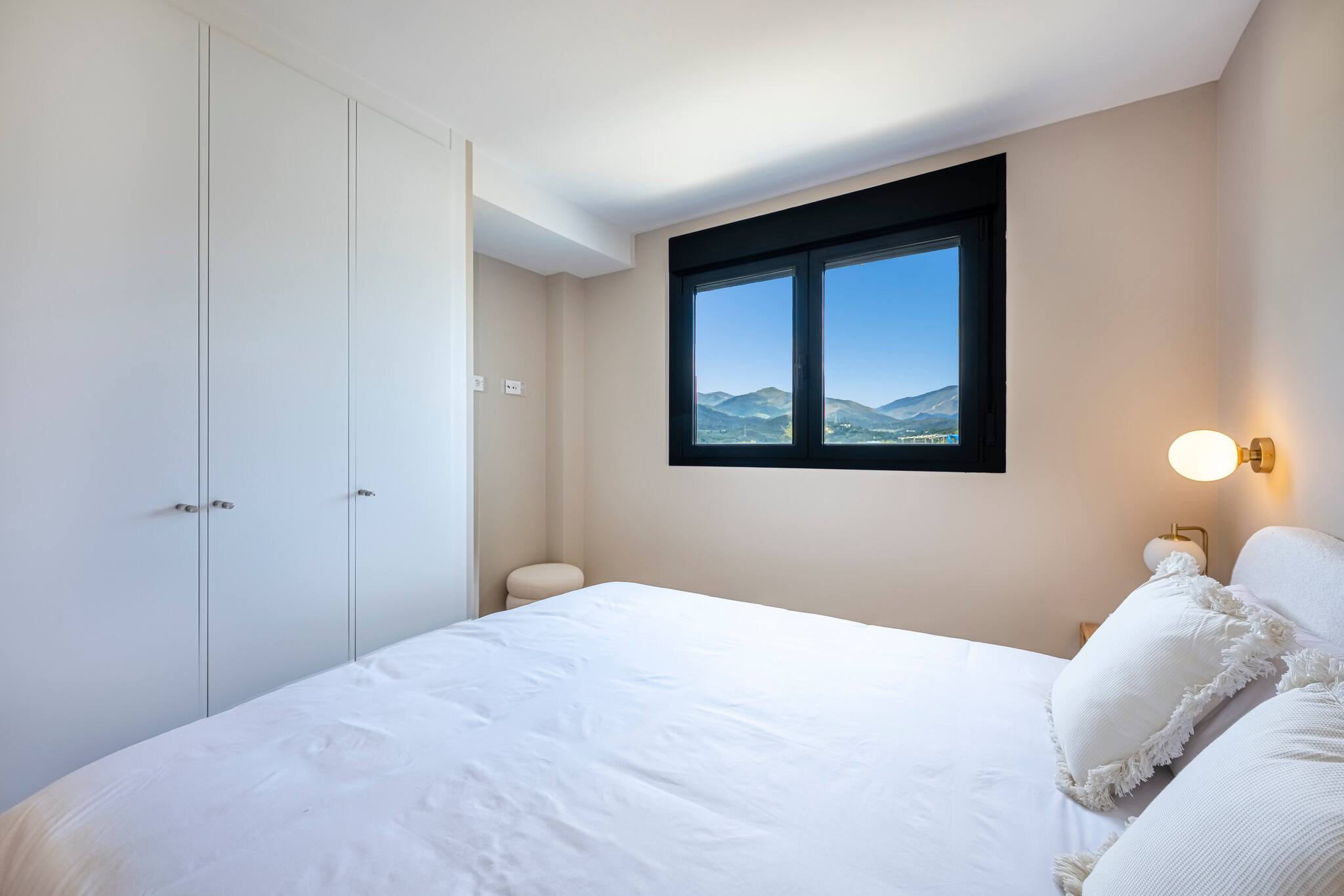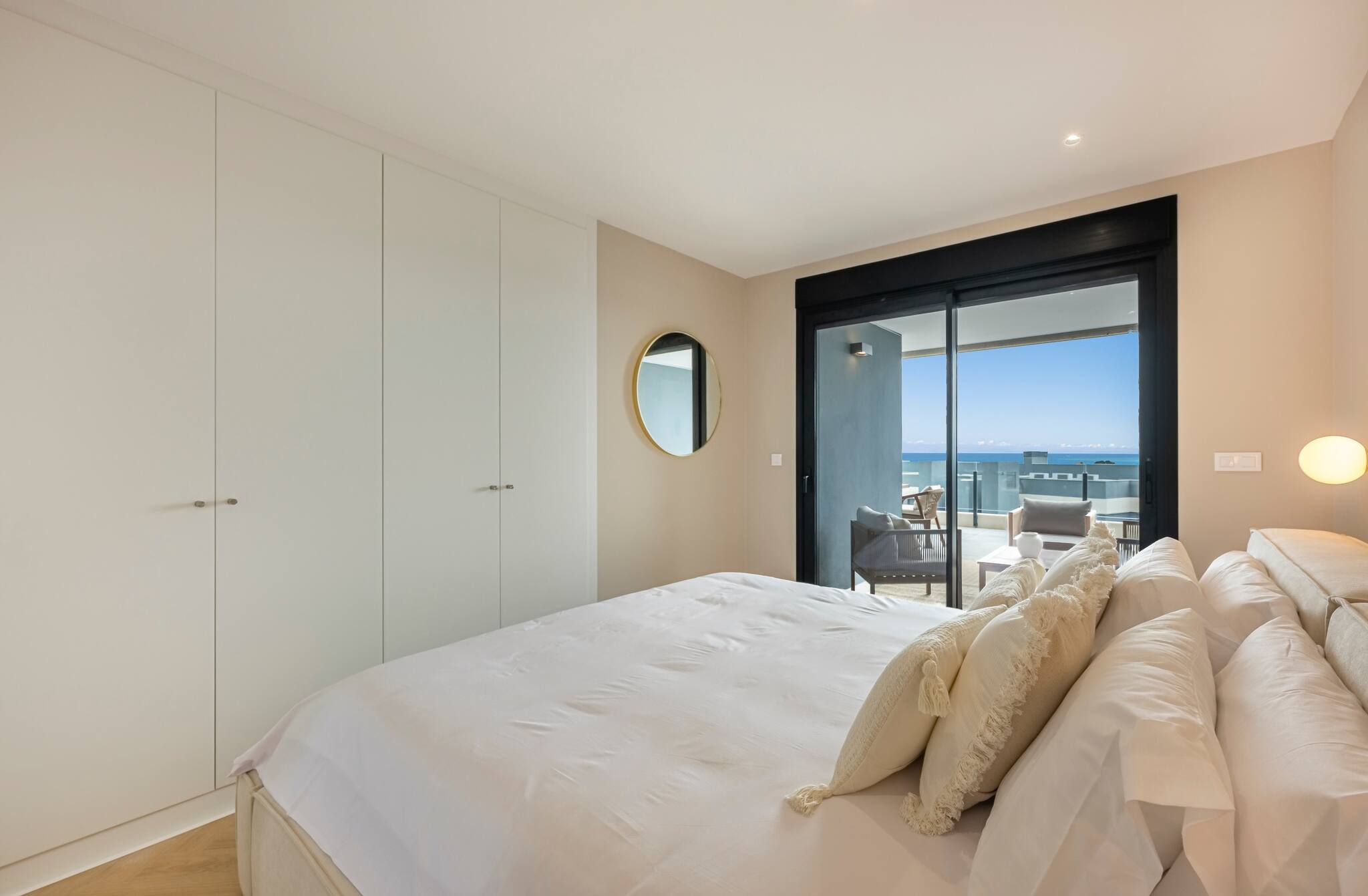 >Dormitorios: El apartamento dispone de tres dormitorios amplios, todos ellos con una cama doble, espacio de guardado y mesas de noche para mayor comodidad. El dormitorio principal cuenta con salida directa a la terraza y baño ensuite.