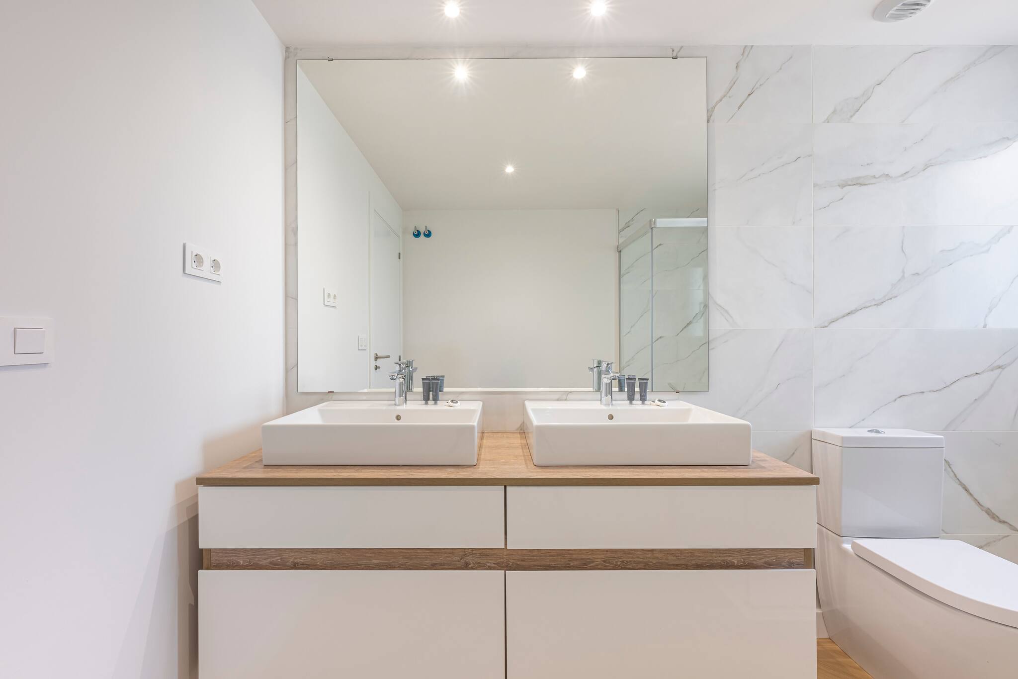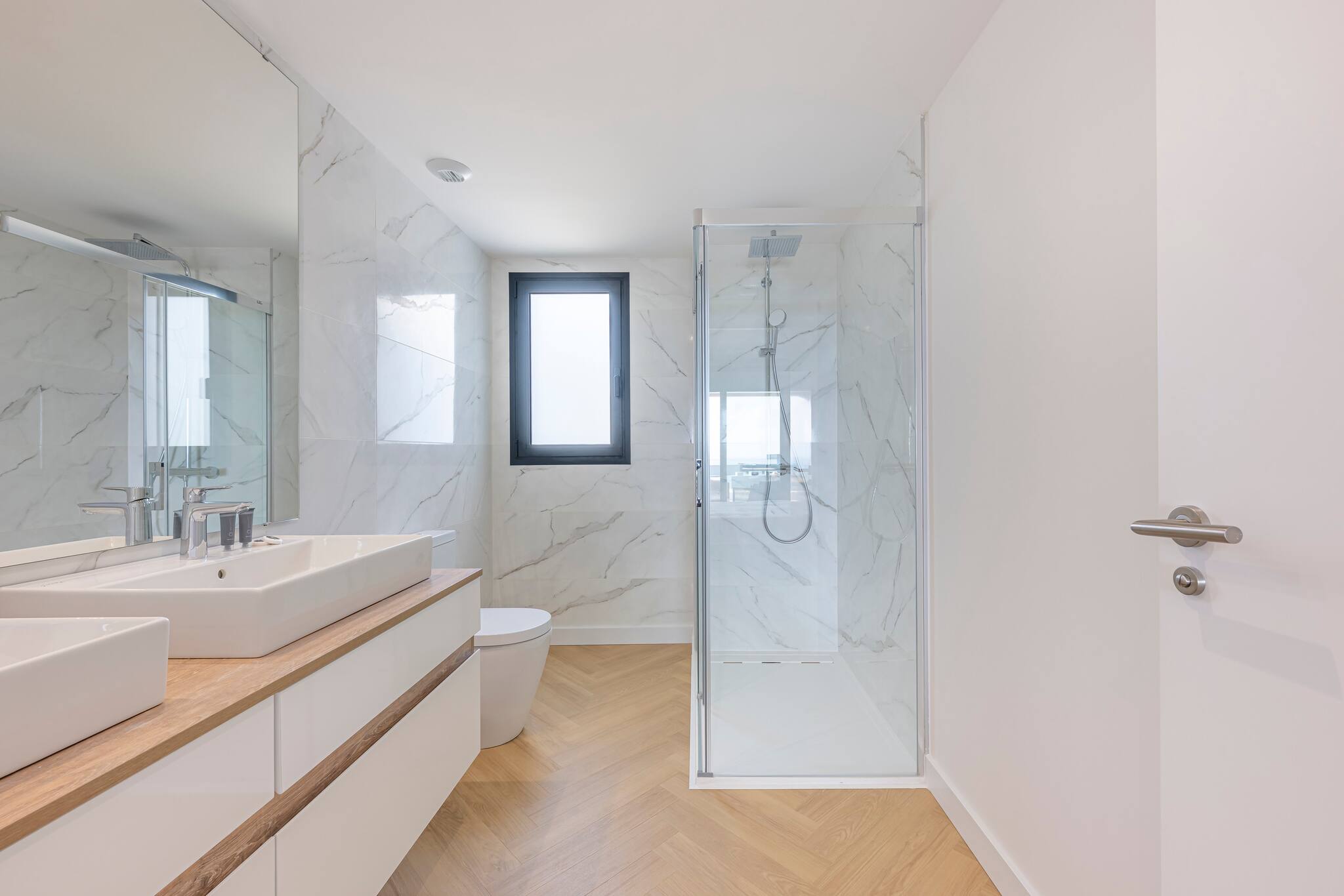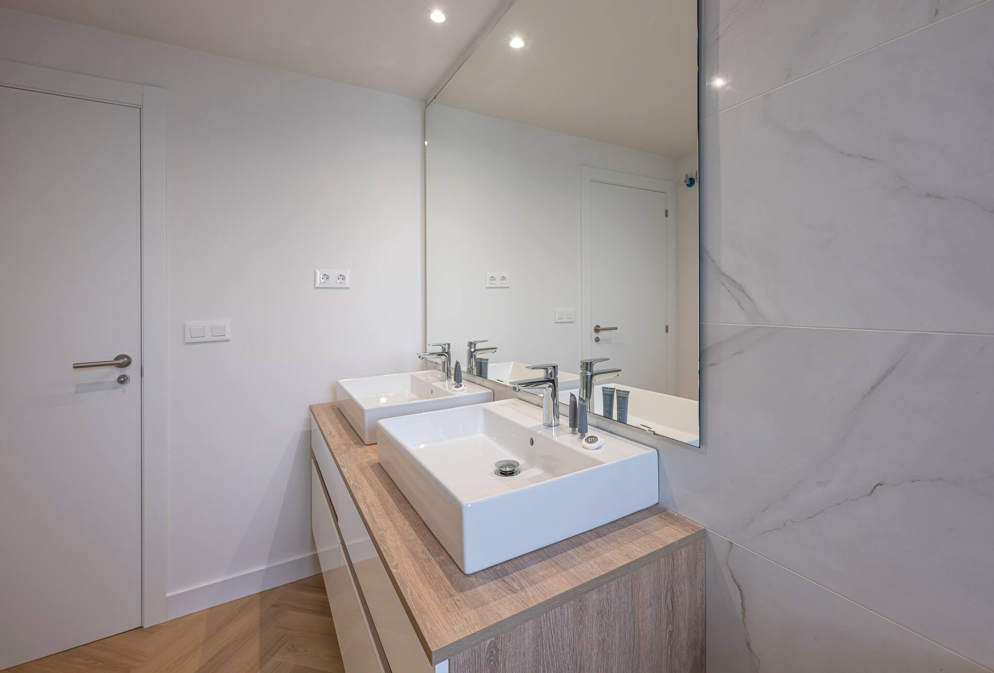 >Baños: La vivienda incluye dos modernos y luminosos baños equipados con lavabo, inodoro y amplios espejos. Uno de ellos es ensuite. El baño principal cuenta con dos lavabos y una bañera, mientras que el segundo baño dispone de una ducha de alta presión.