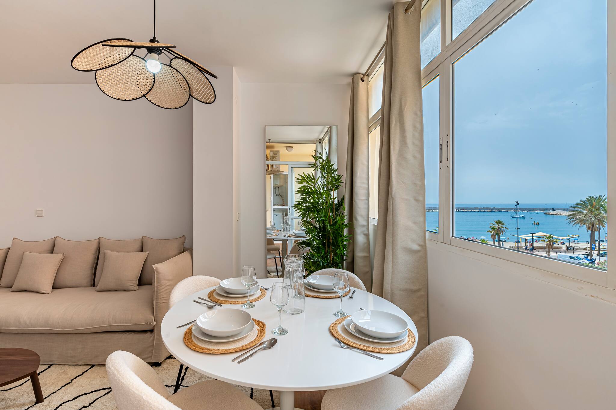 El sector de la sala tiene un hermoso ventanal a lo largo de la pared opuesta por donde se puede ver el mar y en donde esta ubicada la mesa para 4 comensales. Tiene un sofá-cama para 2 huéspedes, aire acondicionado frío/caliente y una Smart TV. Desde este ambiente, a través de una puerta corrediza de vidrio, se puede acceder a la terraza desde donde también se puede ver el mar.