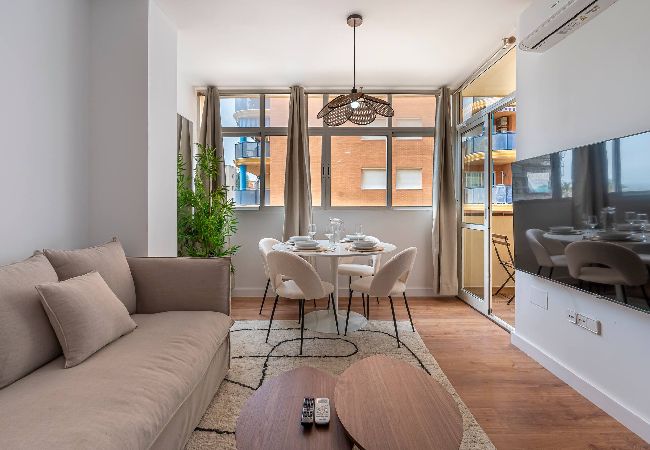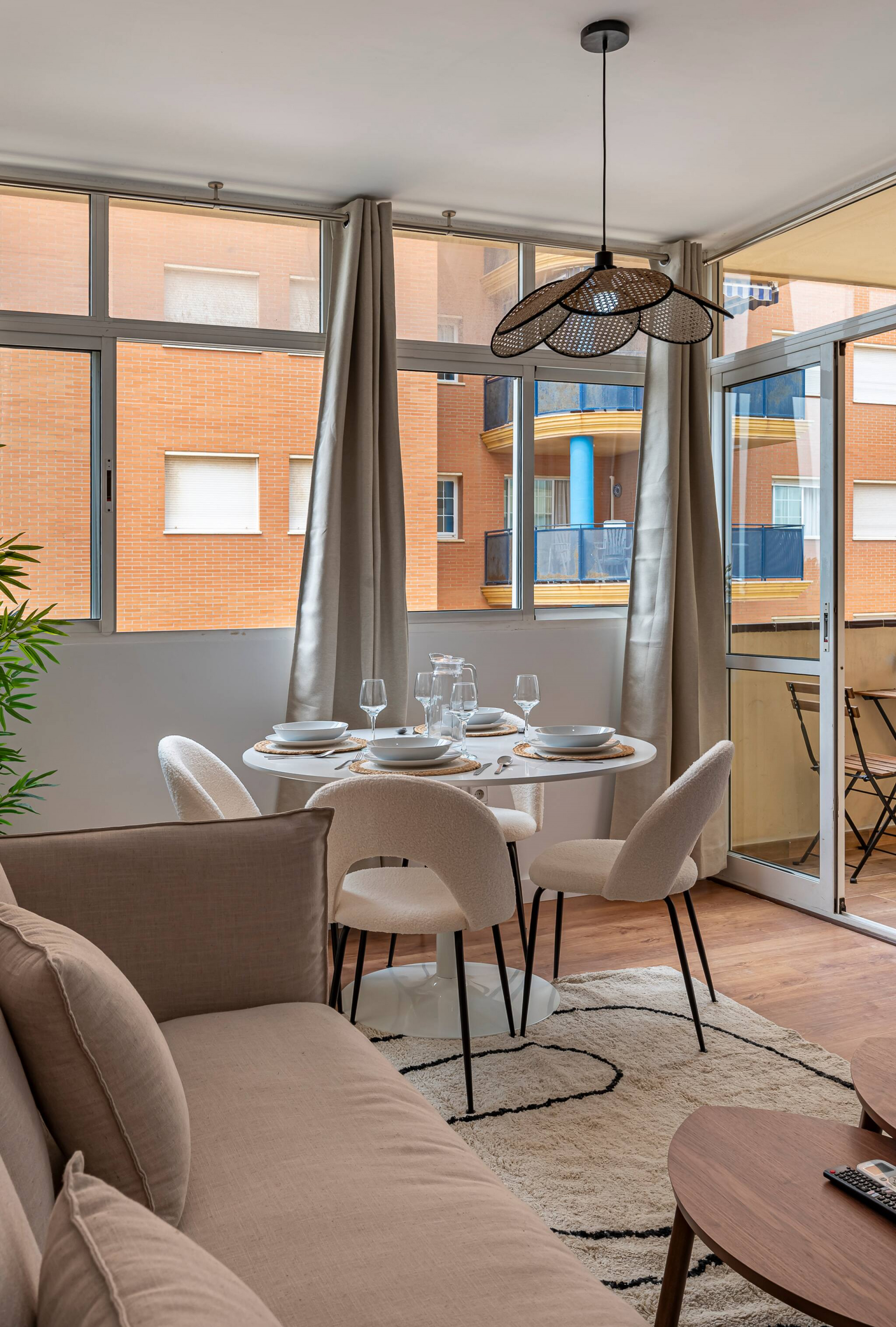 > Living Comedor: mesa y sillas para disfrutar de ricas comidas, un amplio sofá cama para disfrutar de la televisión, y salida a la terraza.