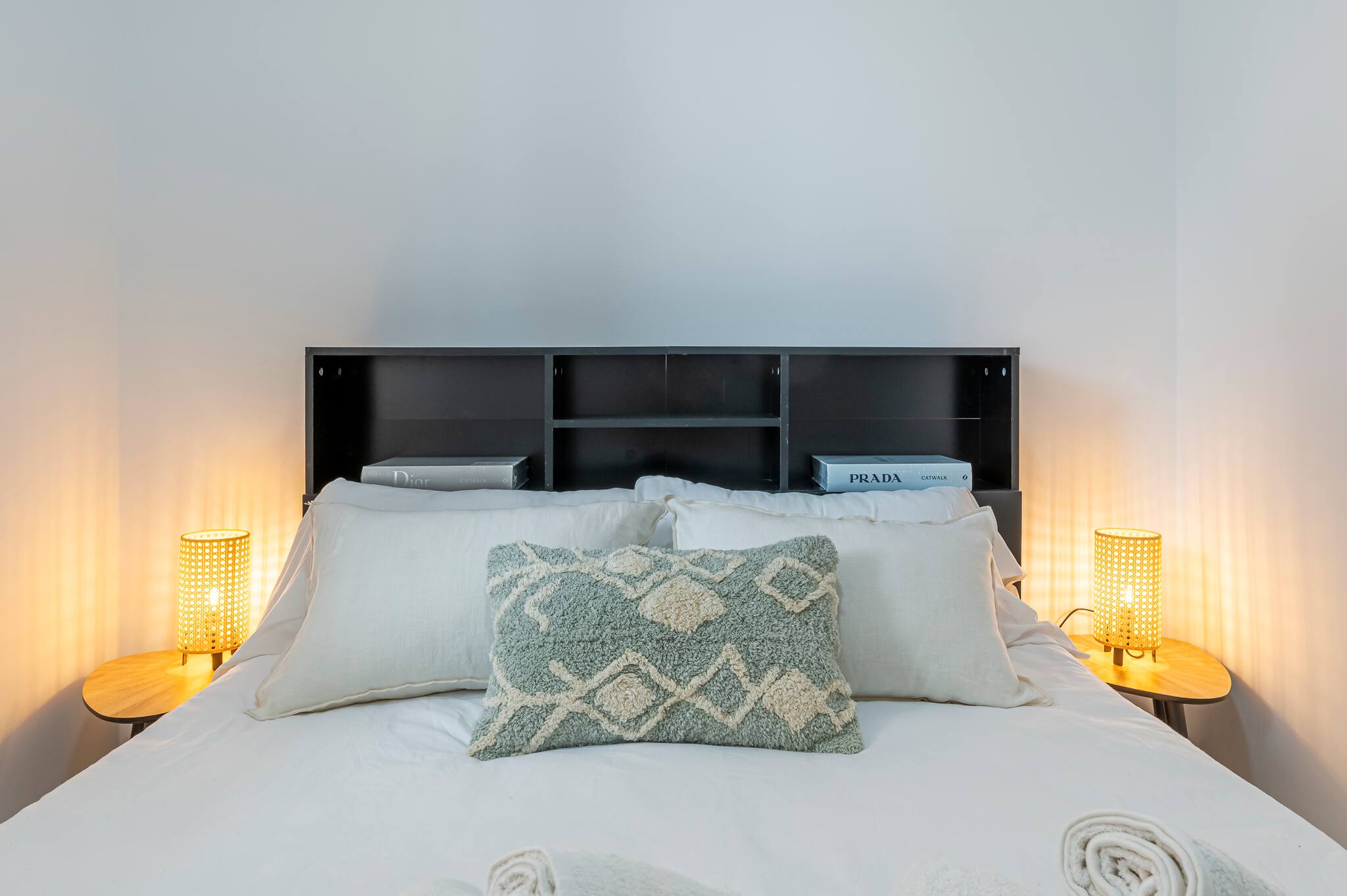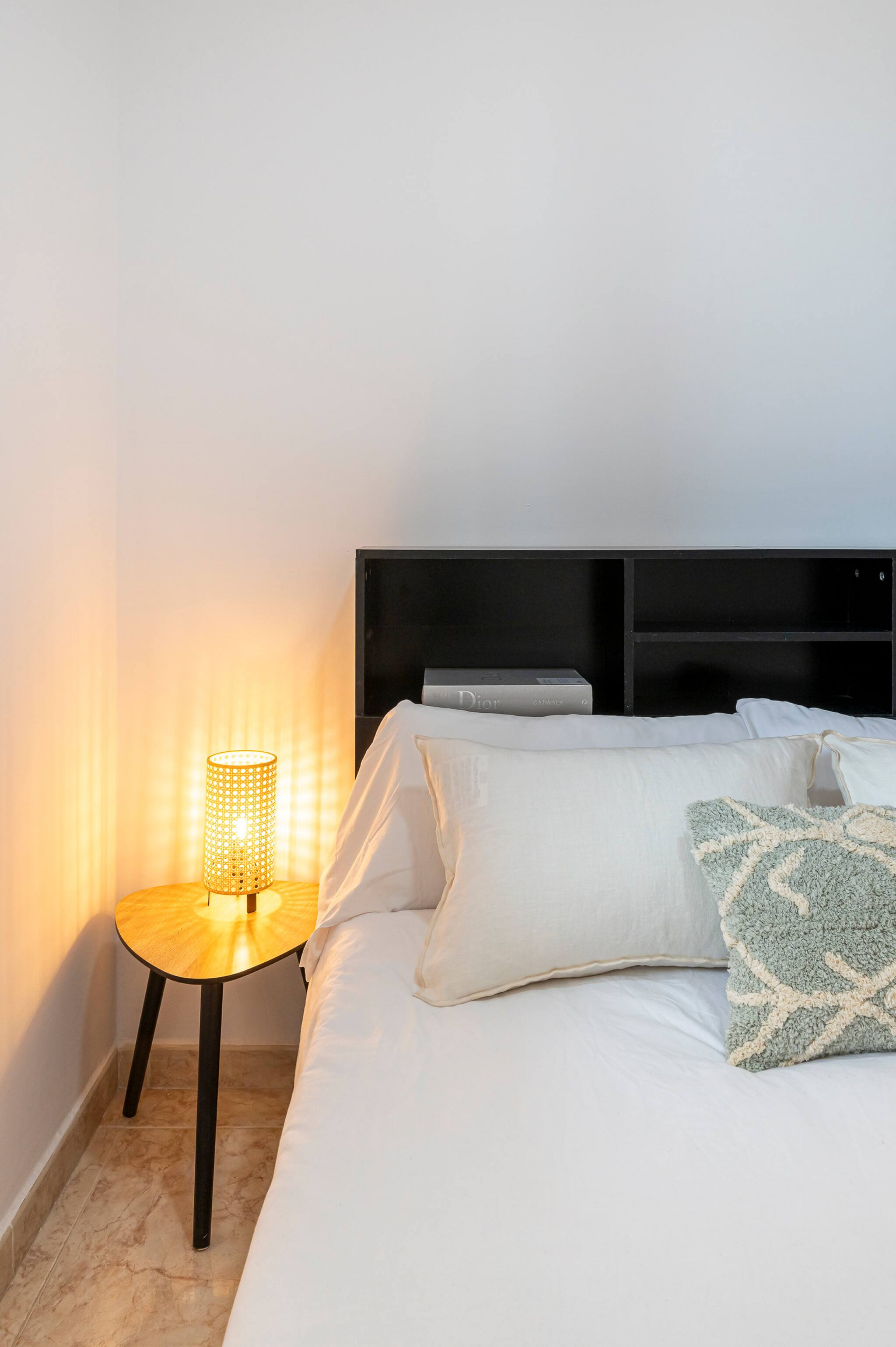>Habitación: Cuenta con una cama doble (135cm), de ambos lados tiene mesas de noche con lámparas, un armario empotrado para desempacar y la ventana de la habitación tiene una persiana para cubrir la luz matutina.