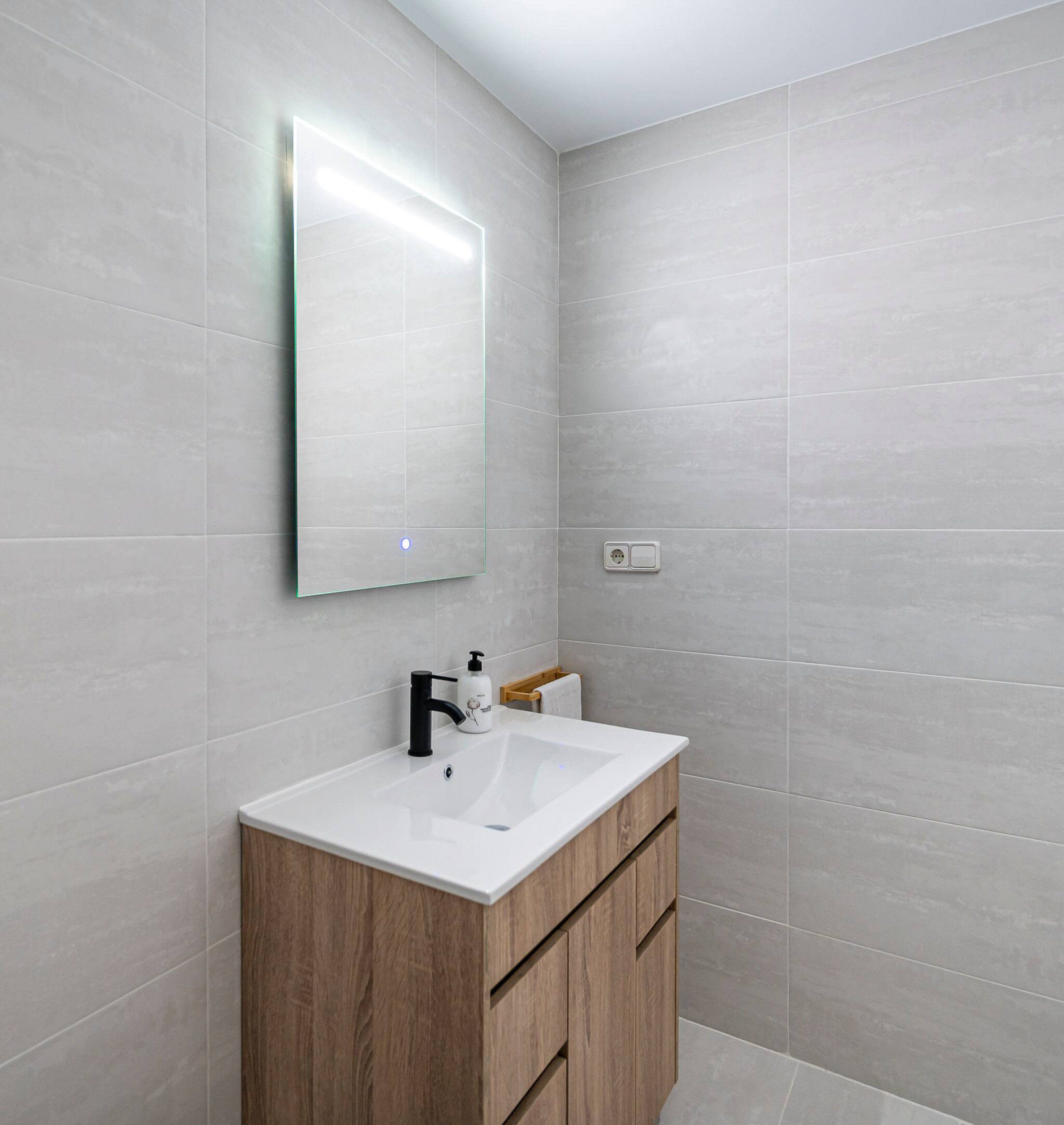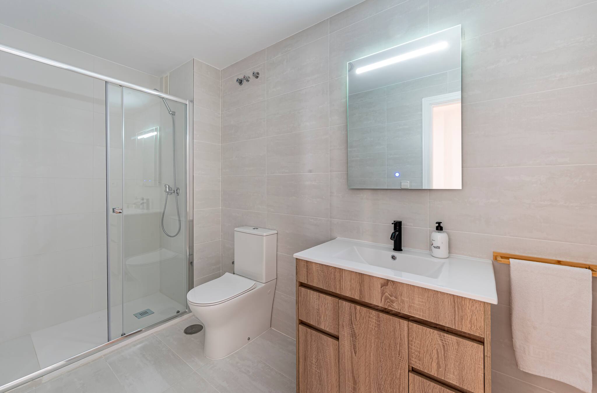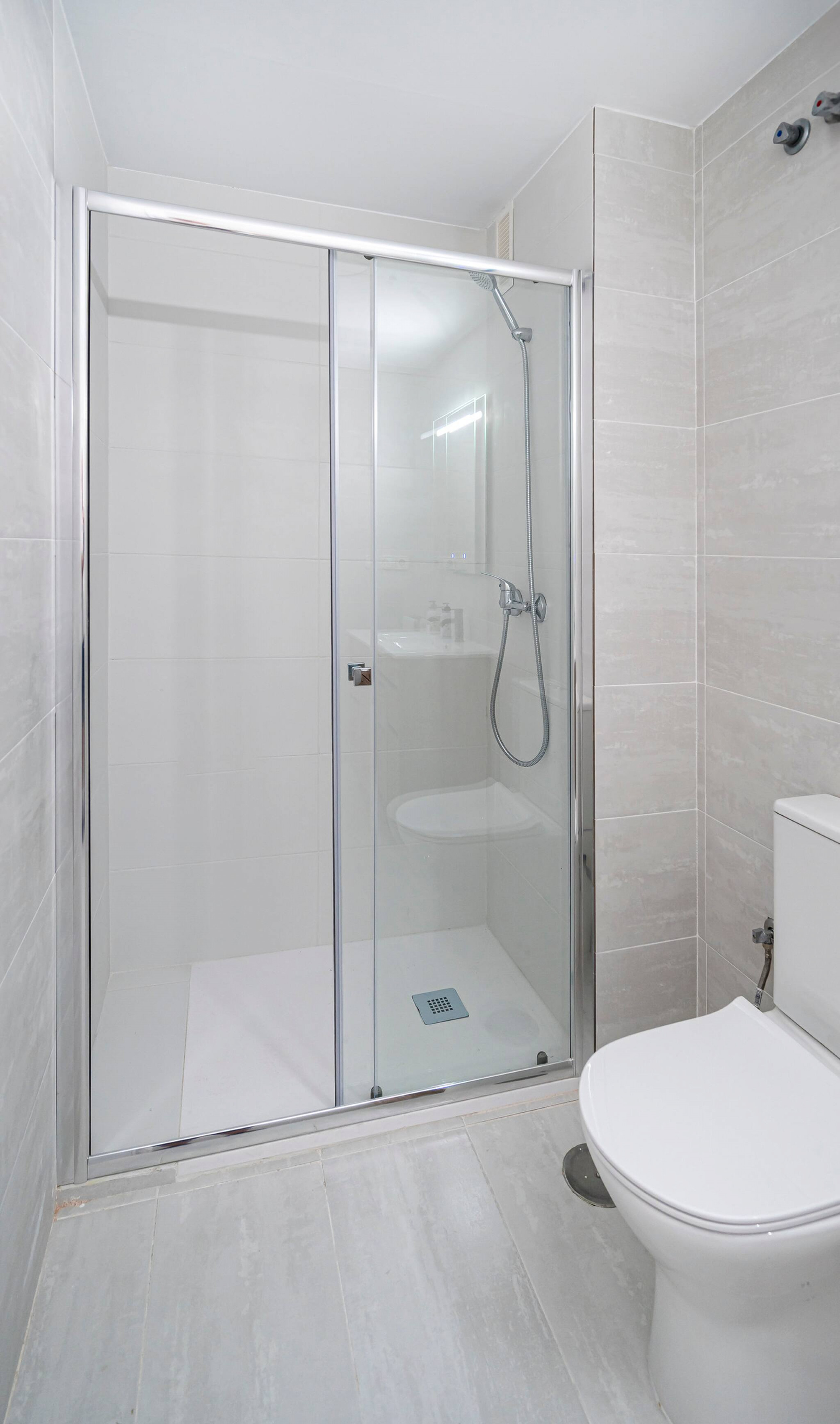 > Baño: En delicados tonos blancos y grises, cuenta con un lavamanos y espejo, inodoro y una ducha con mampara de vidrio corrediza.