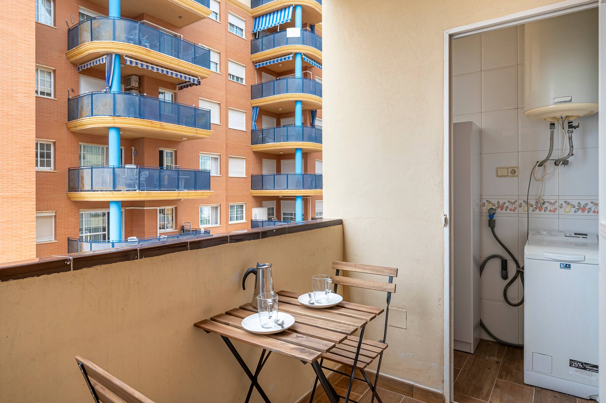 >Terraza: tendréis acceso a una acogedora terraza desde donde se puede apreciar el mar y quizás sentaros a tomar una copa mientras veis la puesta del sol. Aquí encontraréis una mesa con dos sillas, y desde aquí se accede al lavadero donde tenéis una lavadora que podéis utilizar durante vuestra estancia.
