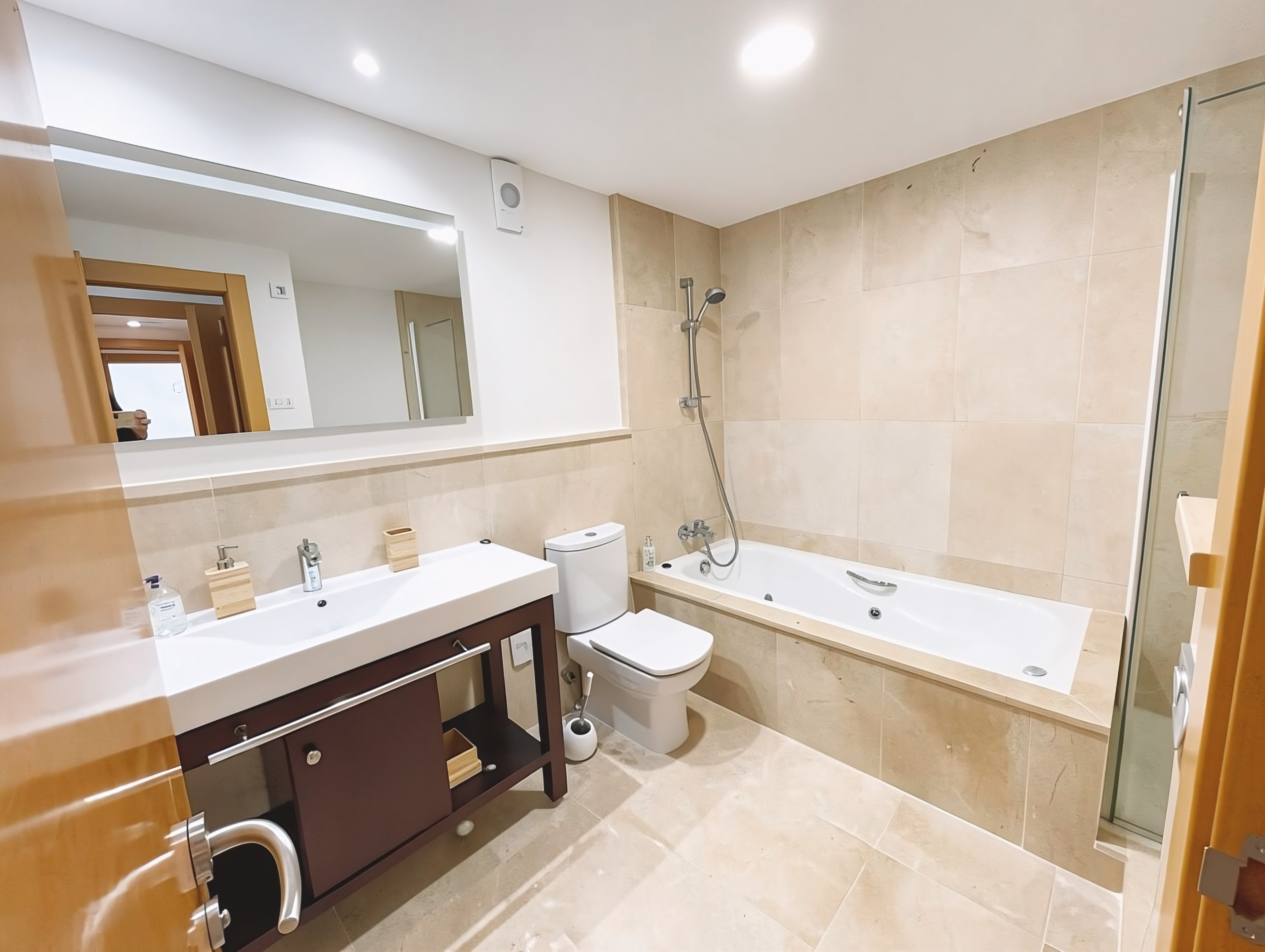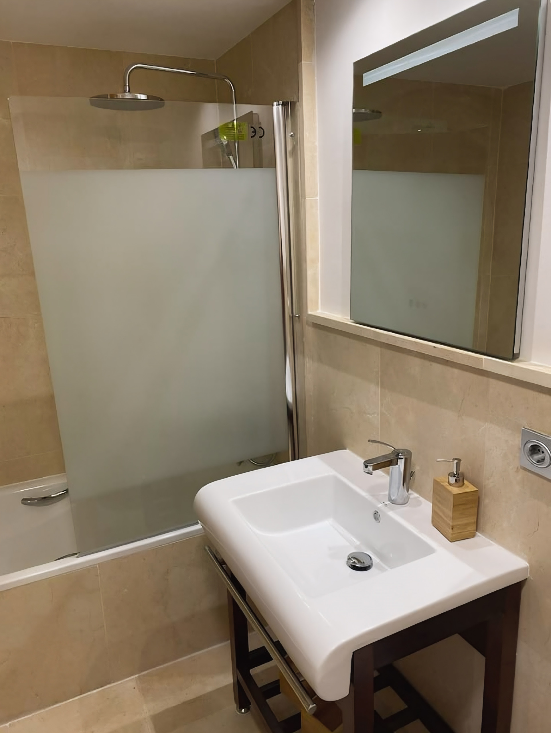 >Baño: El baño es moderno y luminoso, equipado con un amplio lavamanos que incluye espacio de guardado para vuestros artículos de aseo. También cuenta con un gran espejo, perfecto para prepararos antes de salir, un inodoro, y una ducha espaciosa que os brindará un momento de relax al final del día.