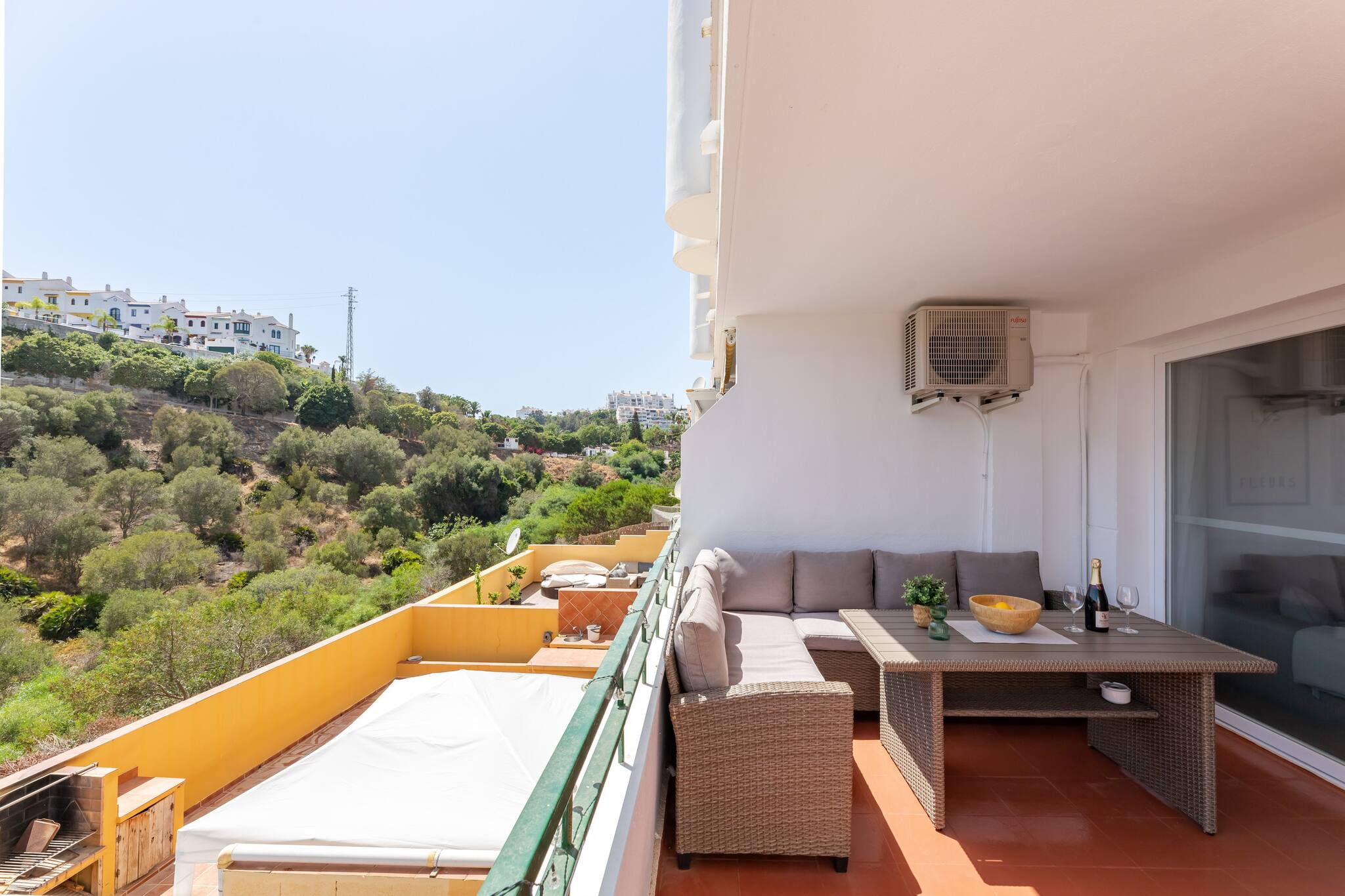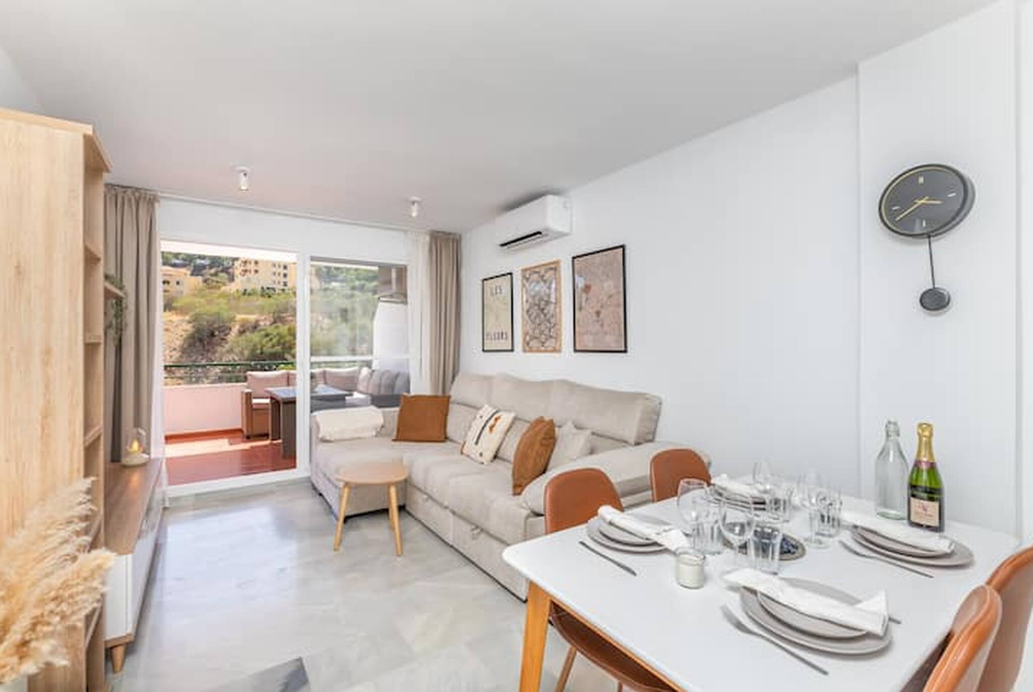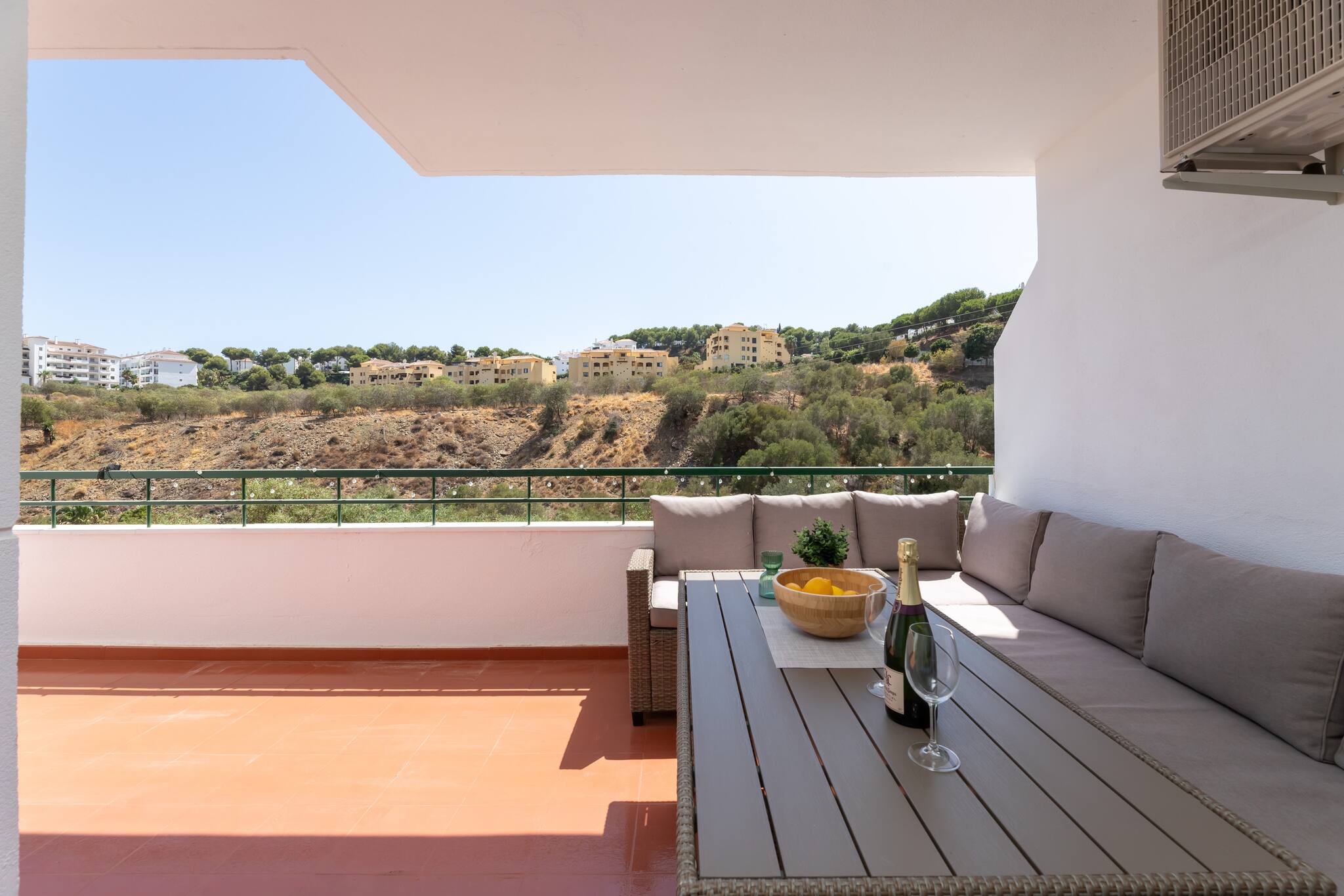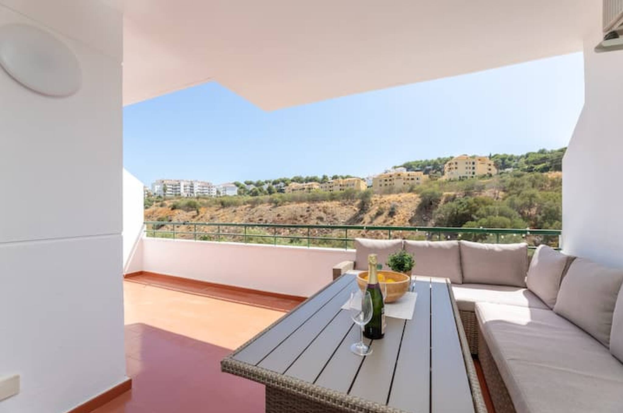 >Balcón: El balcón es un lugar diseñado para ser un rincón de tranquilidad y disfrute al aire libre. Está amueblado con una mesa y con un amplio sofá de exterior, donde podréis relajaros con una bebida, disfrutar de un buen libro, o simplemente contemplar las vistas al entorno que ofrece este espacio. Es el lugar perfecto para empezar la mañana con un café o terminar el día con una cena bajo las estrellas.