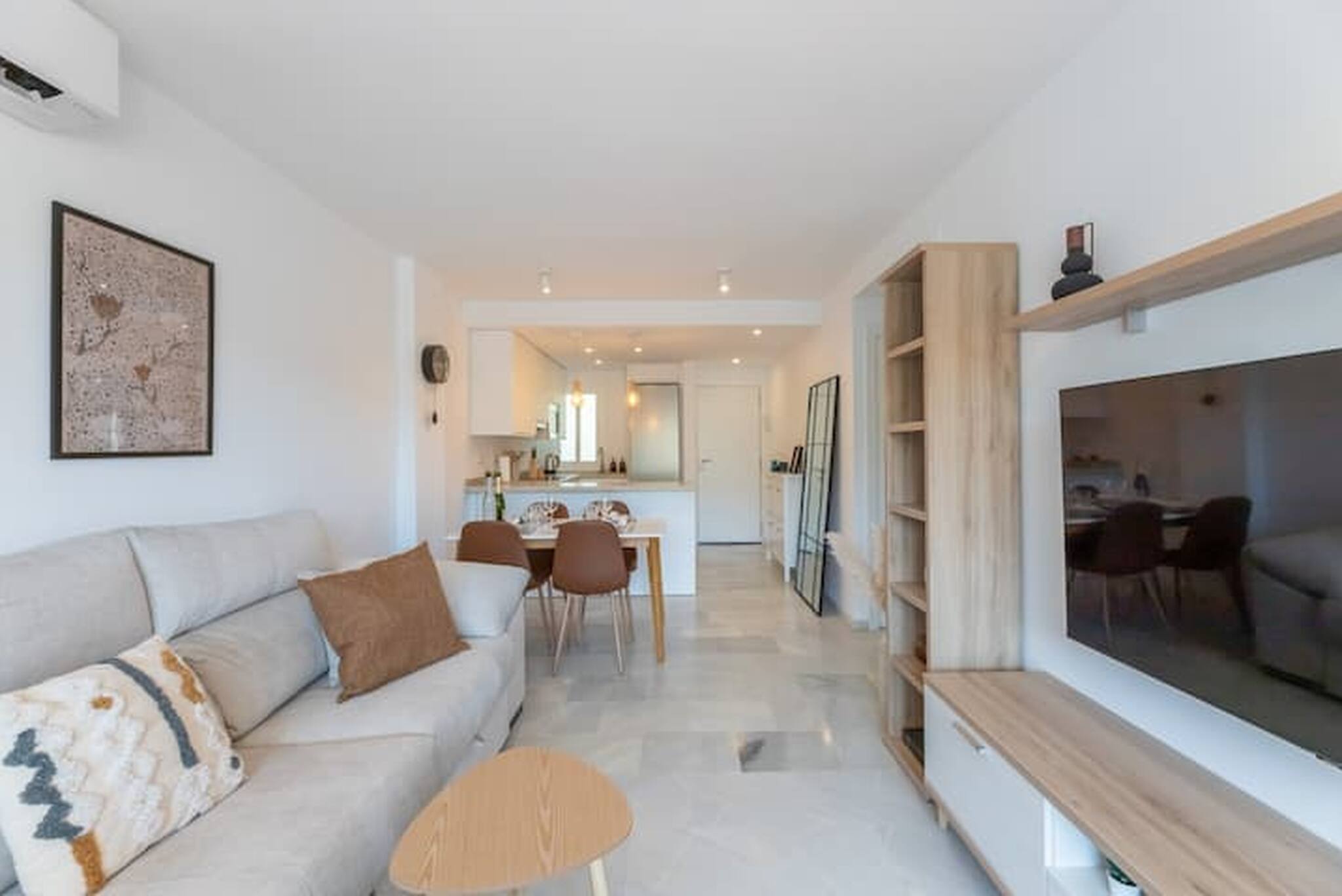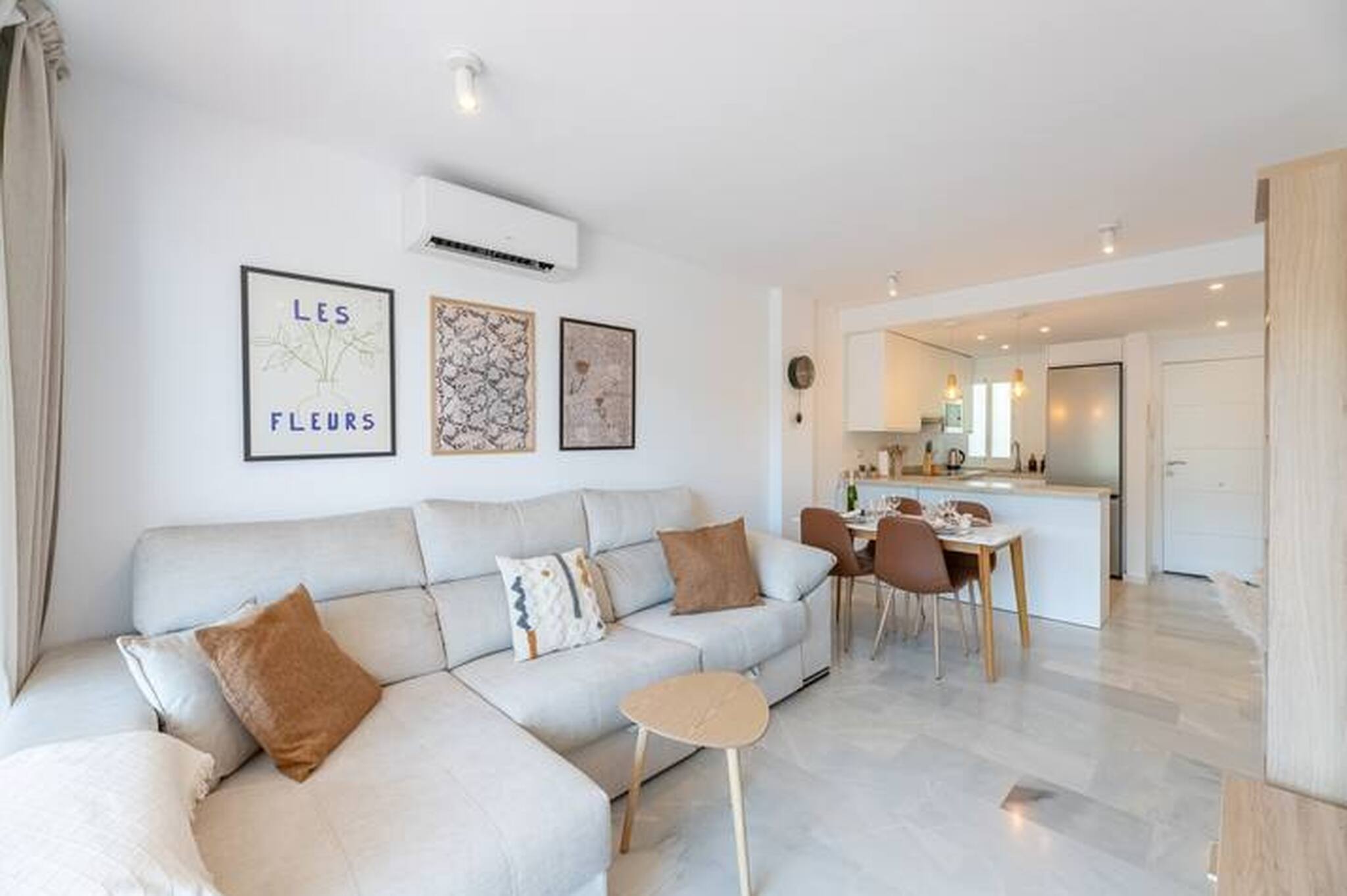>Salón: El salón es un espacio amplio y luminoso, pensado para vuestro confort. Está equipado con aire acondicionado y un amplio sofá en L de tres cuerpos, perfecto para relajaros después de un día explorando la ciudad. La sala de estar también cuenta con una Smart TV, ideal para una noche de cine o para ponerse al día con vuestras series favoritas. Junto a este espacio, también encontraréis una mesa con sillas para 4 comensales. El salón tiene un gran ventanal de cristal que da acceso al balcón, inundando el espacio con luz natural y ofreciendo una vista encantadora.