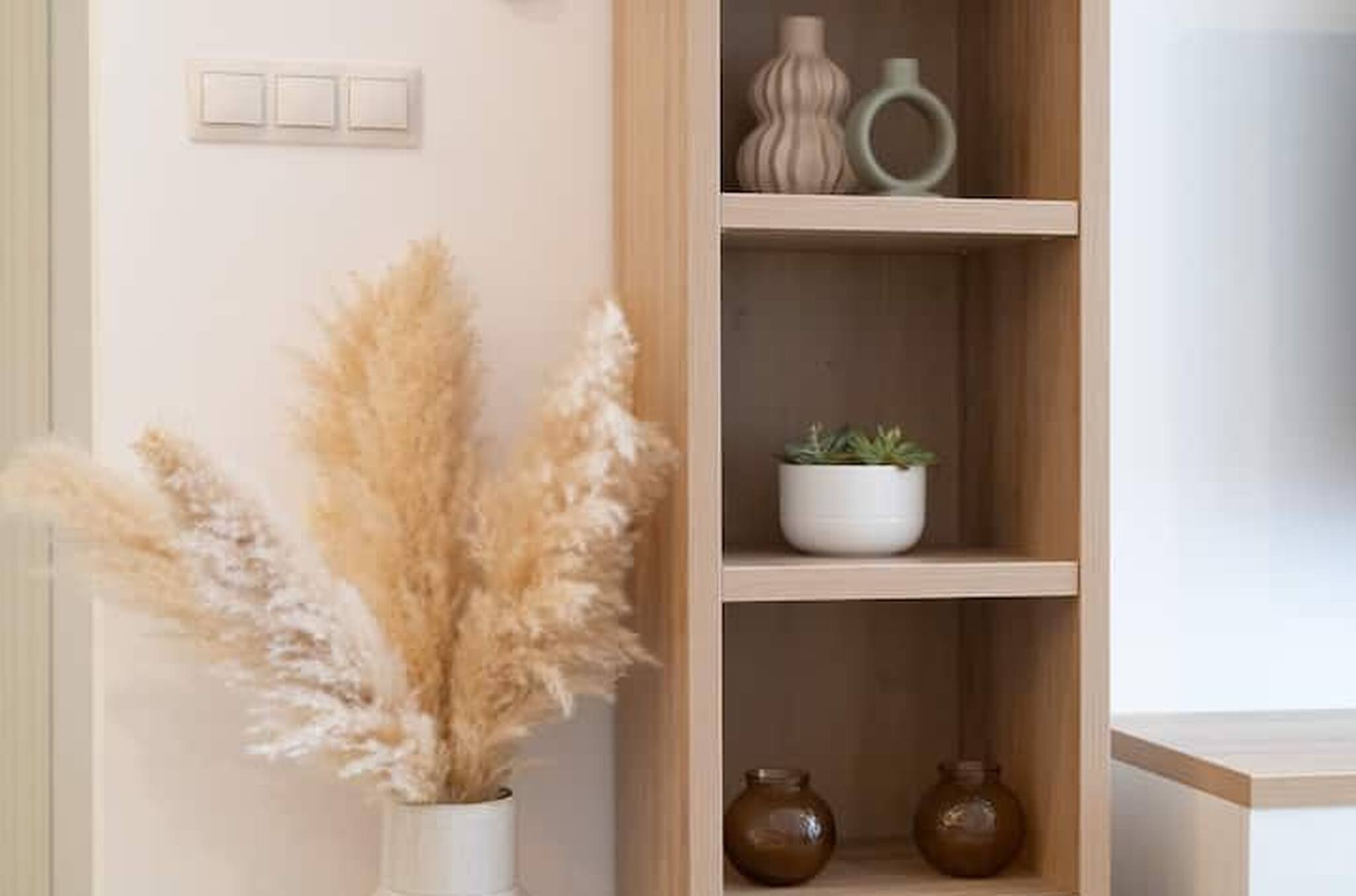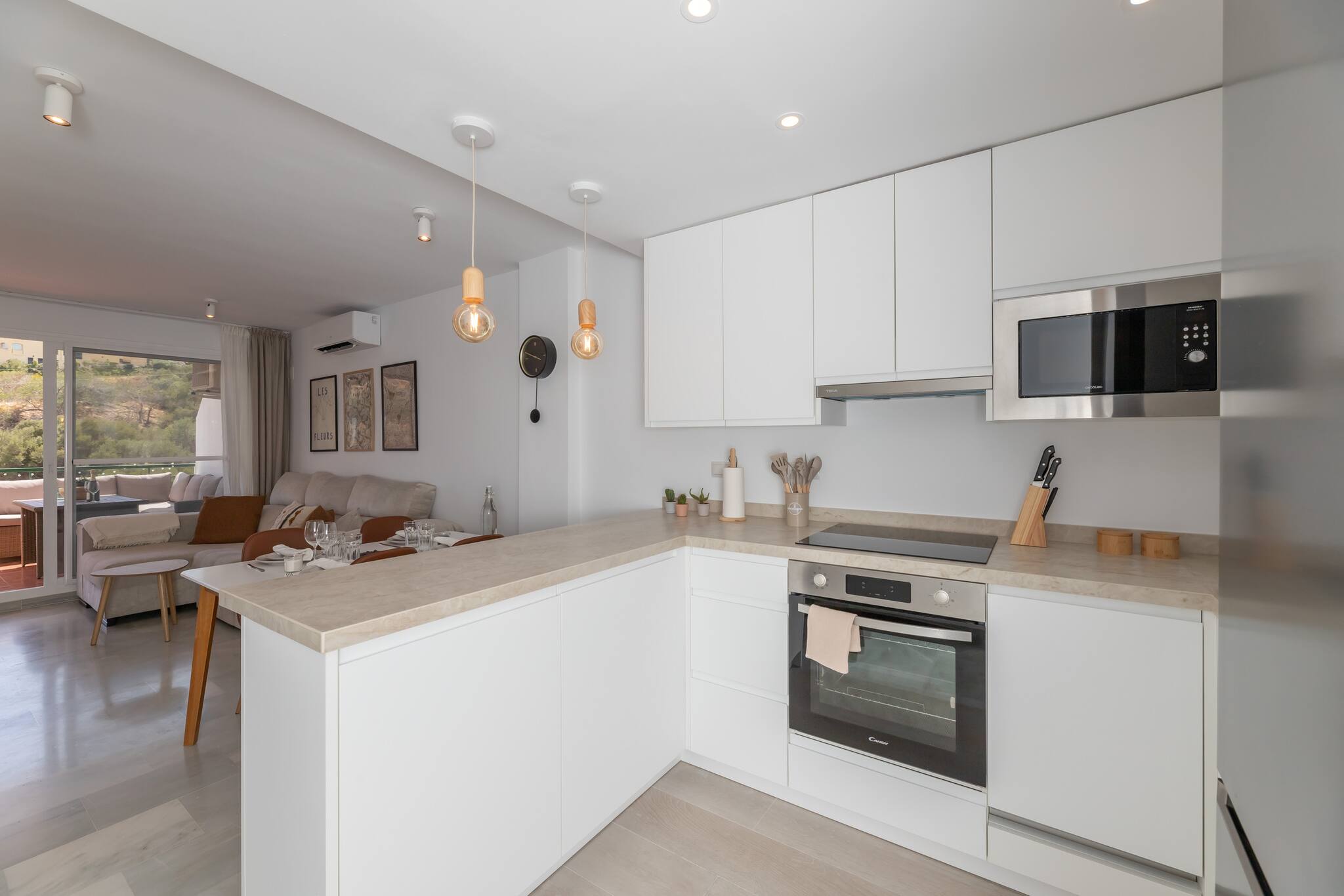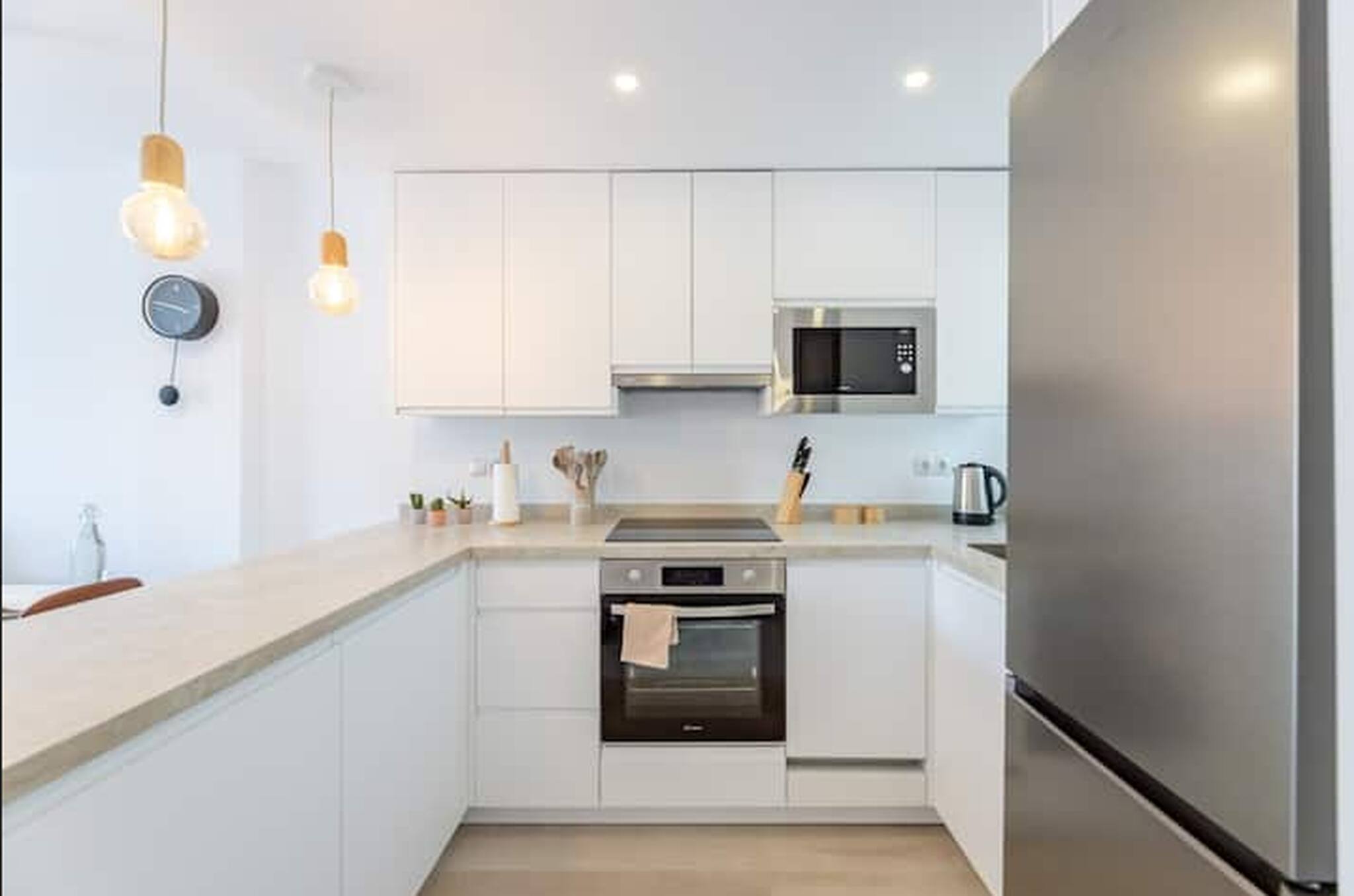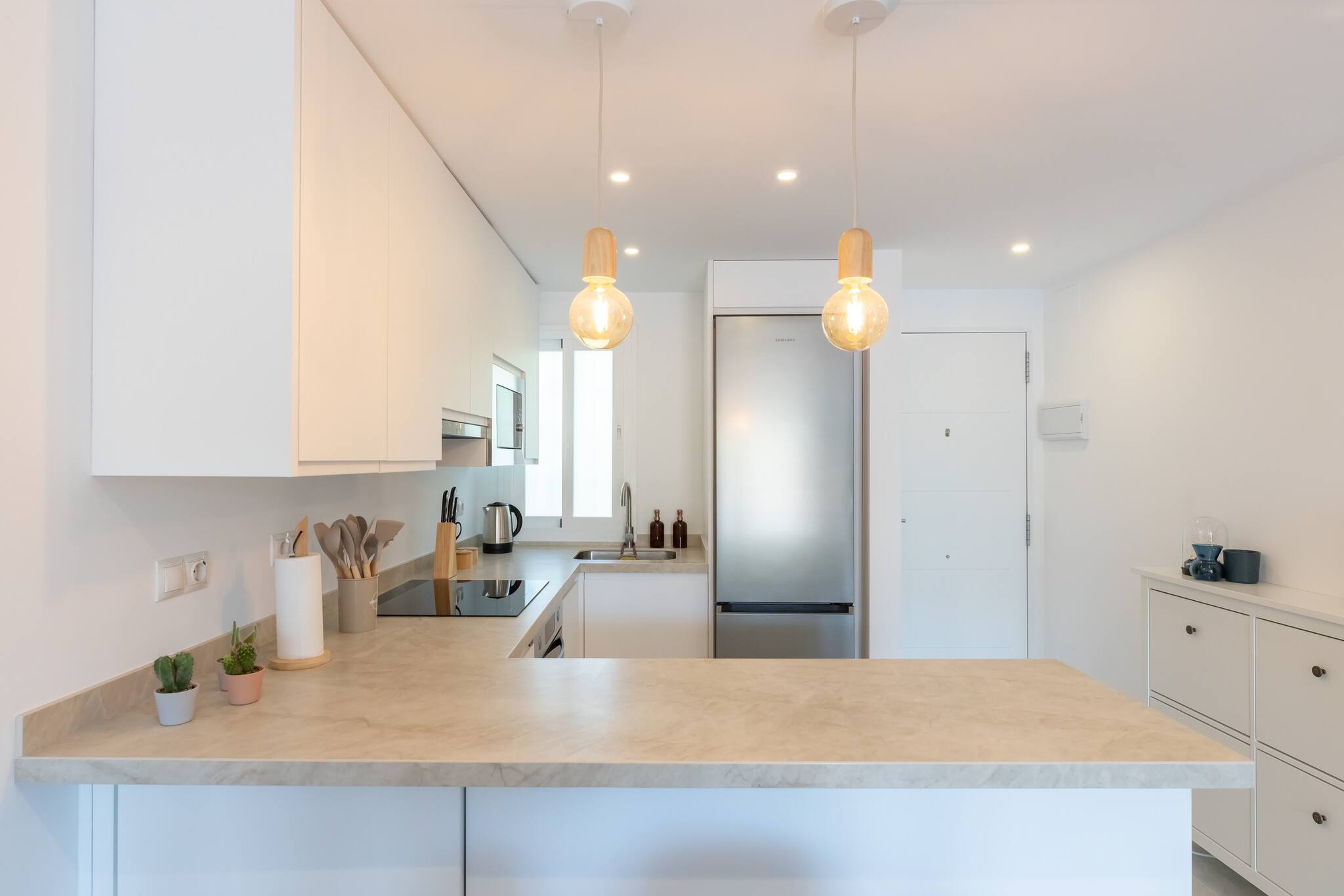 >Cocina: La cocina es moderna y cómoda, separada del salón por una barra que puede servir como espacio adicional para comer o cocinar. Está completamente equipada con todo lo que podríais necesitar: nevera, cafetera, microondas, horno, vitrocerámica, lavavajillas, vajilla completa y amplio espacio de guardado. Aquí podréis preparar vuestras comidas favoritas con facilidad y disfrutar de un desayuno rápido o una cena elaborada.