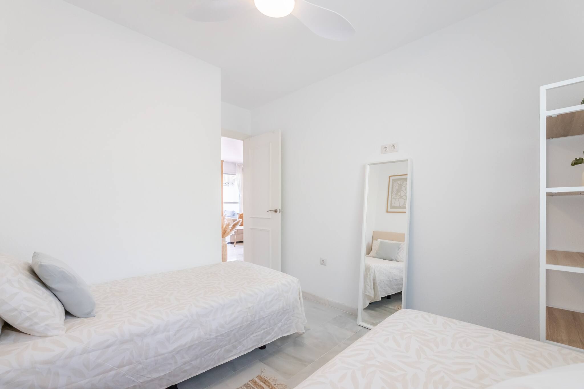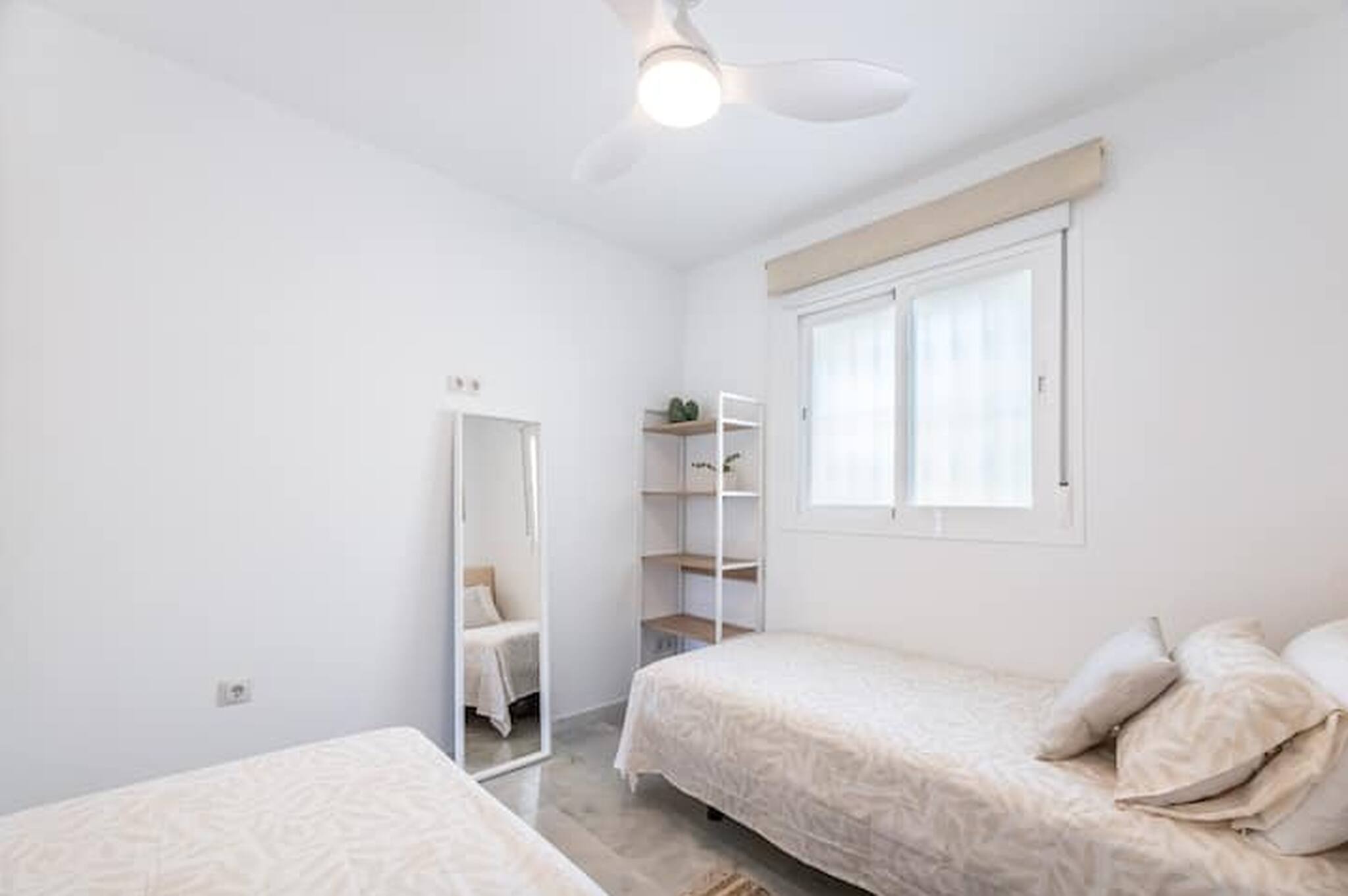 >Habitación secundaria: La habitación secundaria es acogedora y funcional, equipada con dos camas individuales. Esta habitación también tiene un ventilador de techo, lo que asegura una temperatura agradable, una repisa donde podréis acomodar vuestro equipaje, y una ventana que permite la entrada de luz natural.