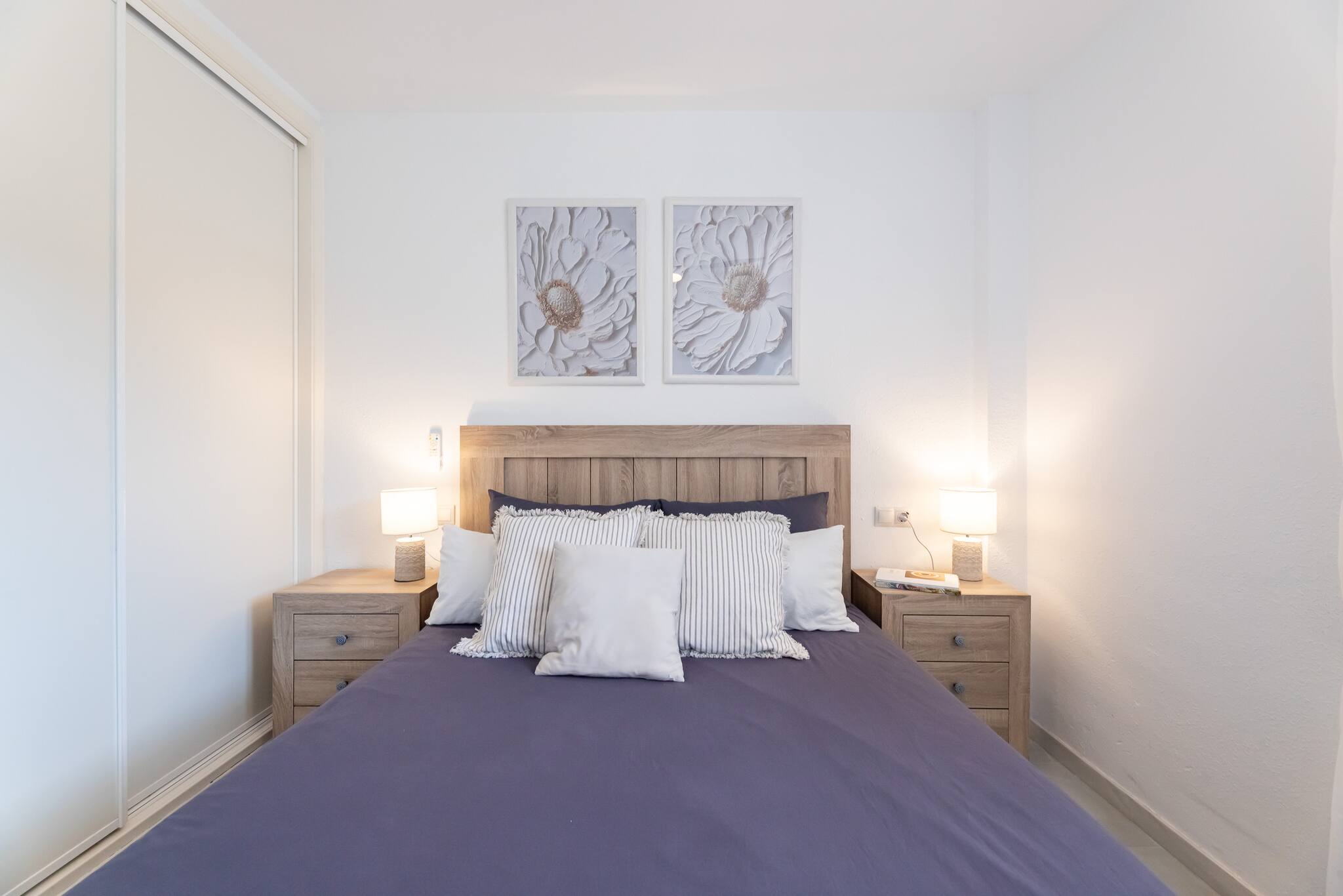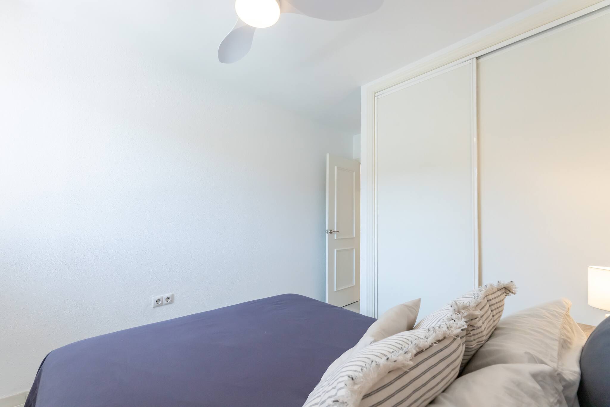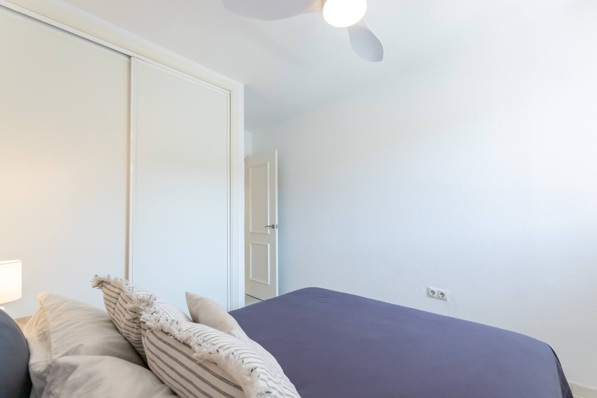 >Habitación principal: El dormitorio principal cuenta con una cama doble que garantiza un descanso reparador. De ambos lados de la cama encontraréis mesas de noche con lámparas, perfectas para leer antes de dormir. El dormitorio también cuenta con un ventilador de techo que mantiene la habitación fresca durante las noches cálidas, un armario espacioso para guardar vuestras pertenencias y una ventana con una vista que invita a relajarse desde el momento en que os despertáis.