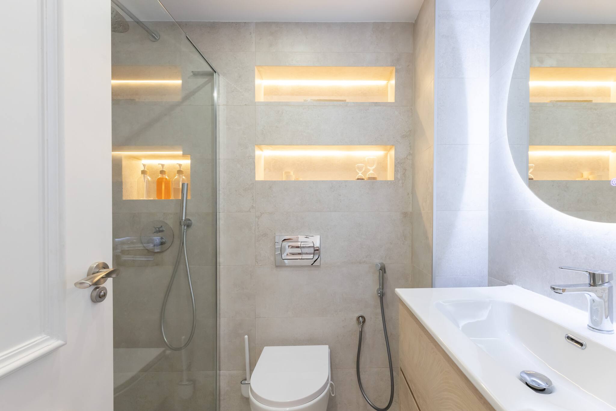 >Baño: El baño es moderno y luminoso, equipado con un amplio lavamanos que incluye espacio de guardado para vuestros artículos de aseo. También cuenta con un gran espejo, perfecto para prepararos antes de salir, un inodoro, y una ducha espaciosa que os brindará un momento de relax al final del día.