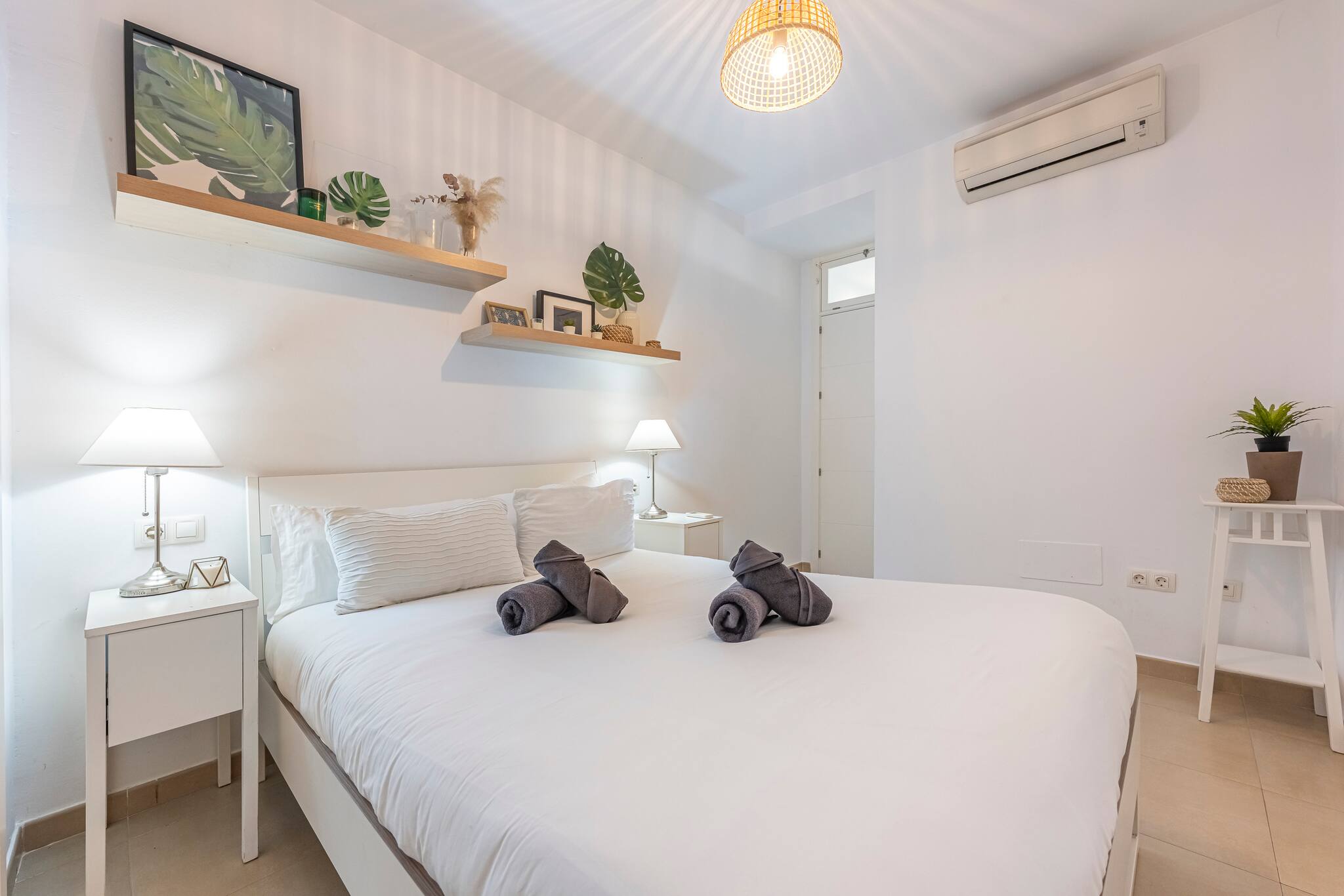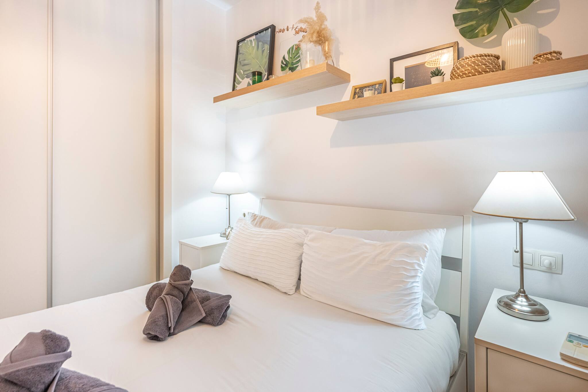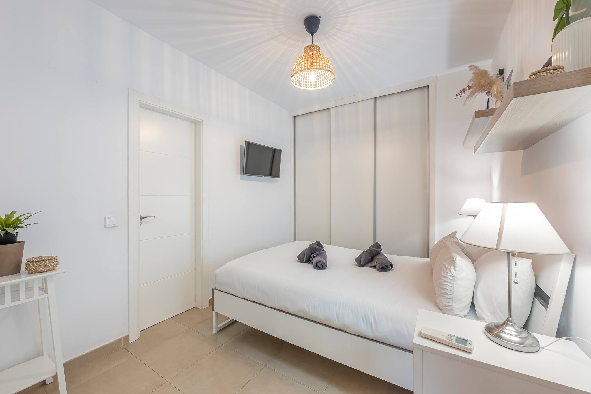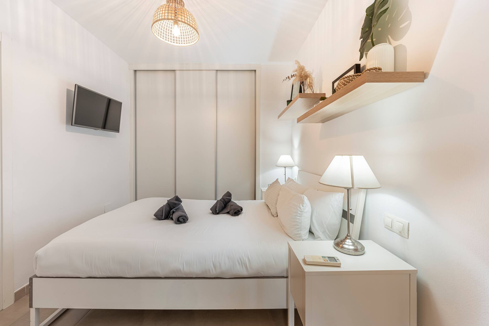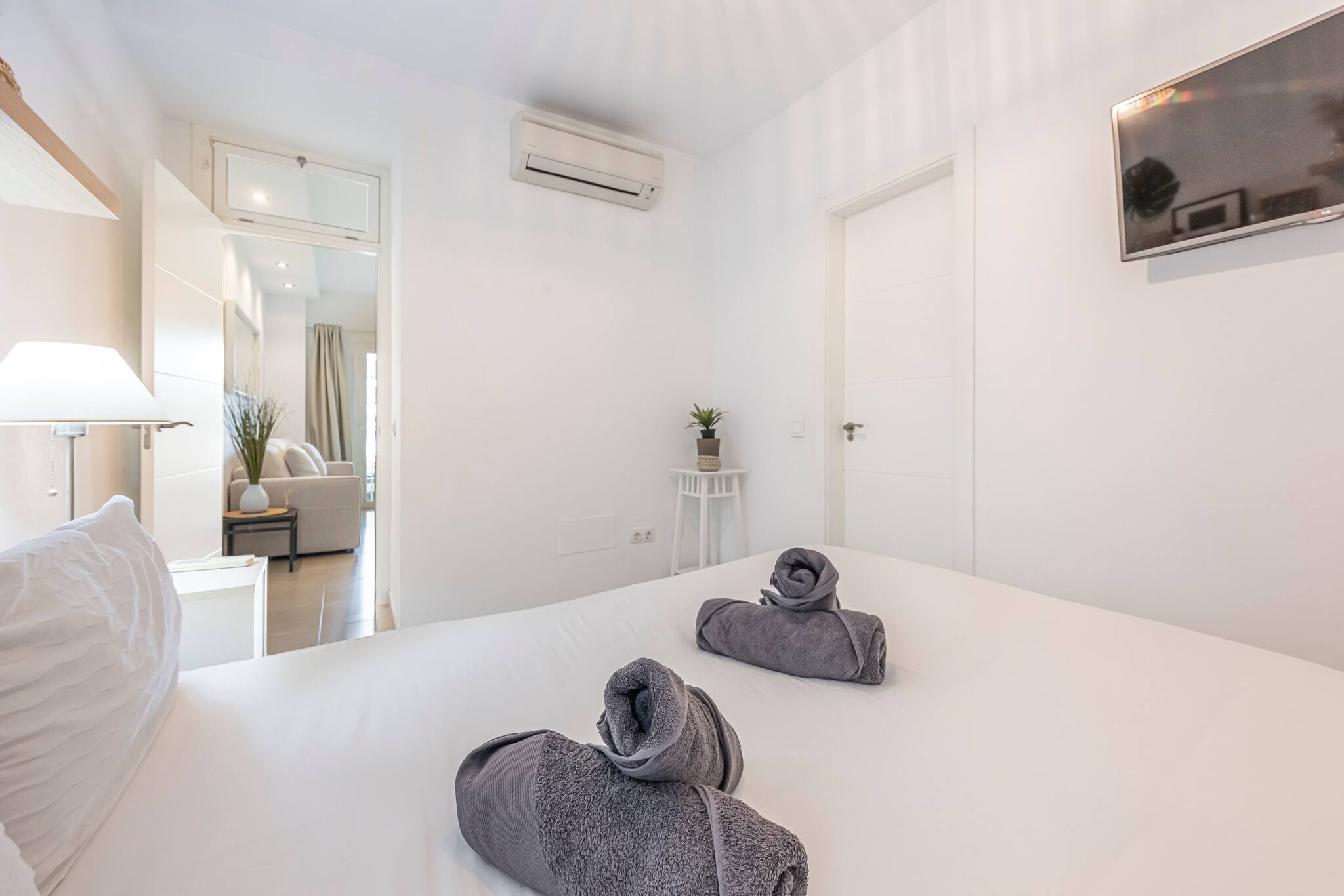 El salón cuenta con aire acondicionado y calefacción, un cómodo sofá cama y un Smart TV. Además, encontrarás una cama doble para alojar a dos huéspedes, con un armario de cinco puertas totalmente equipado para guardar toda la ropa y un escritorio donde podrás trabajar mientras disfrutas de las vistas a través de la luminosa ventana.