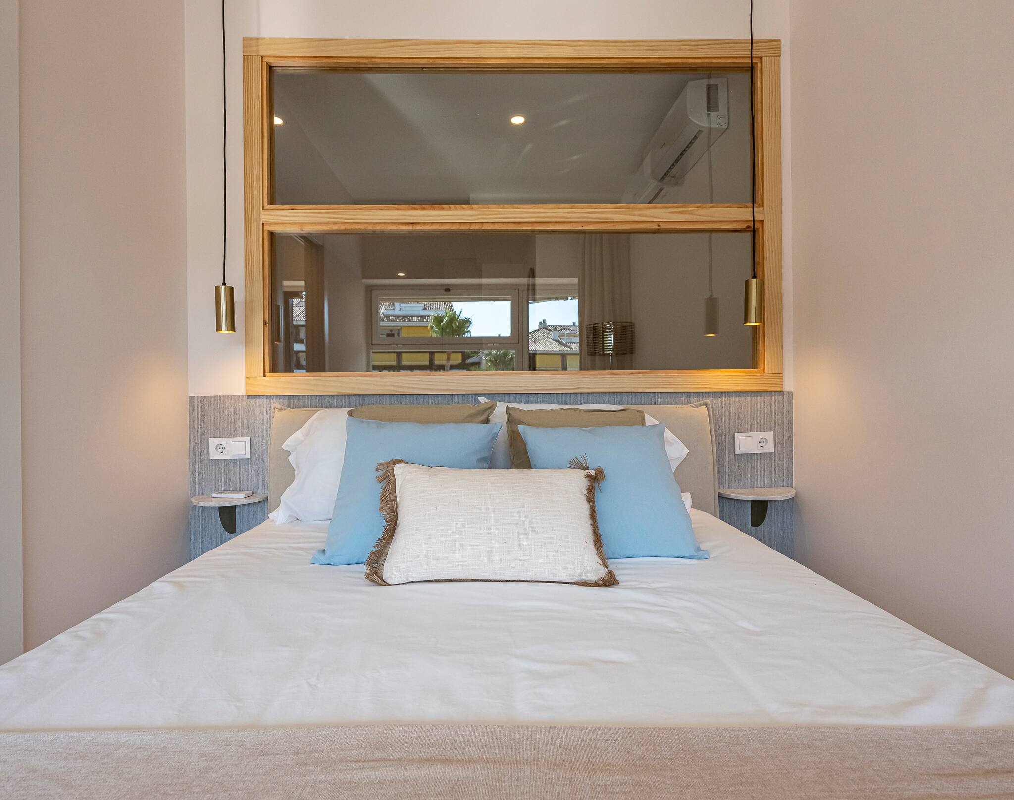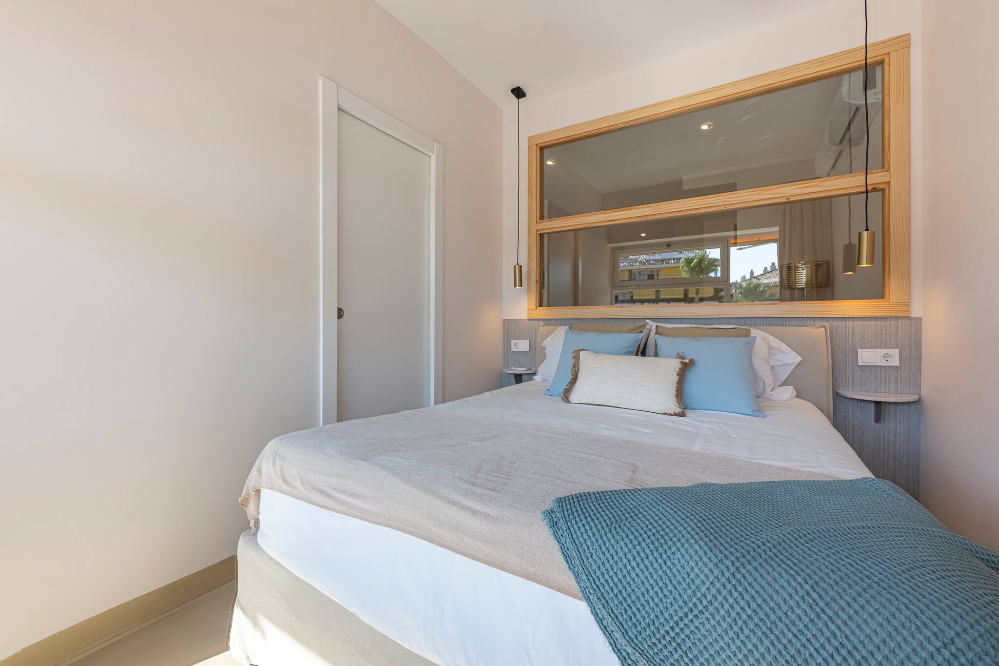 >Dormitorio: El apartamento cuenta con un dormitorio principal con cama doble, decorado con buen gusto y pensado para garantizar un descanso reparador. La habitación incluye mesitas de noche con lámparas y una buena entrada de luz natural, creando un ambiente agradable y tranquilo, con vistas a las zonas ajardinadas, ideal para descansar rodeado de tranquilidad. Aire acondicionado con función frío/calor para tu confort durante todo el año.