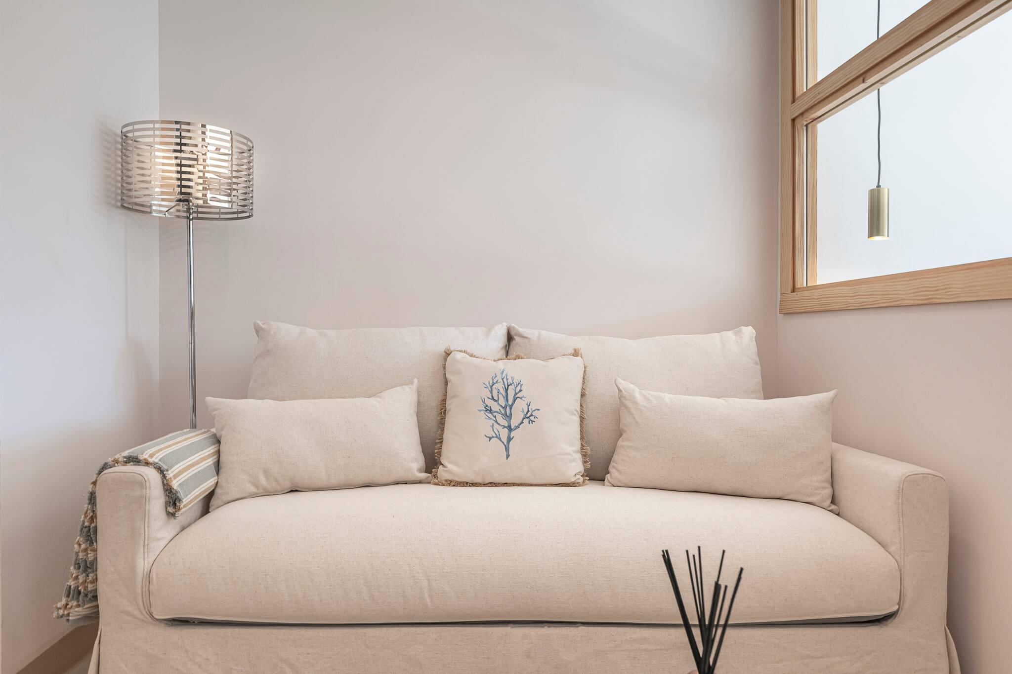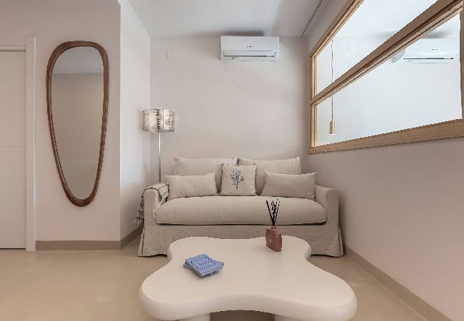 >Salón: El salón es un espacio luminoso y acogedor, perfecto para compartir momentos relajantes o descansar tras un día de playa. Dispone de un cómodo sofá cama de dos cuerpos situado frente a una mesa de centro y al televisor, creando una zona ideal para el relax. Junto al salón está ubicada la entrada con un recibidor funcional y armario empotrado de gran capacidad. El salón está equipado con aire acondicionado con función frío/calor para tu confort durante todo el año.