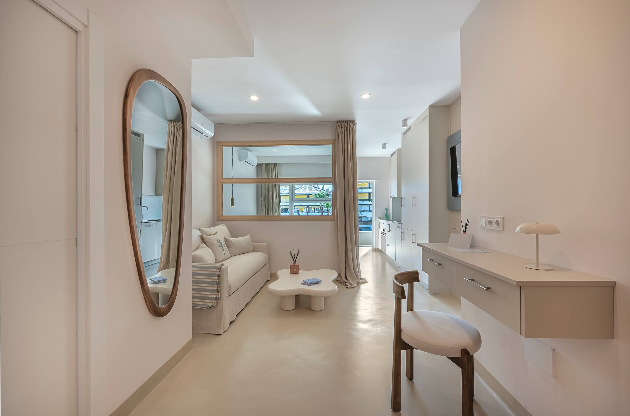 El salón cuenta con aire acondicionado y calefacción, un cómodo sofá cama y un Smart TV. Además, encontrarás una cama doble para alojar a dos huéspedes, con un armario de cinco puertas totalmente equipado para guardar toda la ropa y un escritorio donde podrás trabajar mientras disfrutas de las vistas a través de la luminosa ventana.