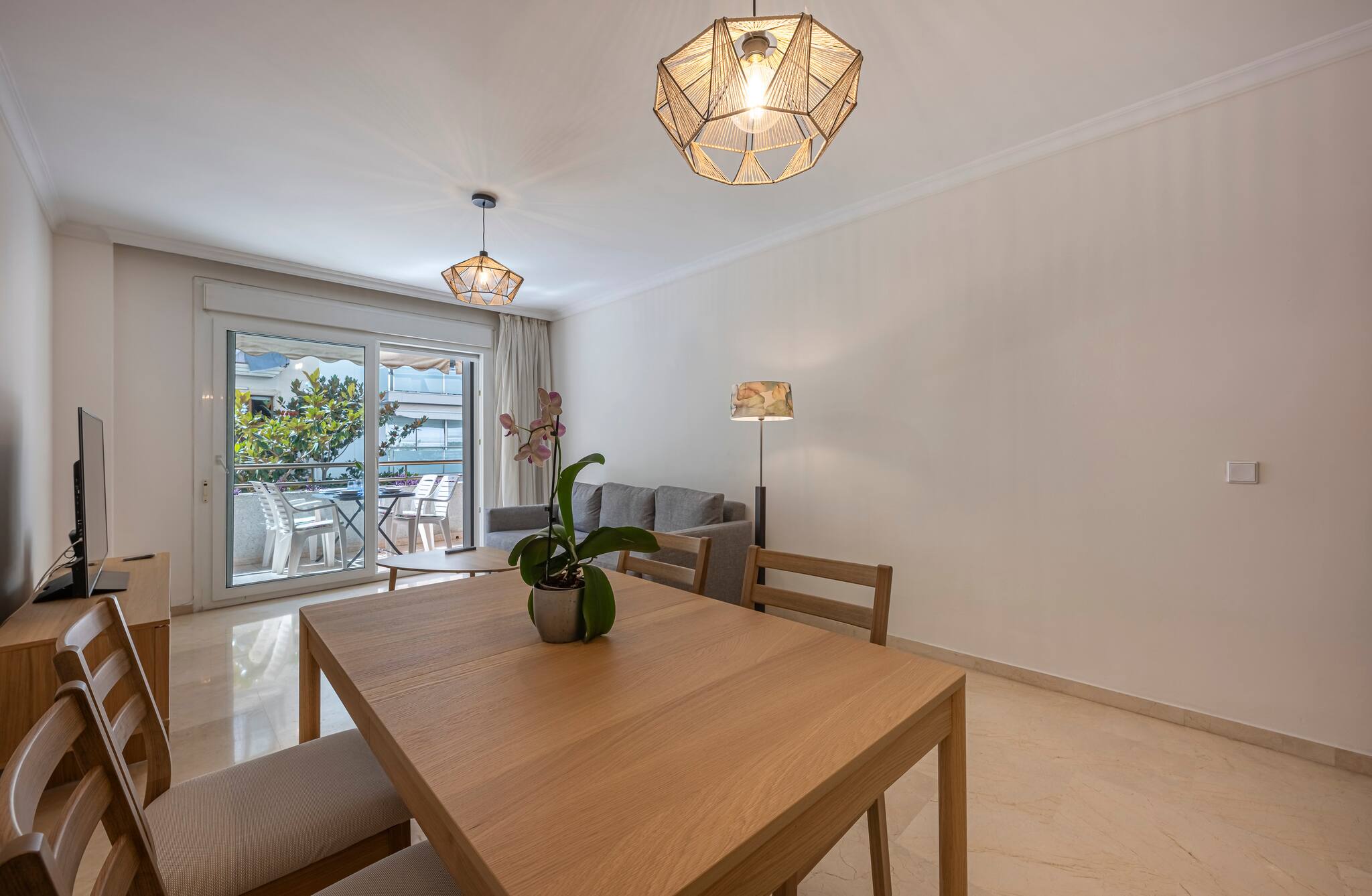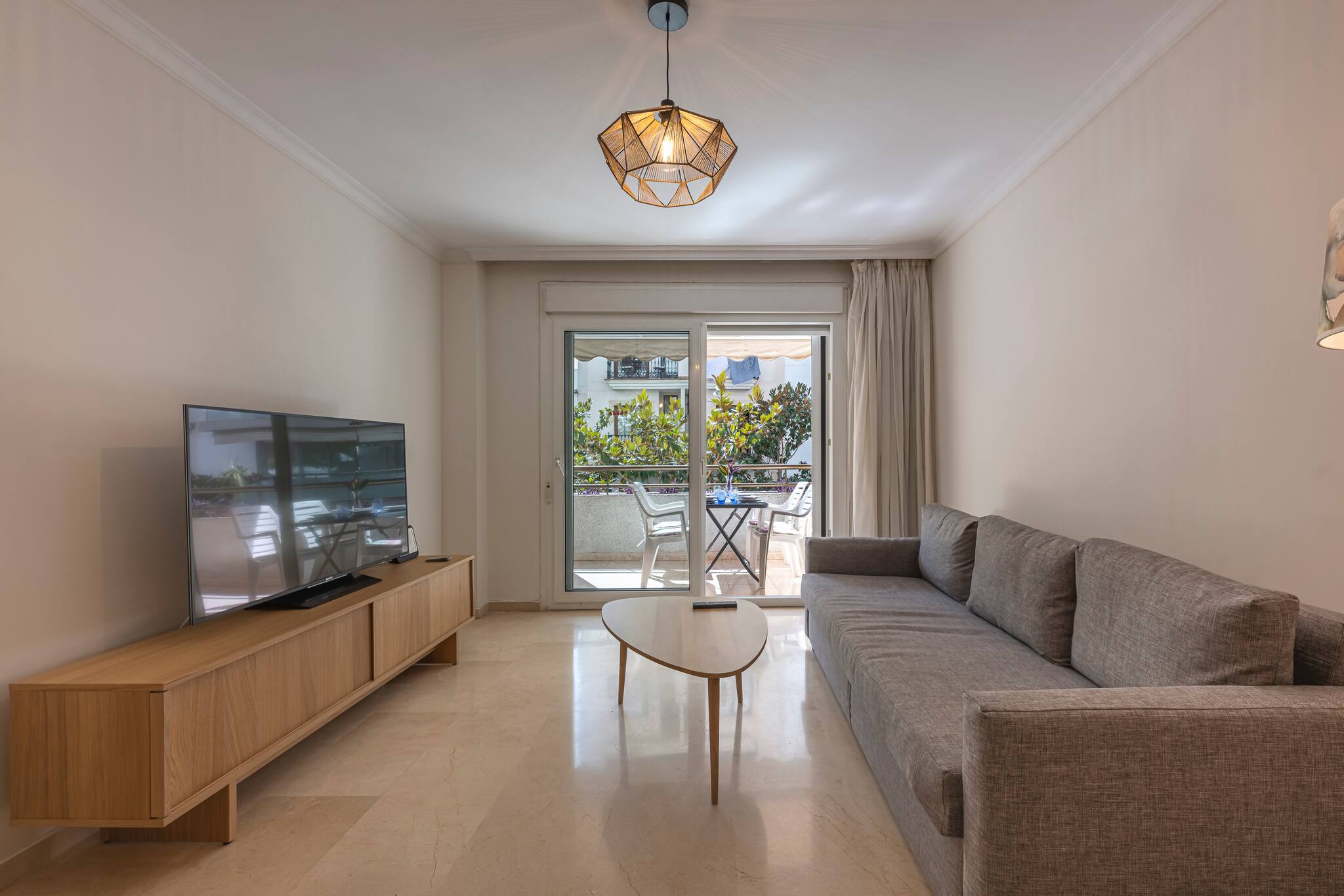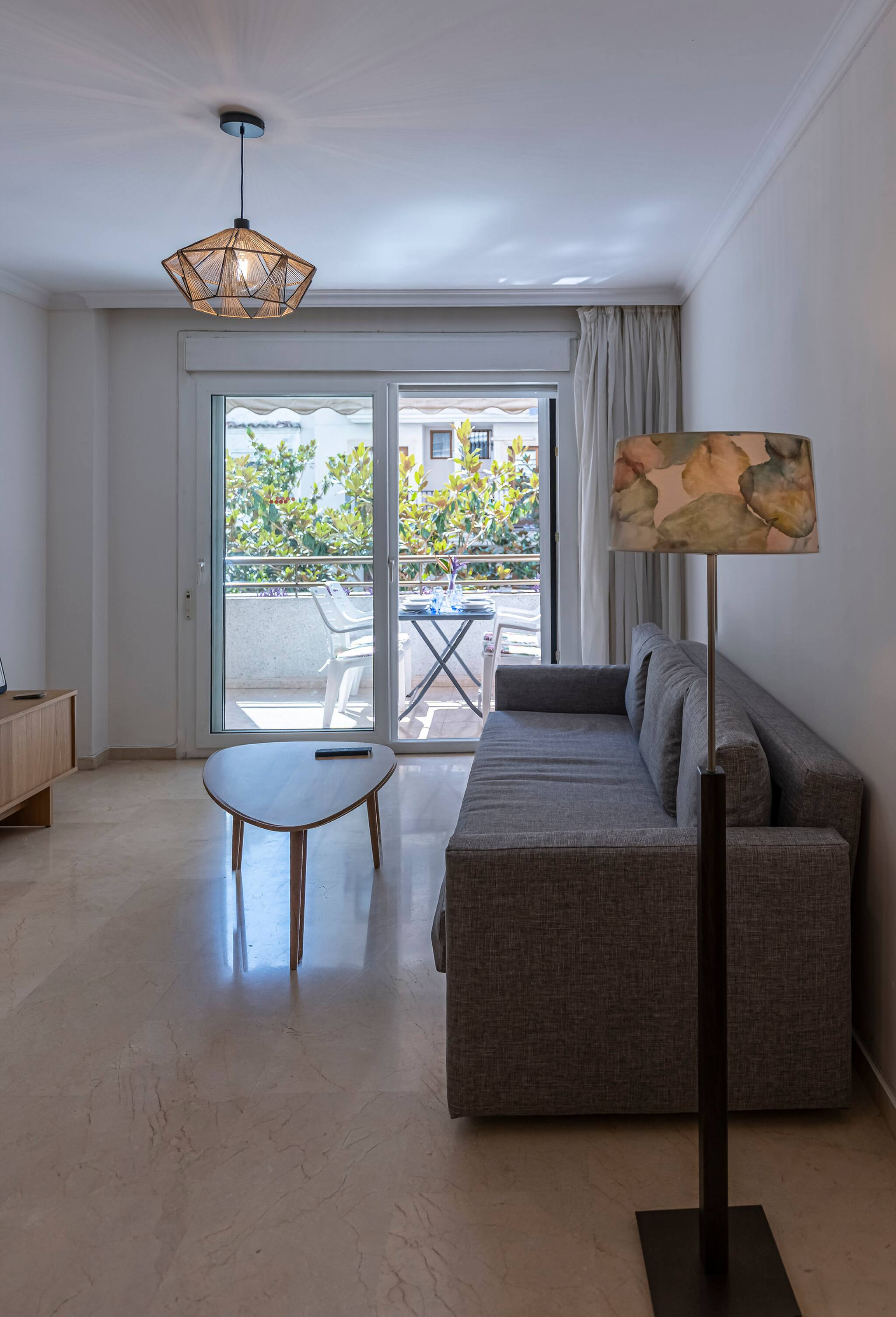 >Sala de Estar: Relajaros en la sala de estar totalmente climatizada con aire acondicionado central., que cuenta con un cómodo sofá, una mesa de centro y una Smart TV para vuestro entretenimiento. El espacio está bañado en luz natural gracias a la gran ventana de vidrio que da acceso a una hermosa terraza. Disfruta de las comidas al aire libre en la mesa con sillas para 4 personas.