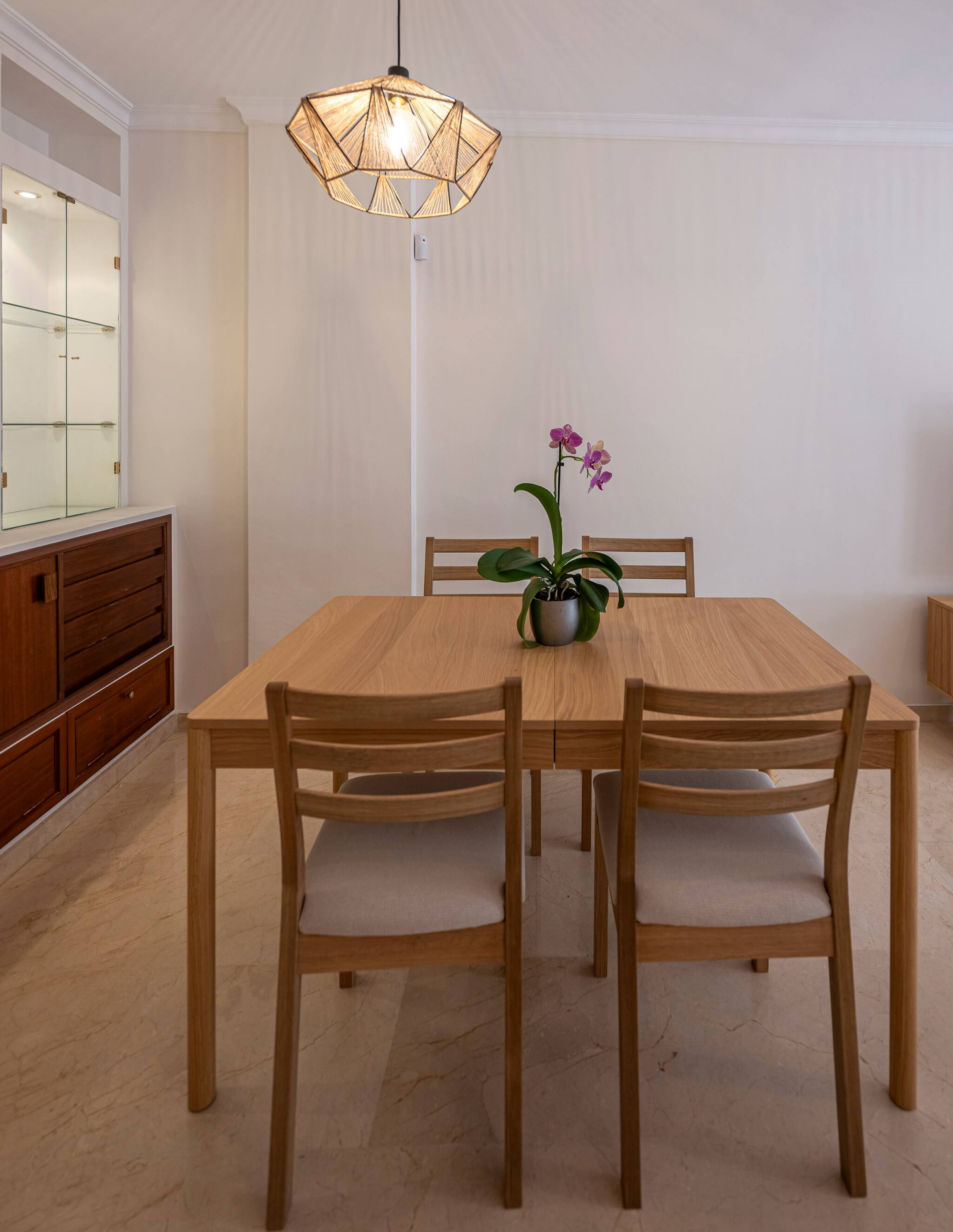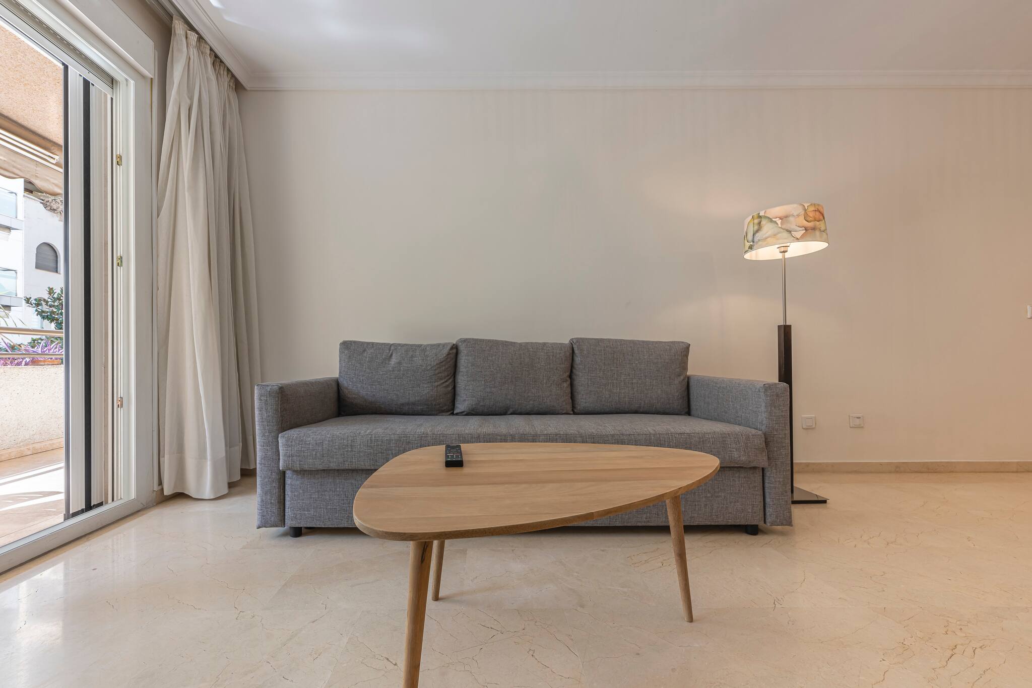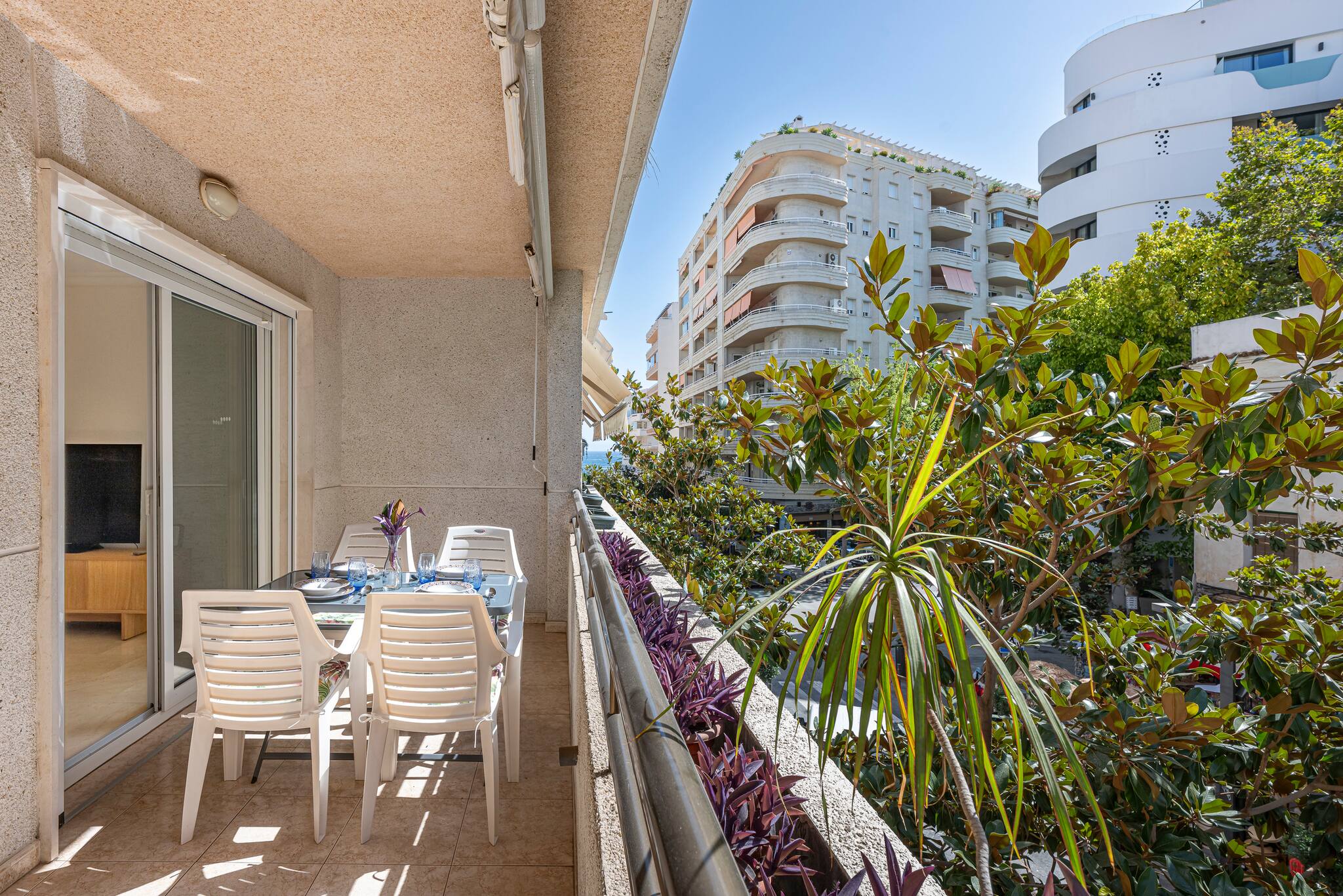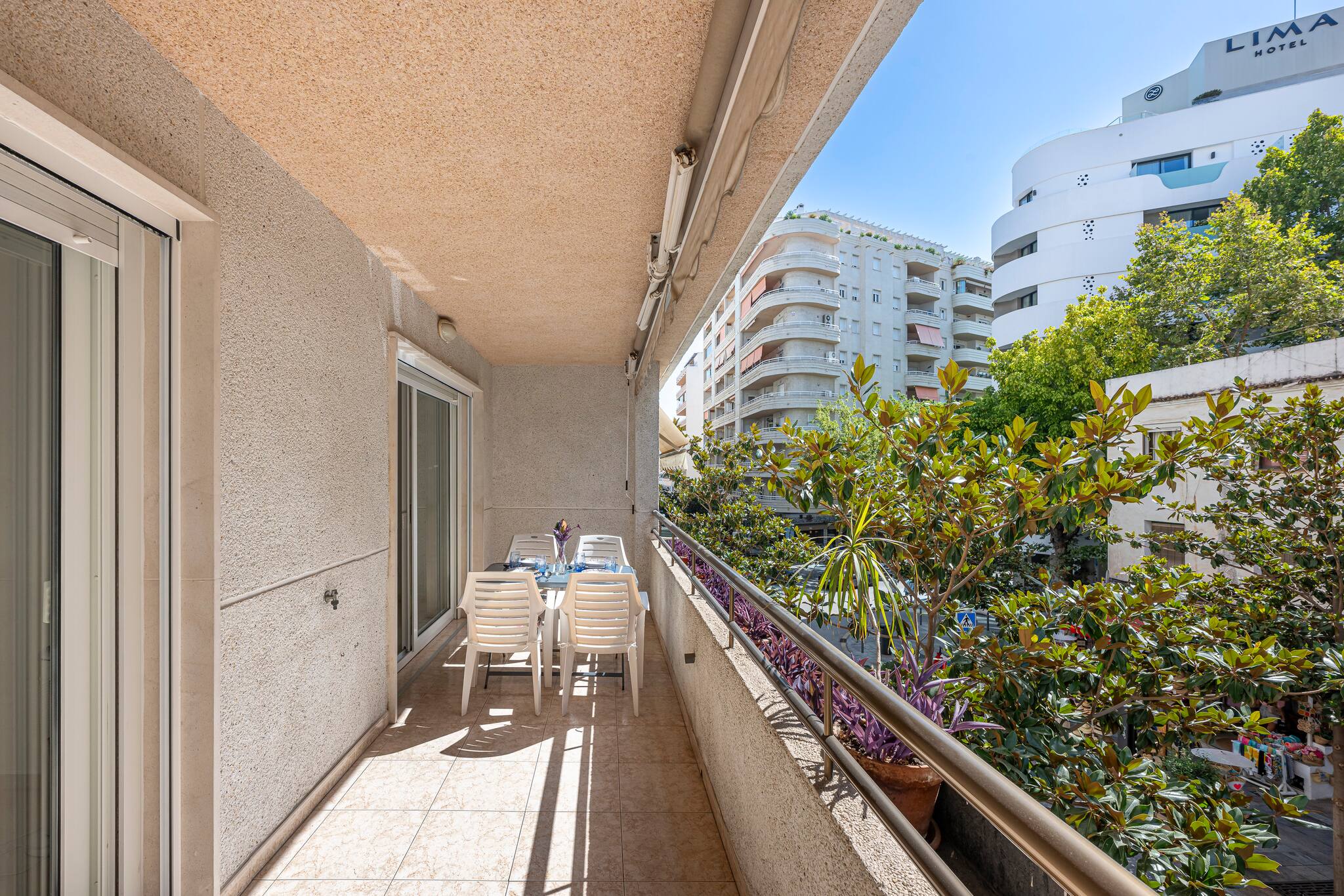 >Sala de Estar: Relajaros en la sala de estar totalmente climatizada con aire acondicionado central., que cuenta con un cómodo sofá, una mesa de centro y una Smart TV para vuestro entretenimiento. El espacio está bañado en luz natural gracias a la gran ventana de vidrio que da acceso a una hermosa terraza. Disfruta de las comidas al aire libre en la mesa con sillas para 4 personas.