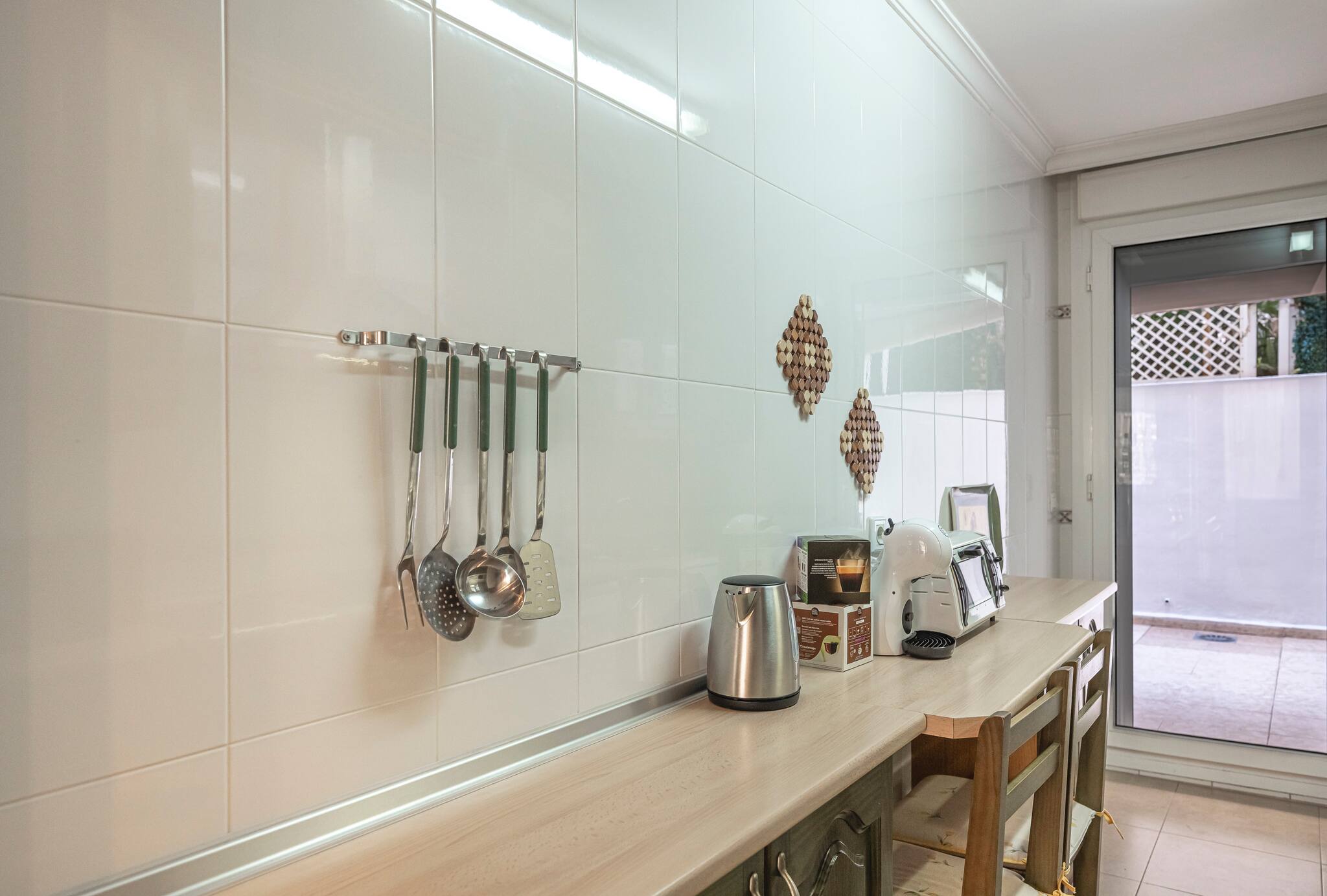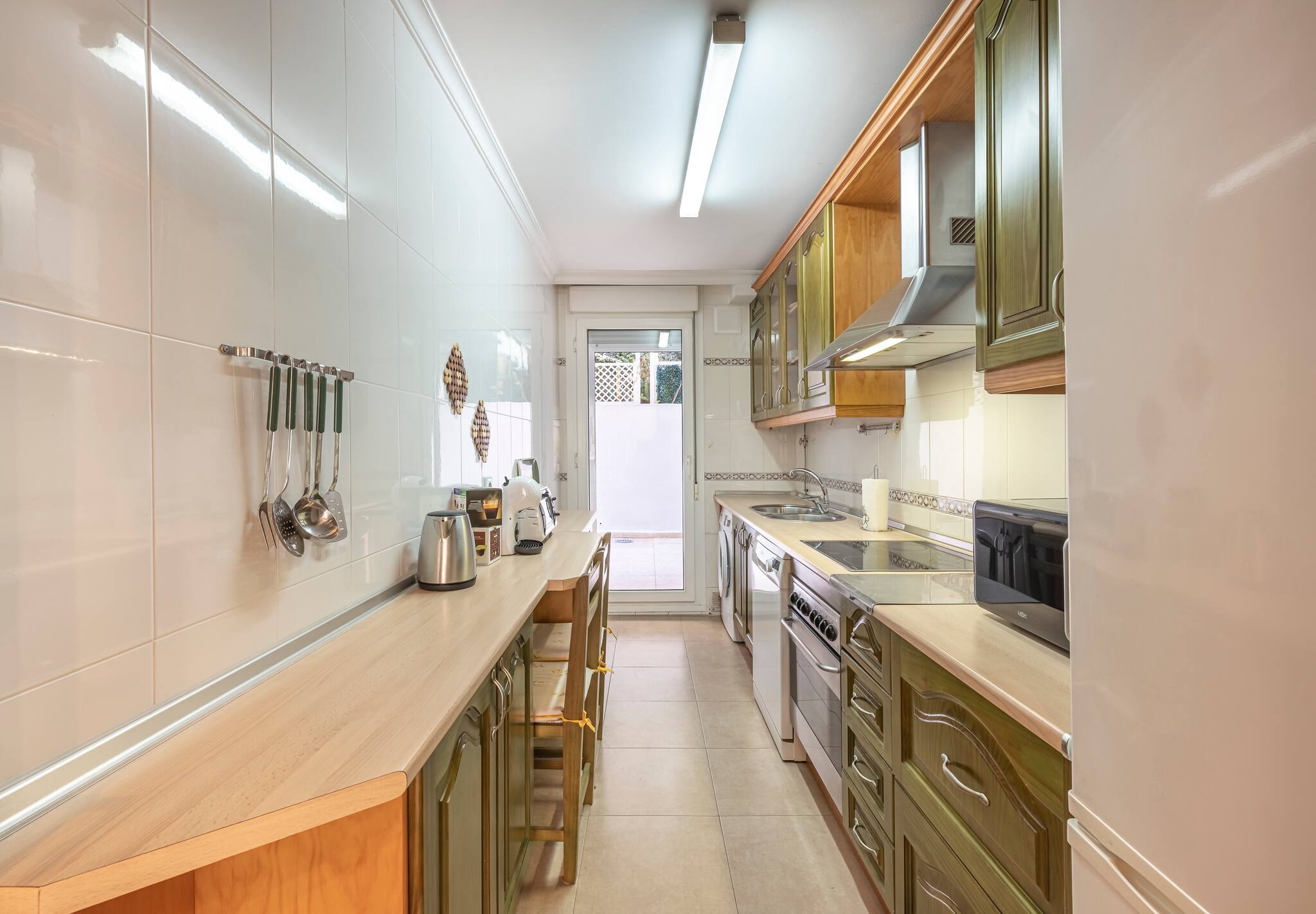 >Cocina: Cocina tus platos favoritos en nuestra moderna cocina independiente, totalmente equipada con nevera, cafetera, tostadora, microondas, horno, placa de vitrocerámica, vajilla completa y lavadora. También dispone de amplio espacio de almacenamiento.