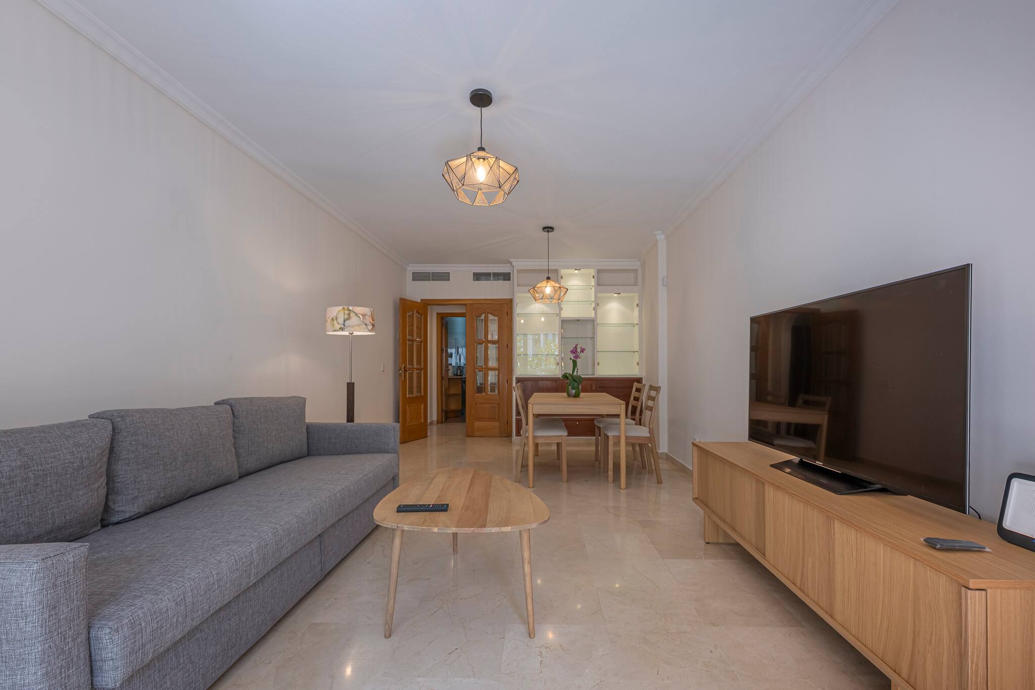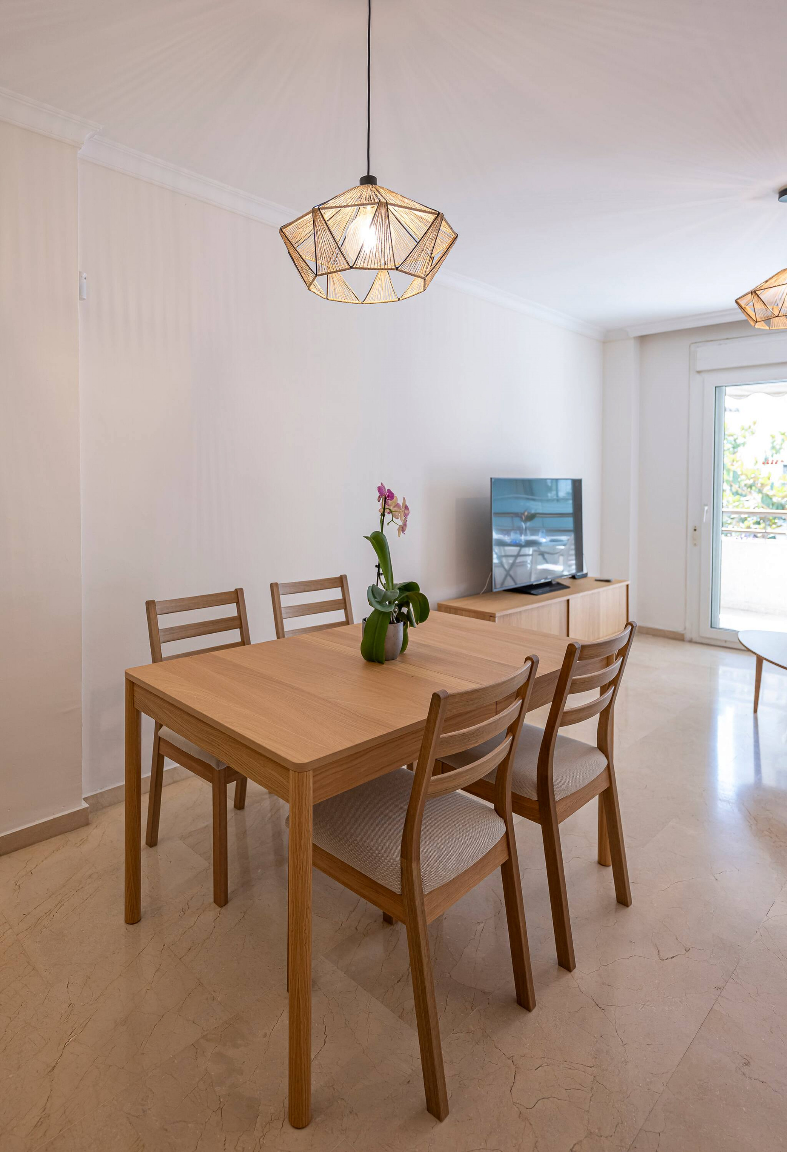 > Salón: Se encuentra junto a la cocina y con acceso a la terraza desde aquí, el salón cuenta con un cómodo y lujoso sofá esquinero, una mesita ratona y Smart TV. Espacio con mesa y sillas de comedor para 4 comensales.