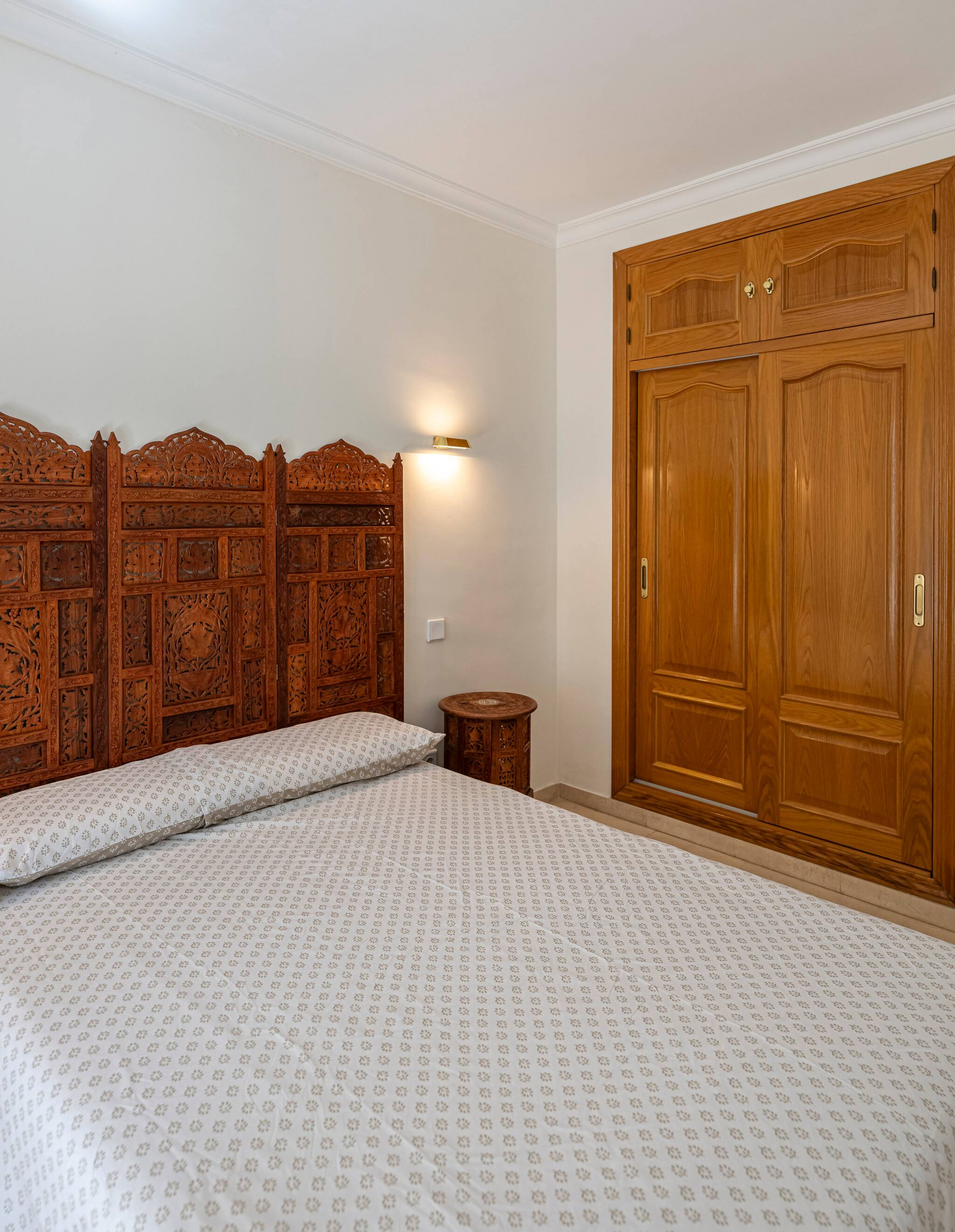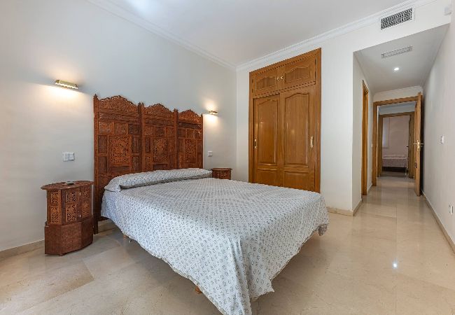 >Dormitorio Principal: El luminoso dormitorio principal cuenta con una cama doble, mesas de noche con lámparas, aire acondicionado, un armario empotrado y acceso directo al balcón.