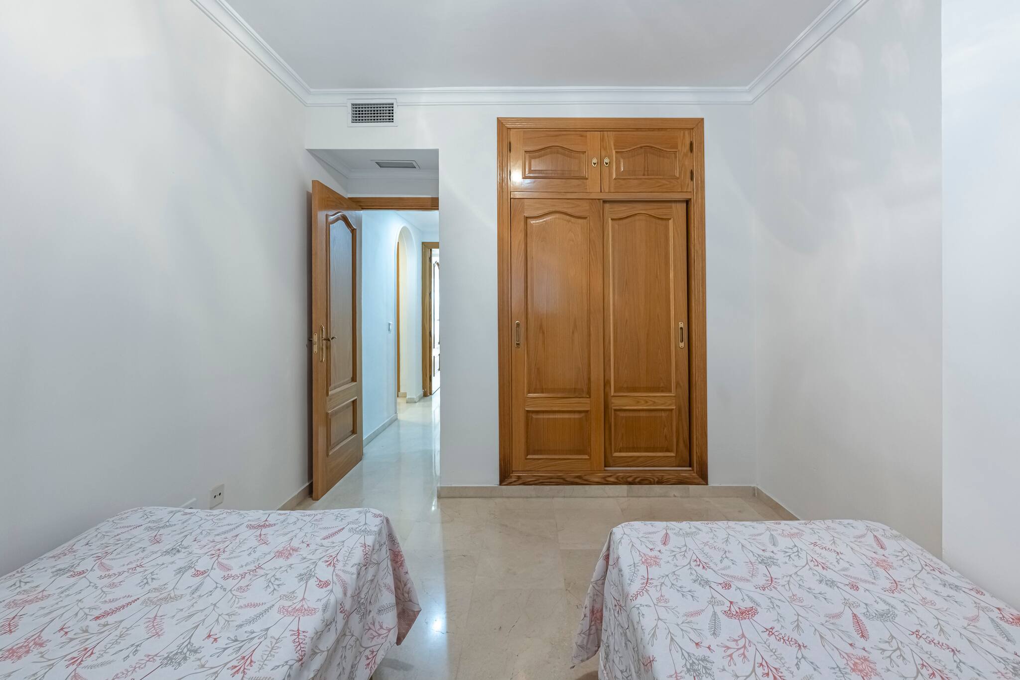 >Dormitorio Secundario: Este dormitorio ofrece dos camas individuales, una mesa de noche con lámpara, un armario empotrado y aire acondicionado.