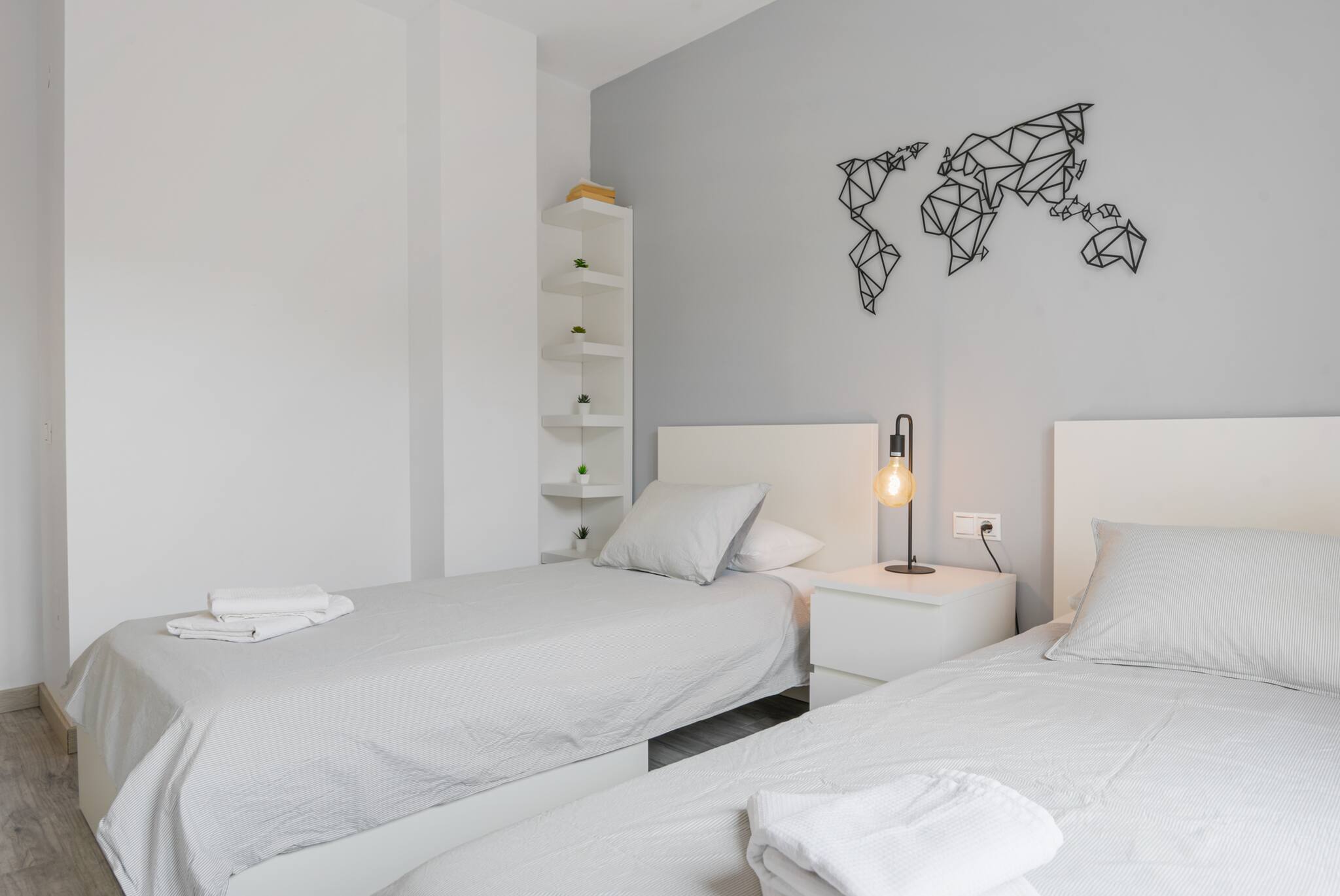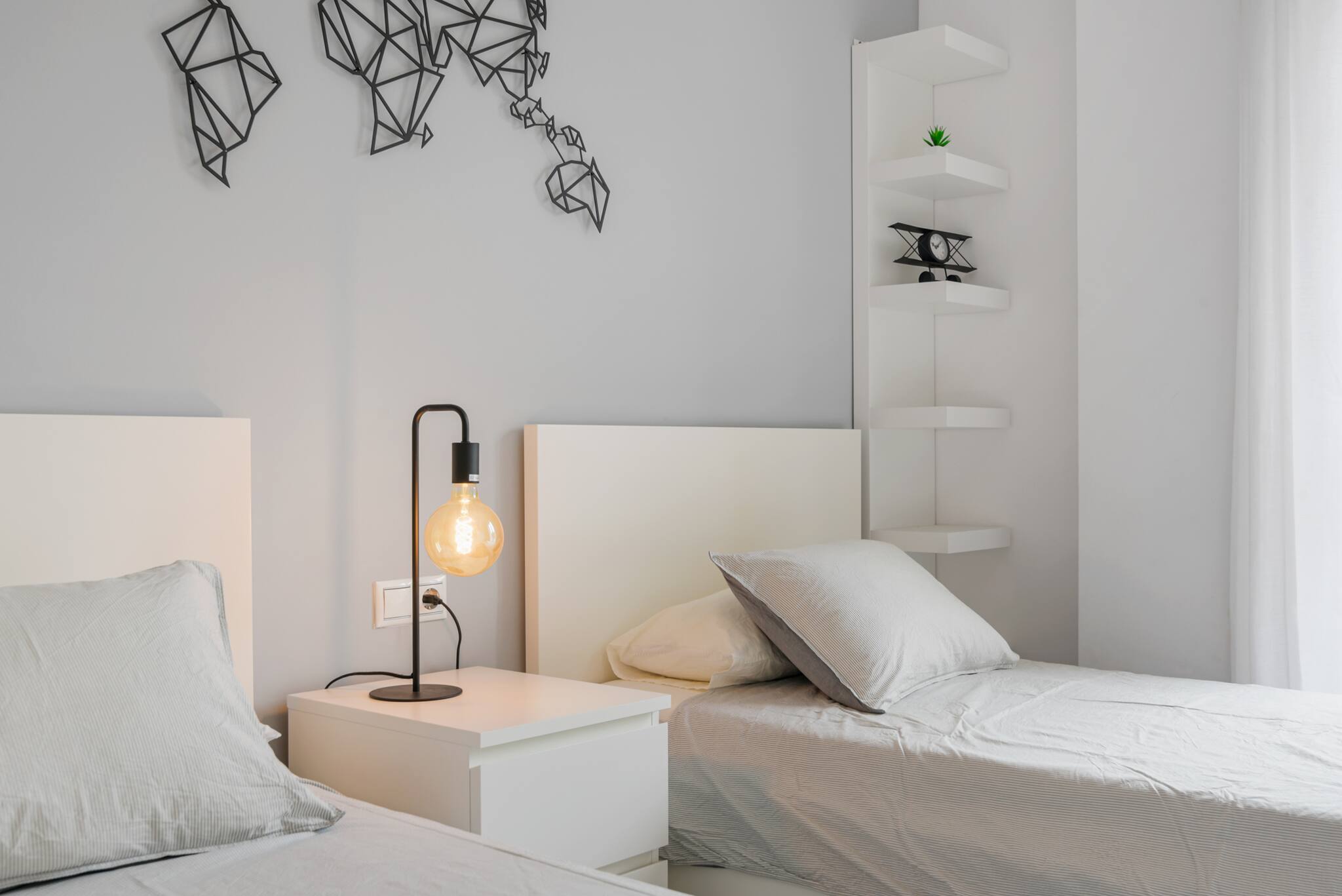 >Habitación secundaria: La habitación secundaria es acogedora y funcional, equipada con dos camas individuales y una mesa de noche con lámpara. Esta habitación también tiene amplio espacio de guardado, y una ventana que permite la entrada de luz natural.