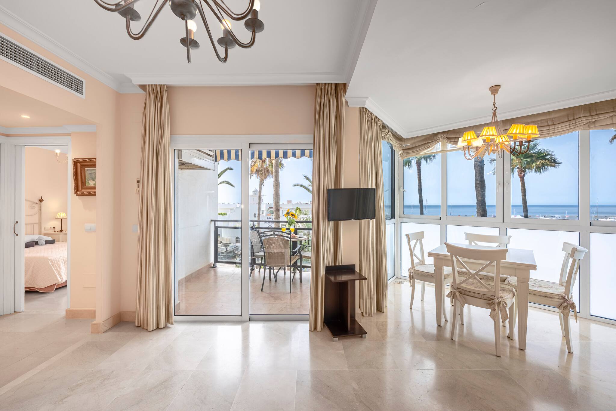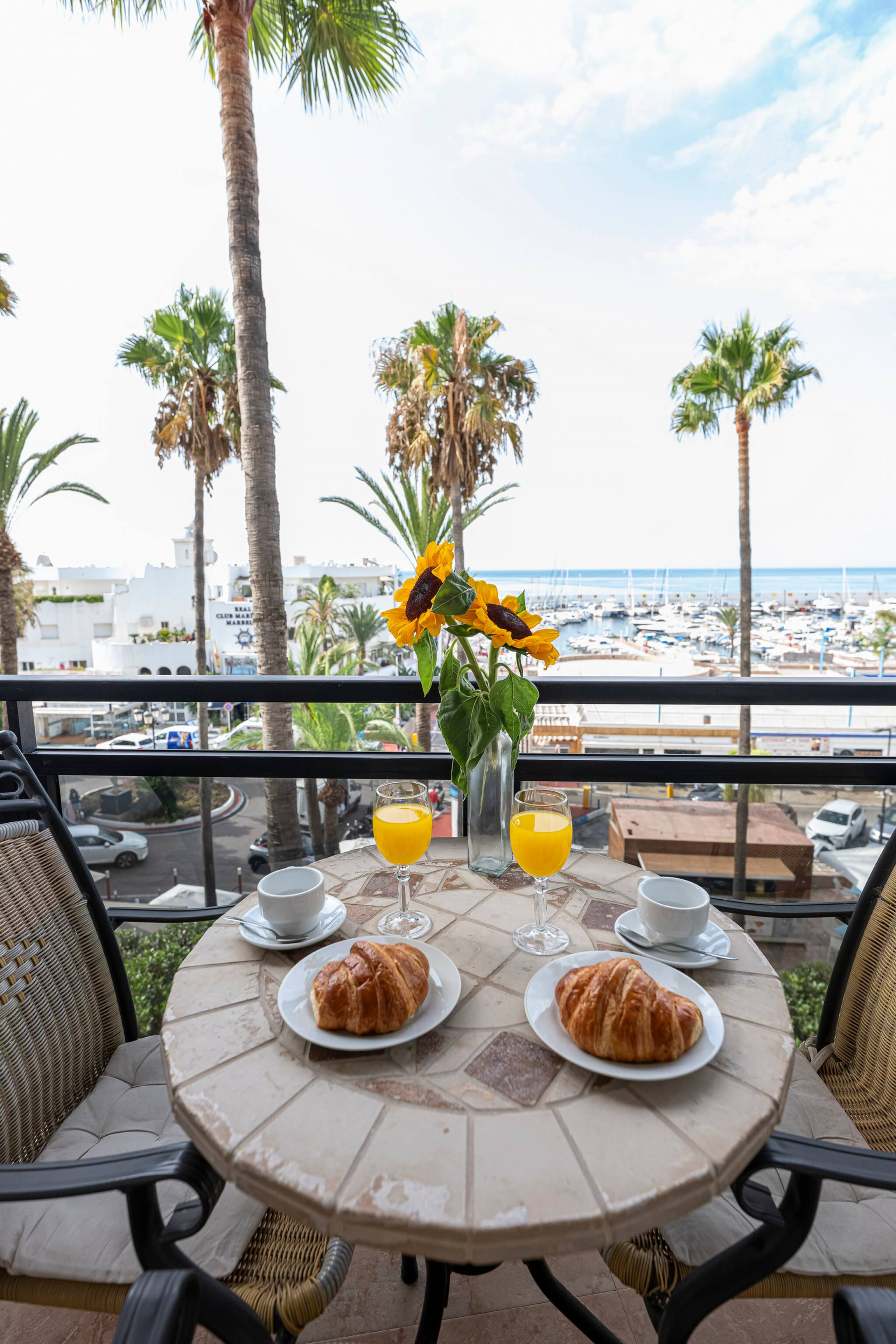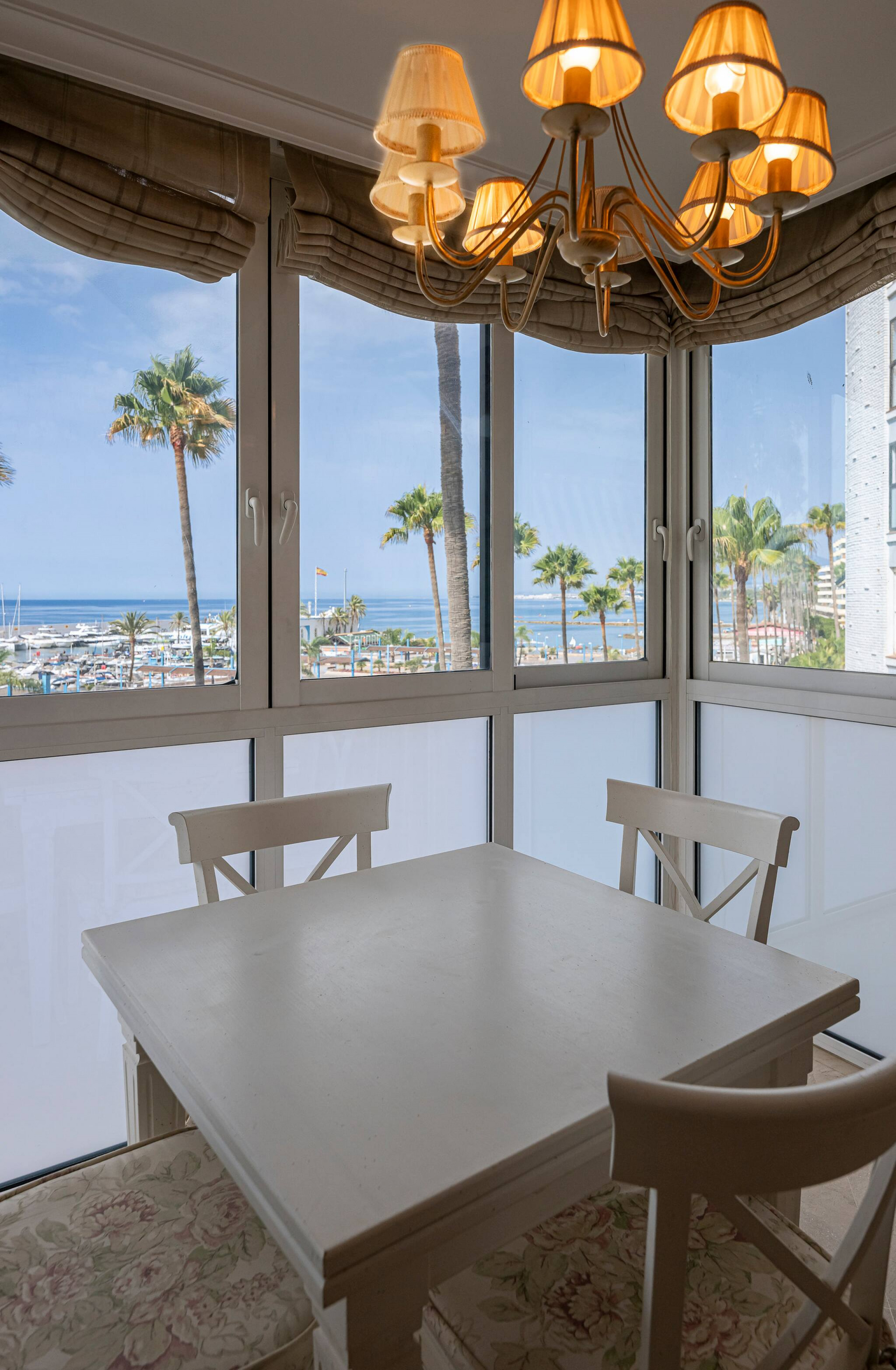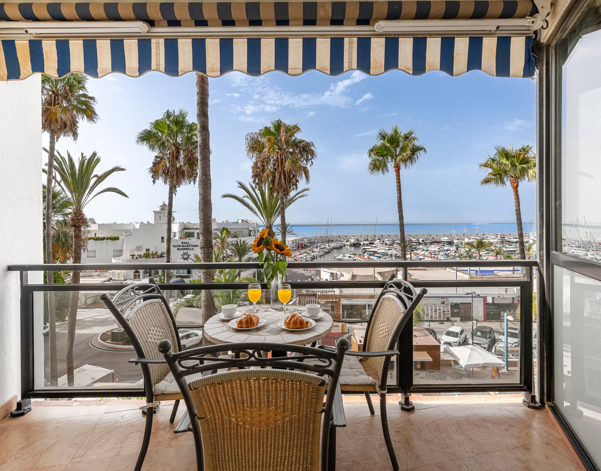 > Amplio balcón con mesa y sillas para disfrutar de desayunos o cenas al aire libre mientras contemplas unas espectaculares vistas al puerto deportivo y al mar. Rodeado de palmeras y con un ambiente costero único, es el lugar ideal para relajarse y aprovechar al máximo el clima de la Costa del Sol.