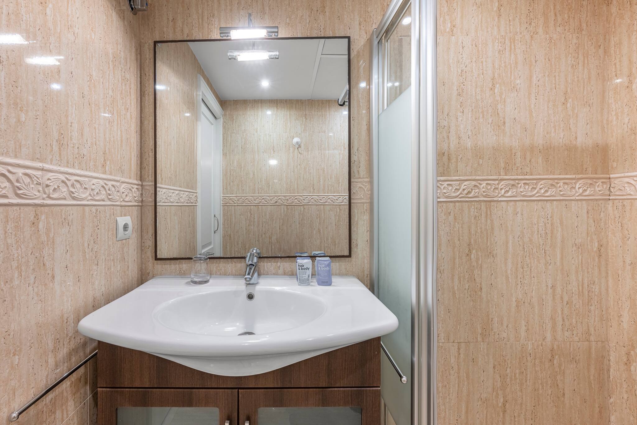 >Baño moderno y funcional con ducha cerrada de mampara, lavabo amplio con mueble de almacenaje y gran espejo iluminado. Sus acabados en tonos cálidos crean un ambiente acogedor.