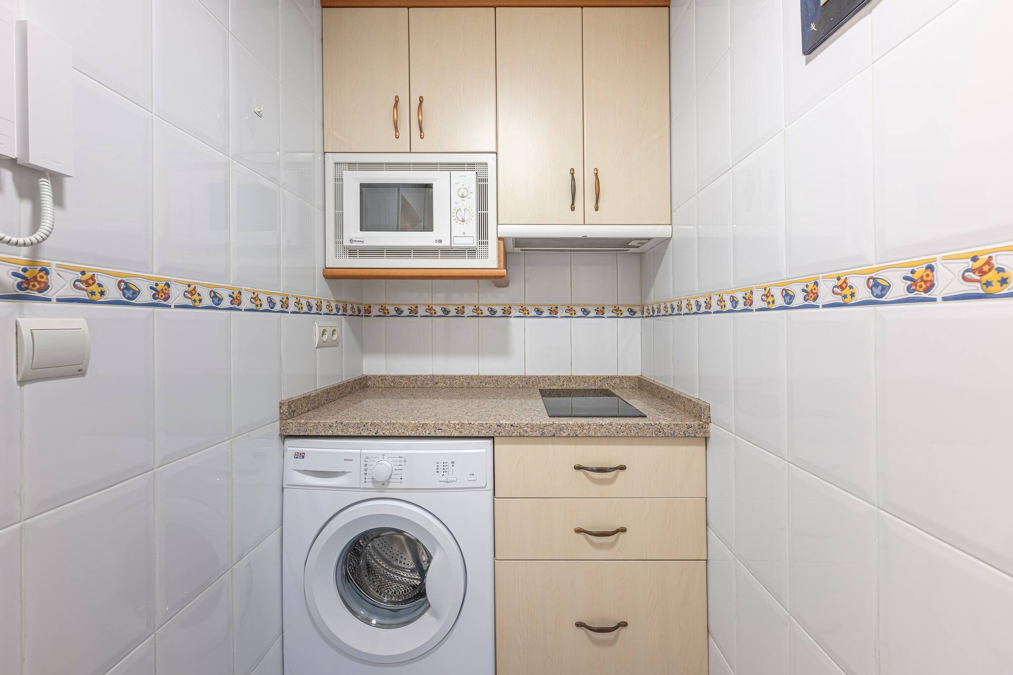 > Cocina independiente completamente equipada con electrodomésticos esenciales, incluyendo vitrocerámica, microondas, lavadora y lavavajillas. Su diseño funcional permite preparar comidas con todo lo necesario a mano.