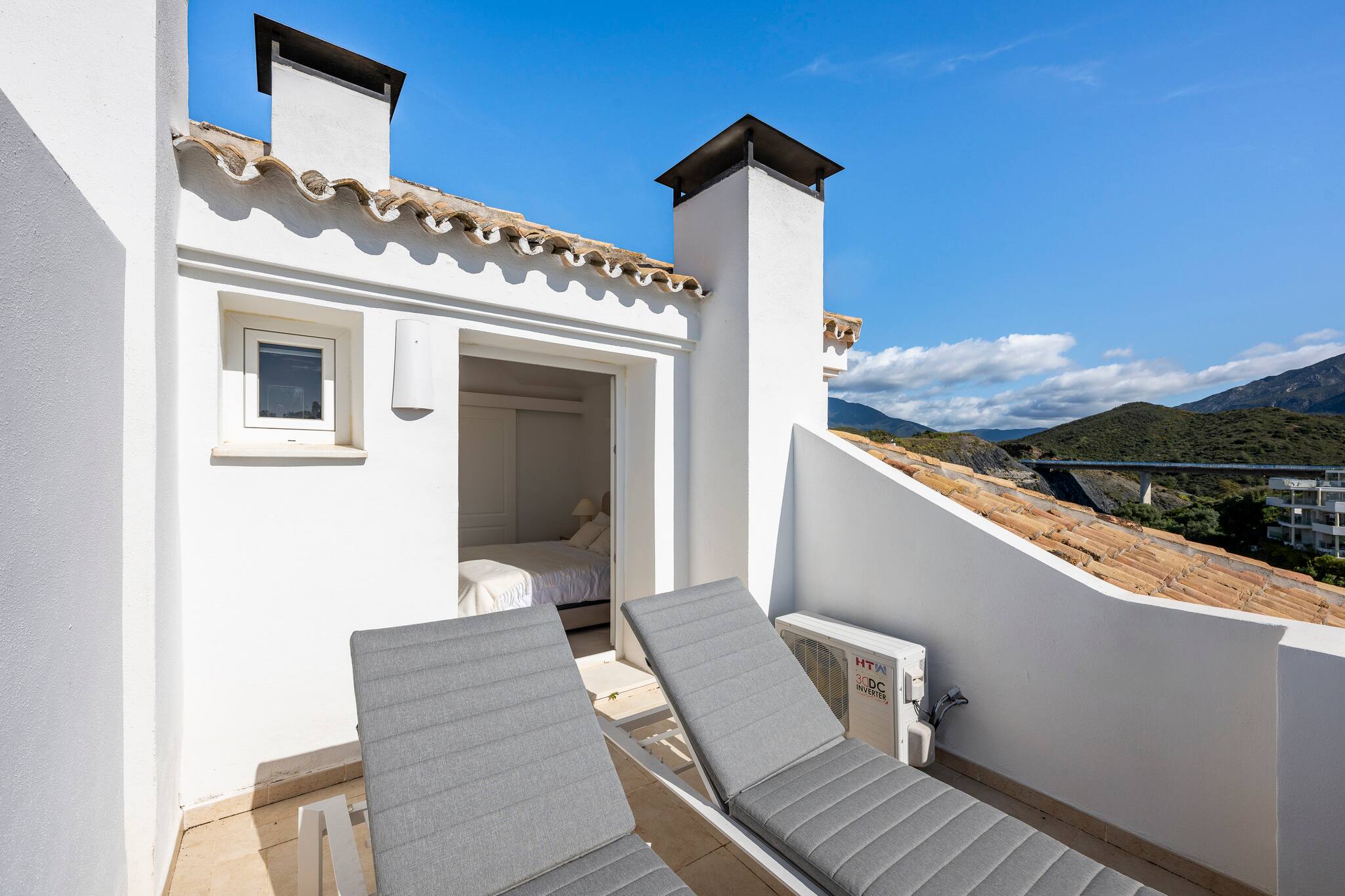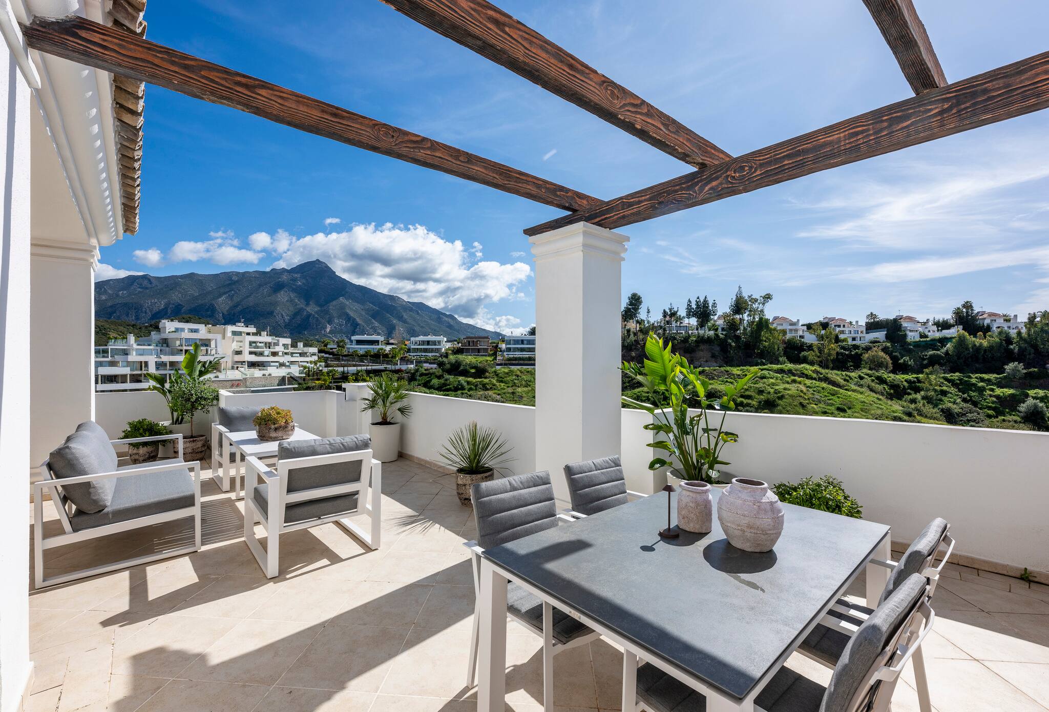 > Terraza: Cada habitación cuenta con una pequeña terraza y el living-comedor tien otra con hermosas vistas y muebles de exterior para poder disfrutar comidas, el sol o simplemente de un momento relajado.