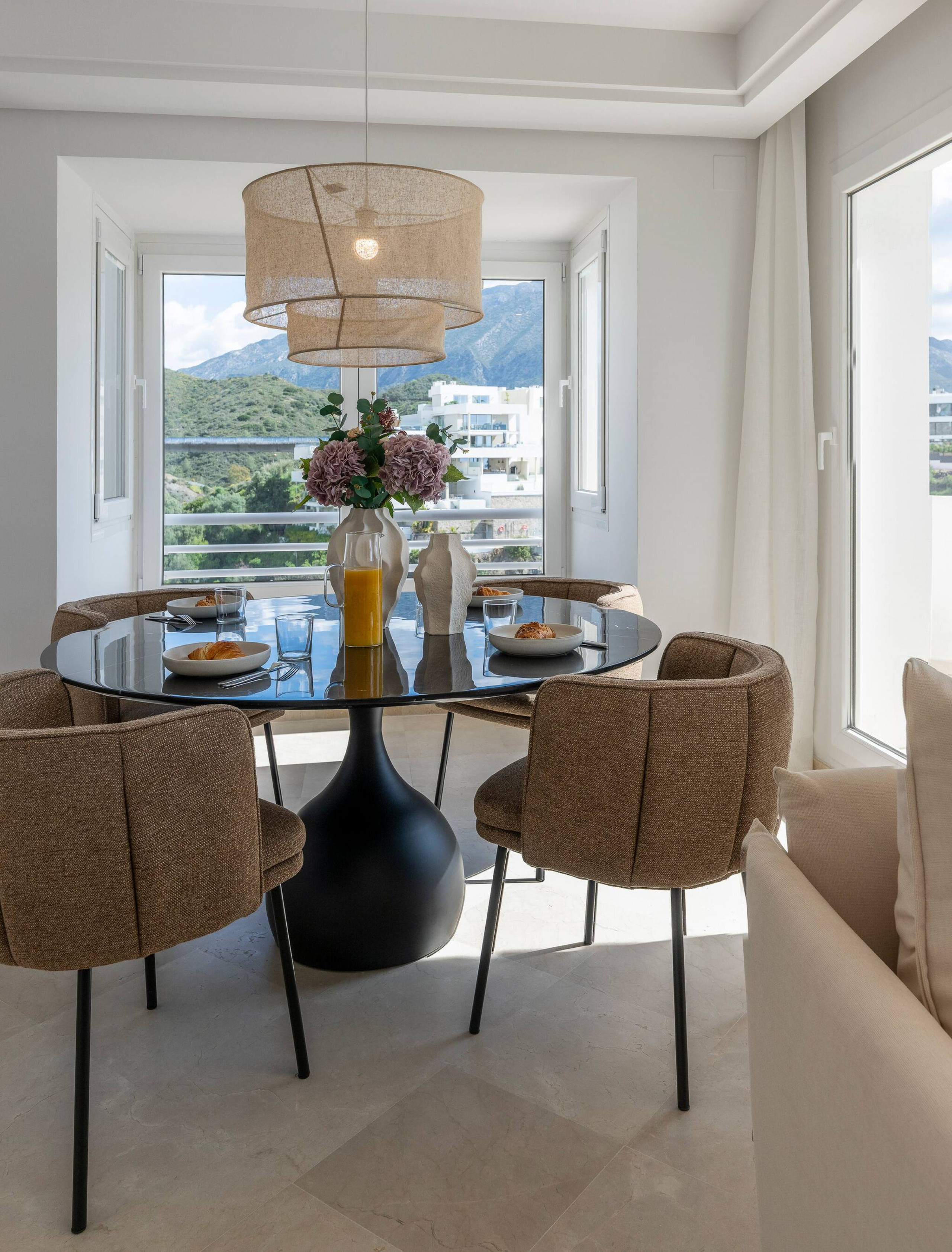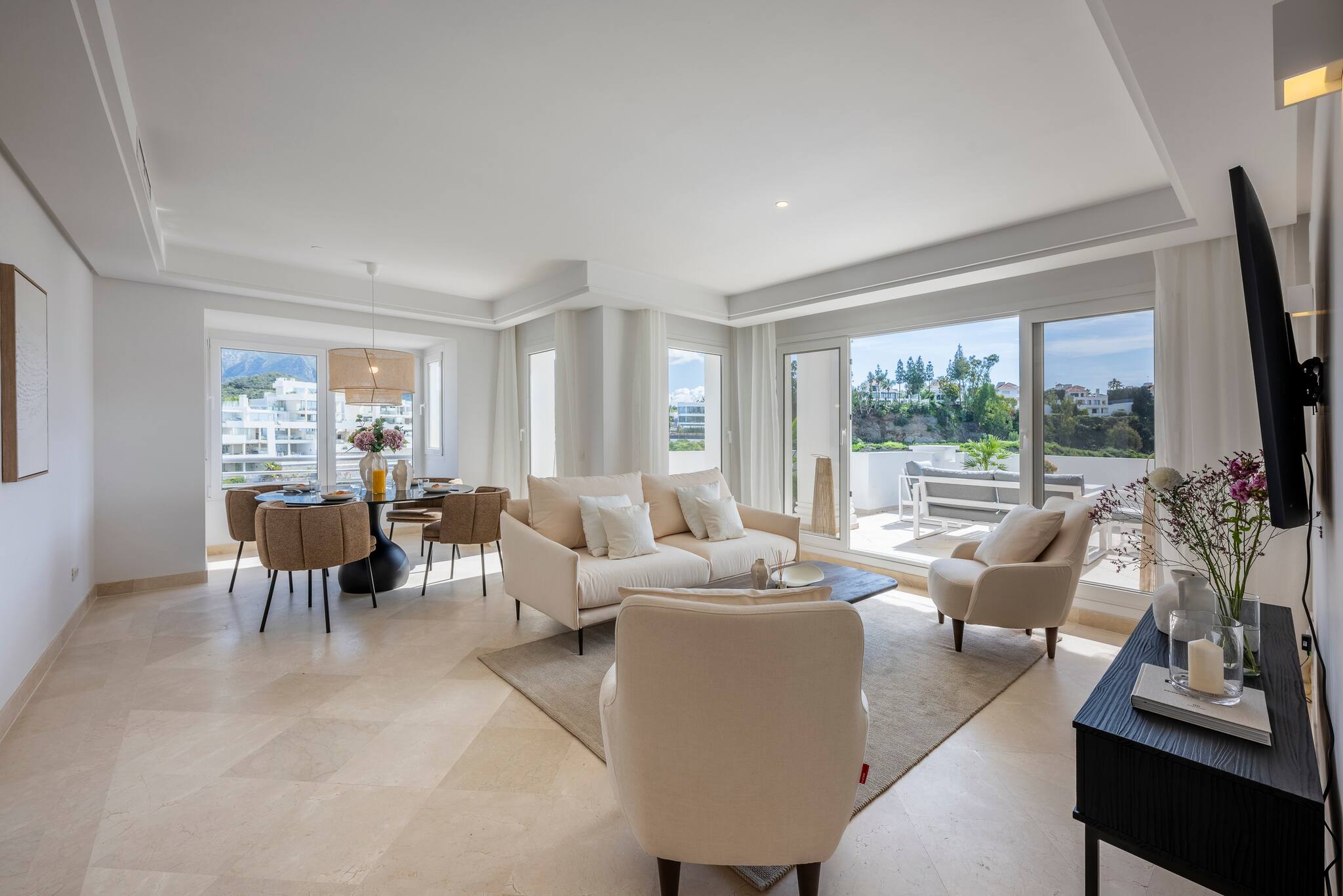 > Living Comedor: un espacio agradable con una mesa redonda y sillas para 4 huéspedes. Cuenta con un sillón de 2 cuerpos y 2 individuales frente a una Smart TV. Desde aquí se puede salir al balcón con hermosas vistas del jardín y las montañas.