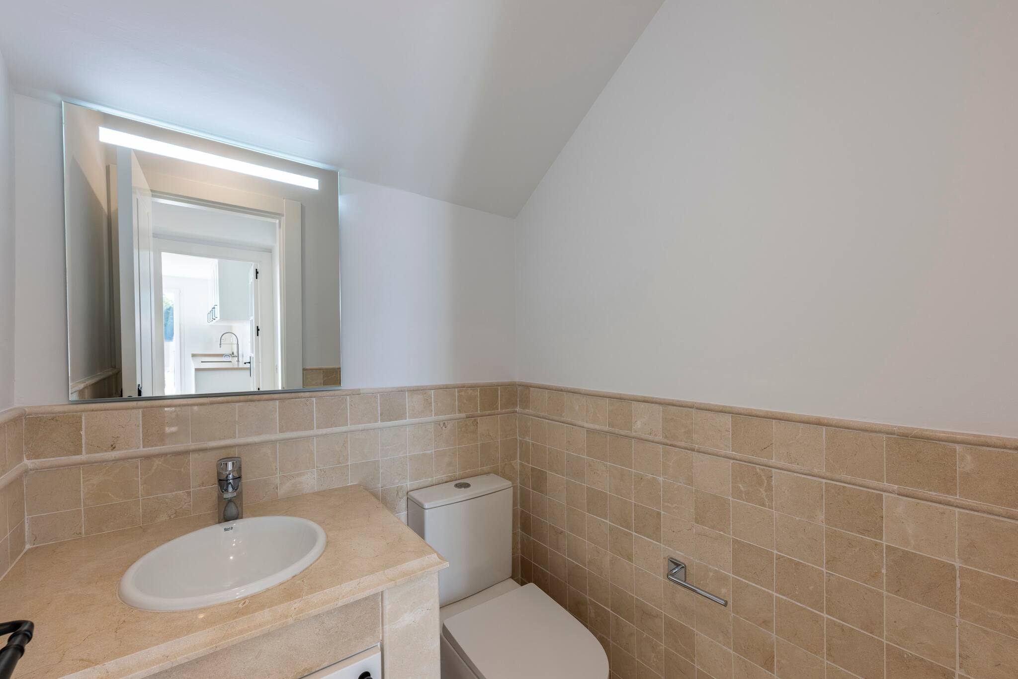 > Baños: Cuenta con 2 baños y medio. Uno con una ducha de esquina, un inodoro y lavabo con un espejo. El segundo baño tiene bañera y ducha separadas, inodoro y bidet, un lavabo doble con un gran espejo y espacio de guardado. Hay un baño de visitas con un inodoro y lavabo con espejo.