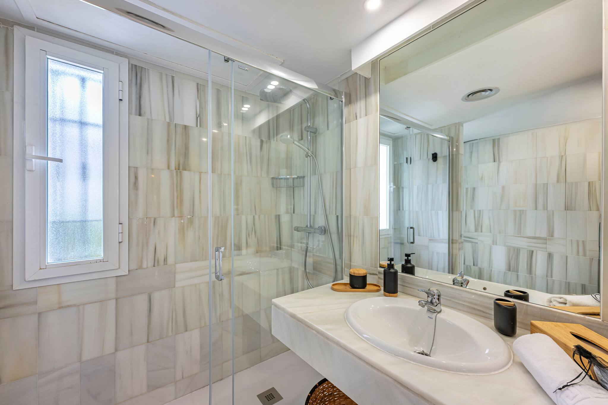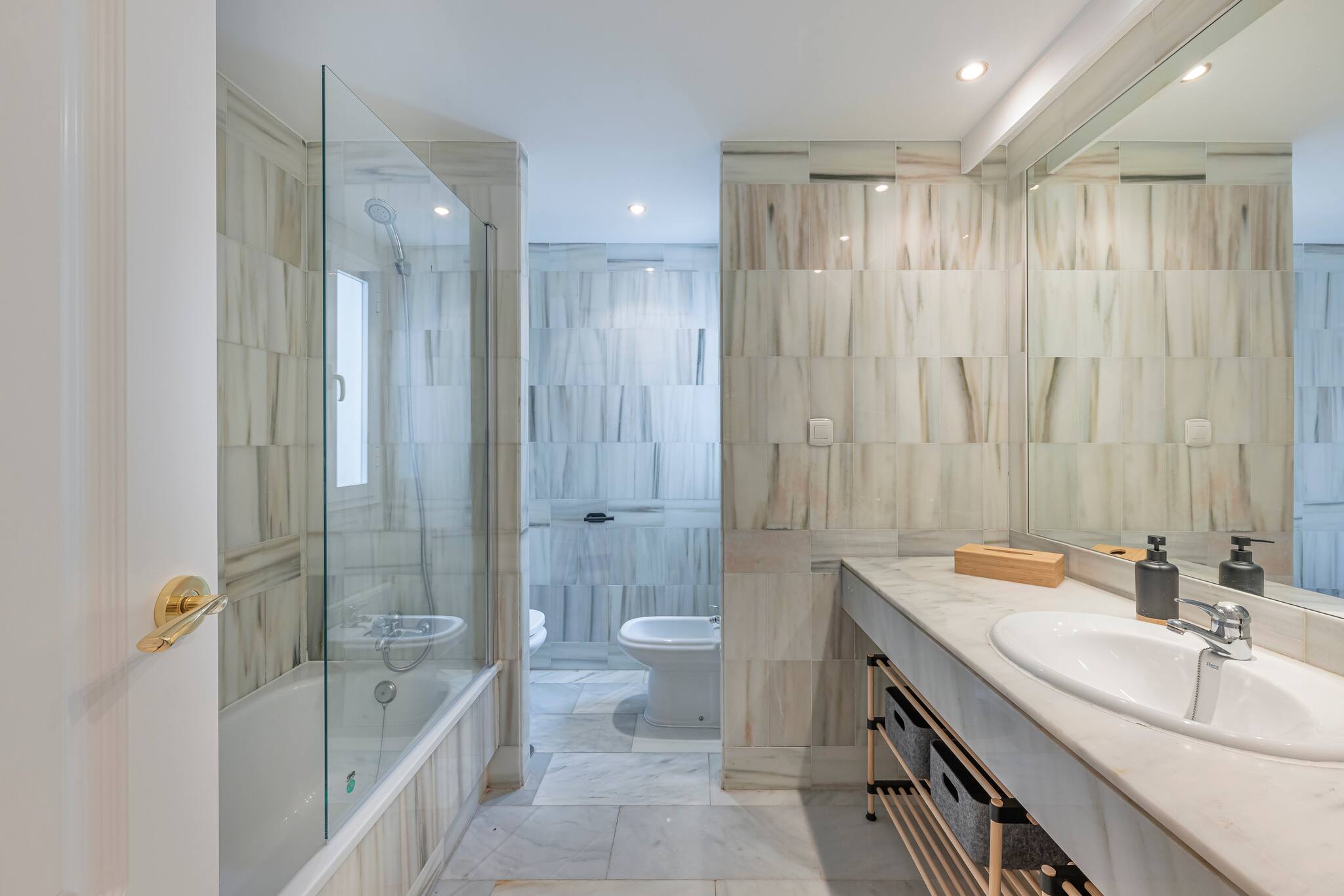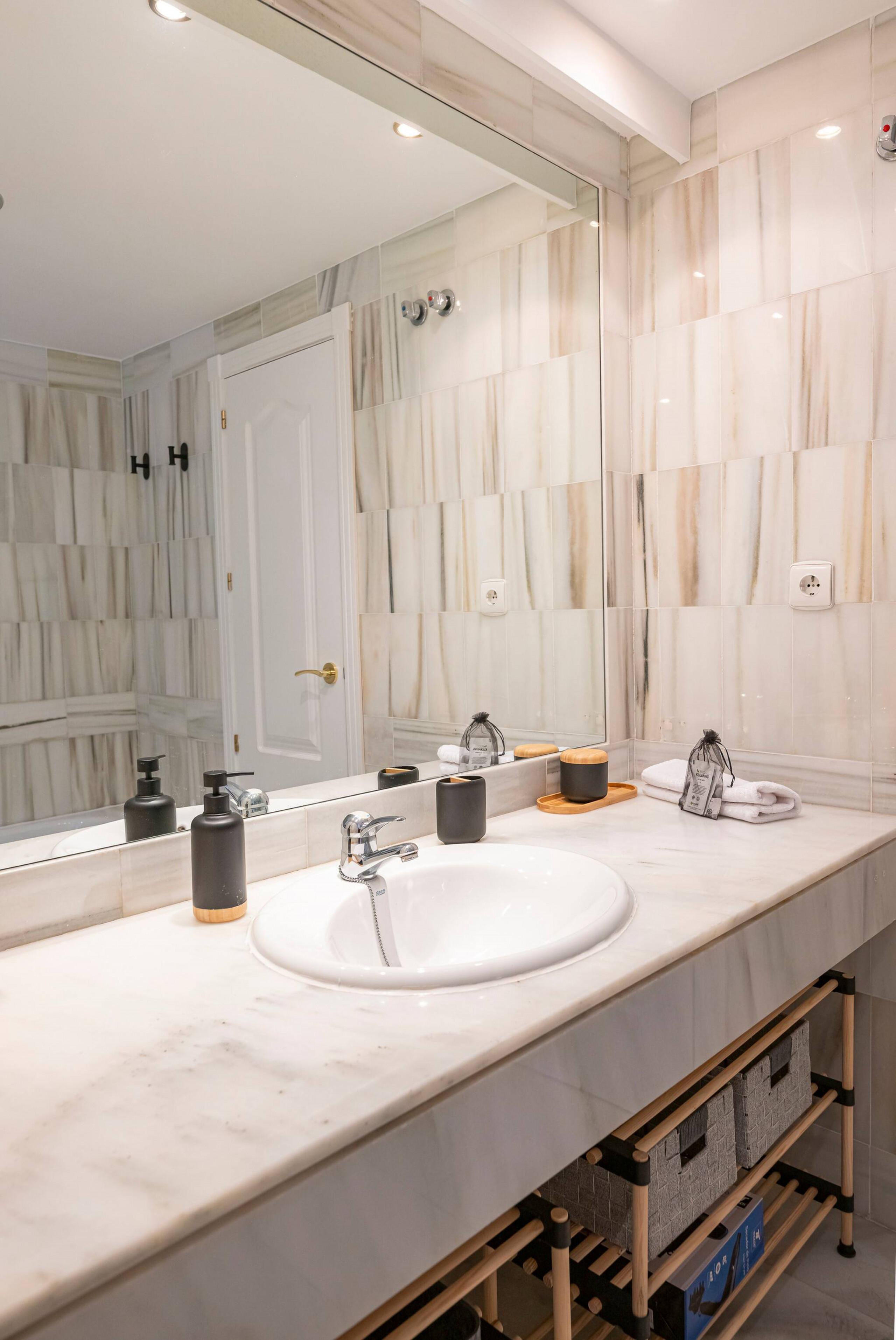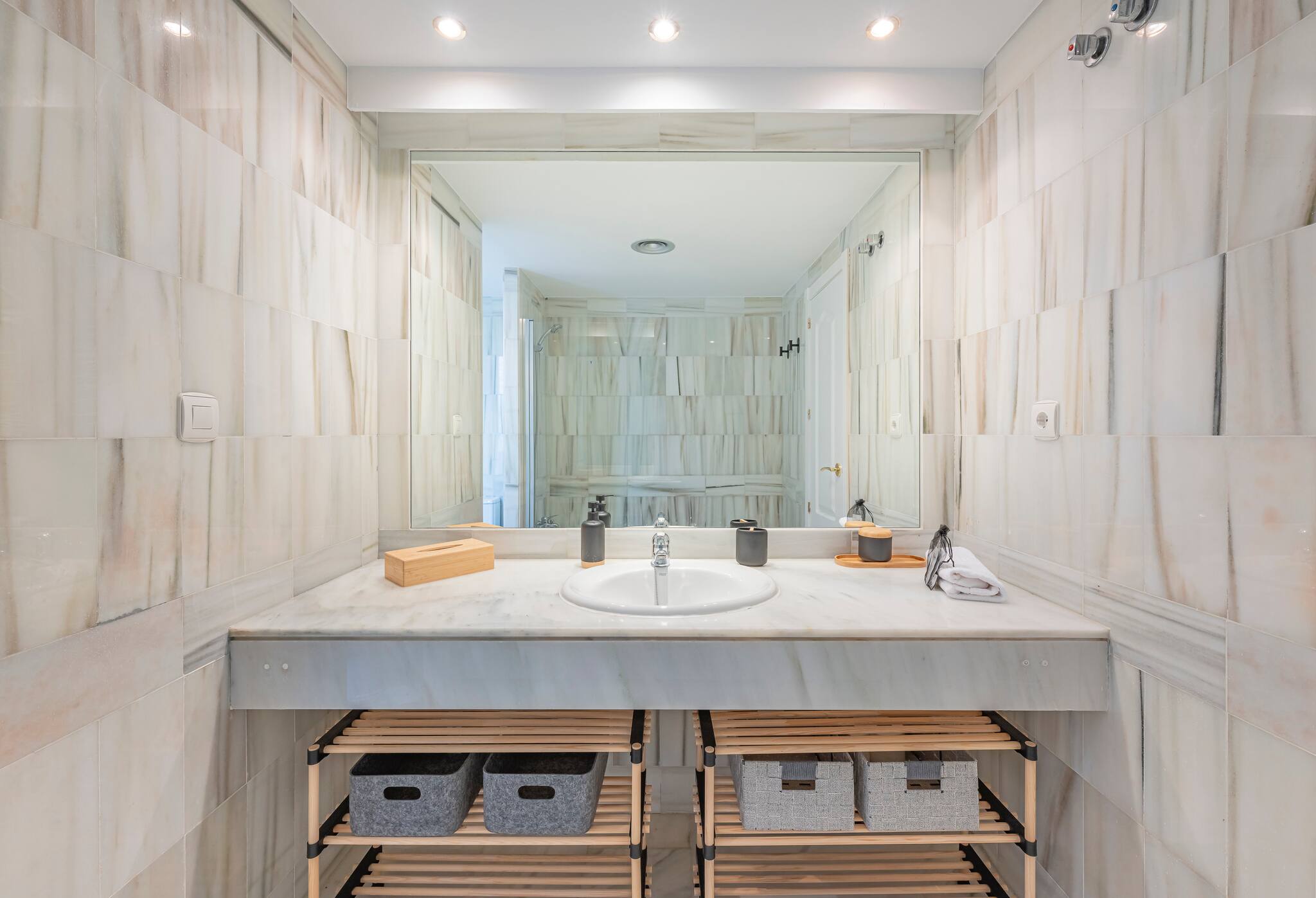 >Baños: Los baños son modernos y luminosos, equipados con lavamanos, inodoro, ducha y bañera cada uno, que os brindará un momento de relax al final del día.. El baño ensuite incluye espacio de guardado bajo el lavamanos para vuestros artículos de aseo. También cuentan con grandes espejos, perfectos para prepararos antes de salir.