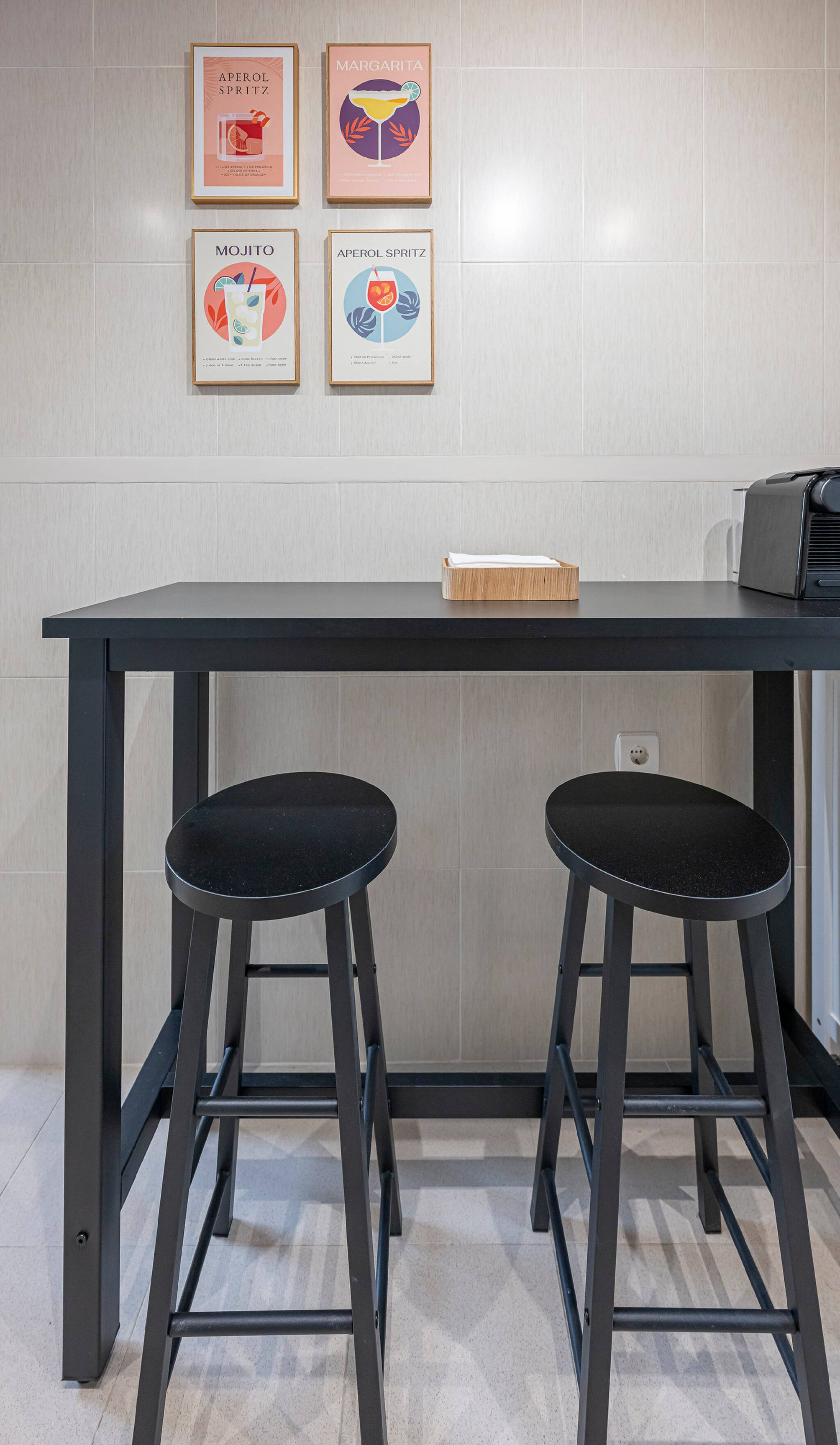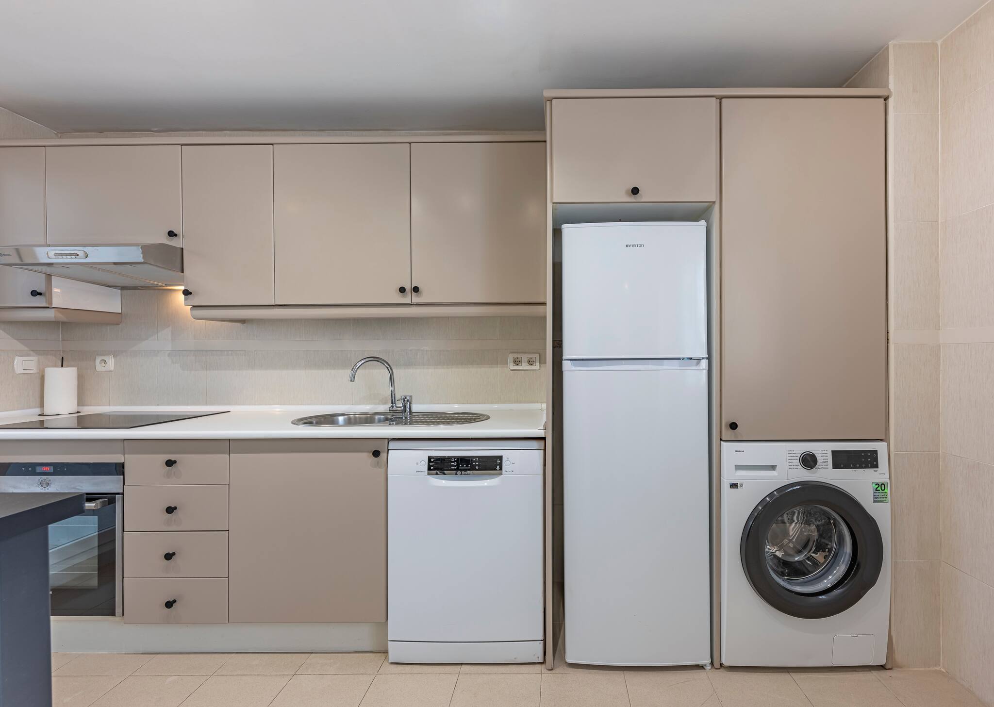 >Cocina: La cocina es moderna y cómoda, separada del saló. Está completamente equipada con todo lo que podríais necesitar: nevera, horno, vitrocerámica, microondas, lavavajillas, cafetera, calentador de agua, tostadora, lavadora, vajilla completa y amplio espacio de guardado. Aquí podréis preparar vuestras comidas favoritas con facilidad y disfrutar de un desayuno rápido o una cena elaborada.