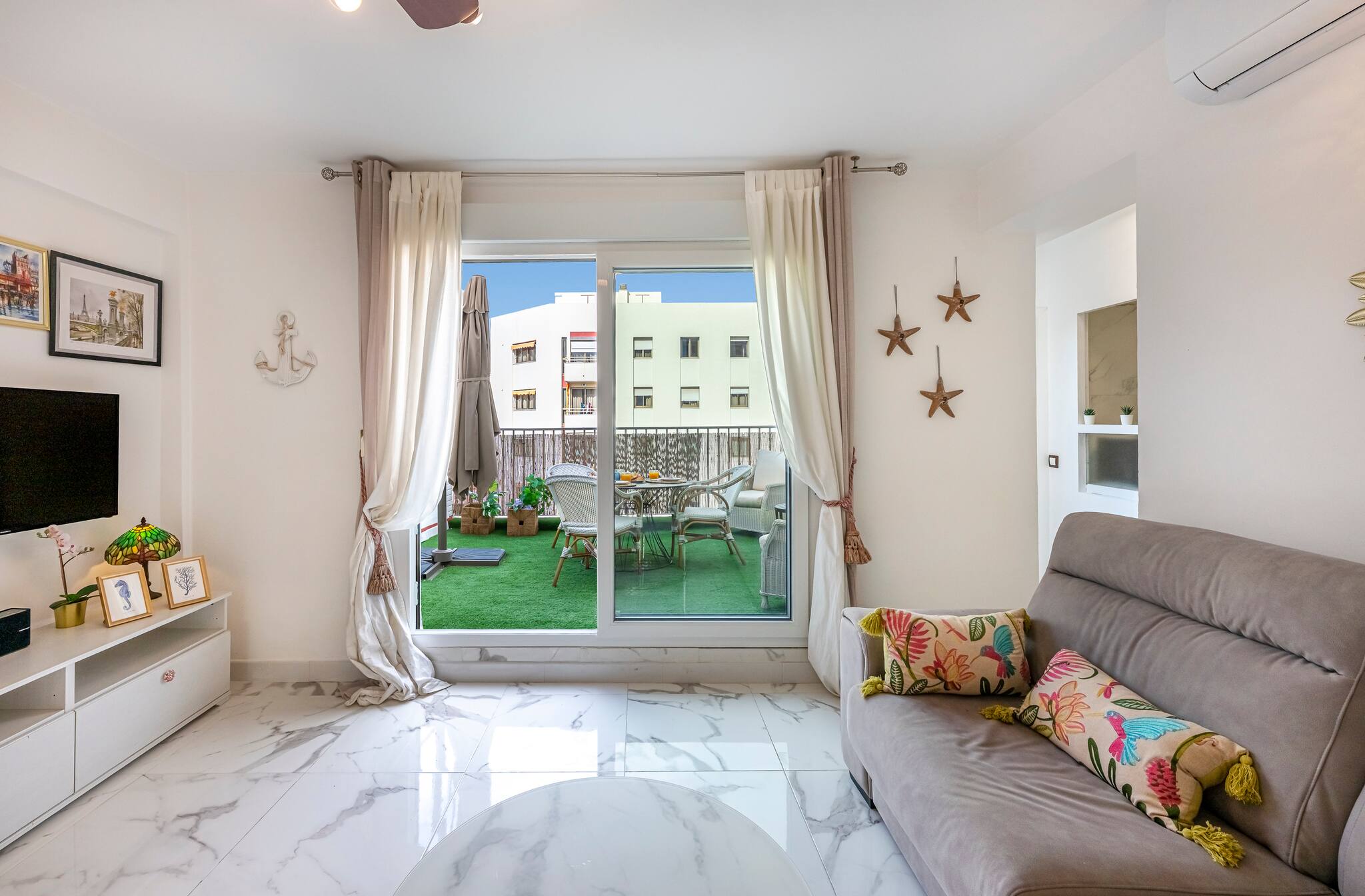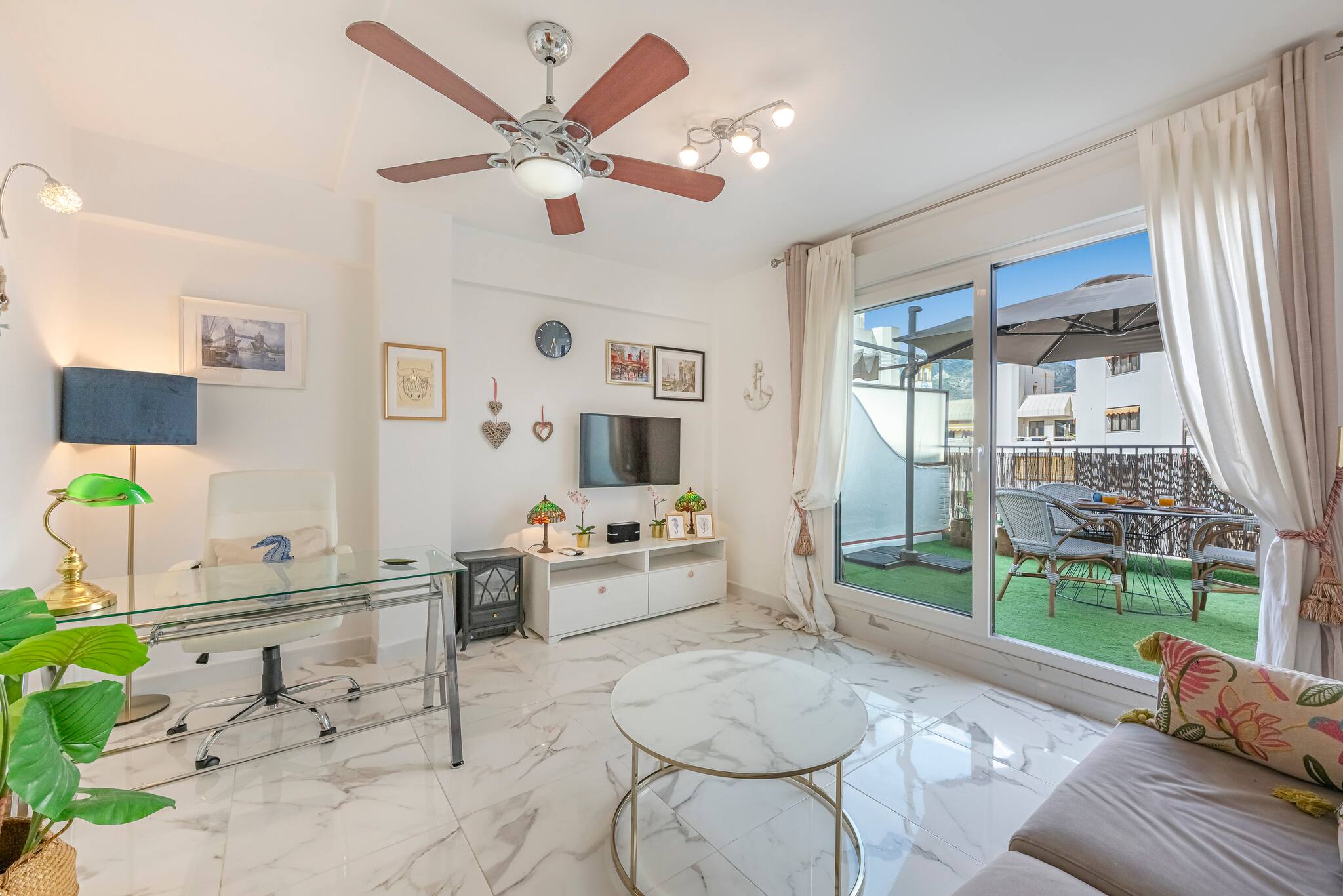 >Salón: Al ingresar, se encuentra el salón, un espacio amplio y luminoso, cuidadosamente decorado para brindar calidez y confort. Cuenta con un sofá cama de dos plazas, una televisión y una mesa auxiliar. La luz natural inunda la estancia gracias al acceso directo a la terraza, un rincón perfecto para disfrutar del aire libre. Además, el salón dispone de una mesa y una silla de trabajo, proporcionando un espacio adecuado para quienes necesiten teletrabajar durante su estancia.