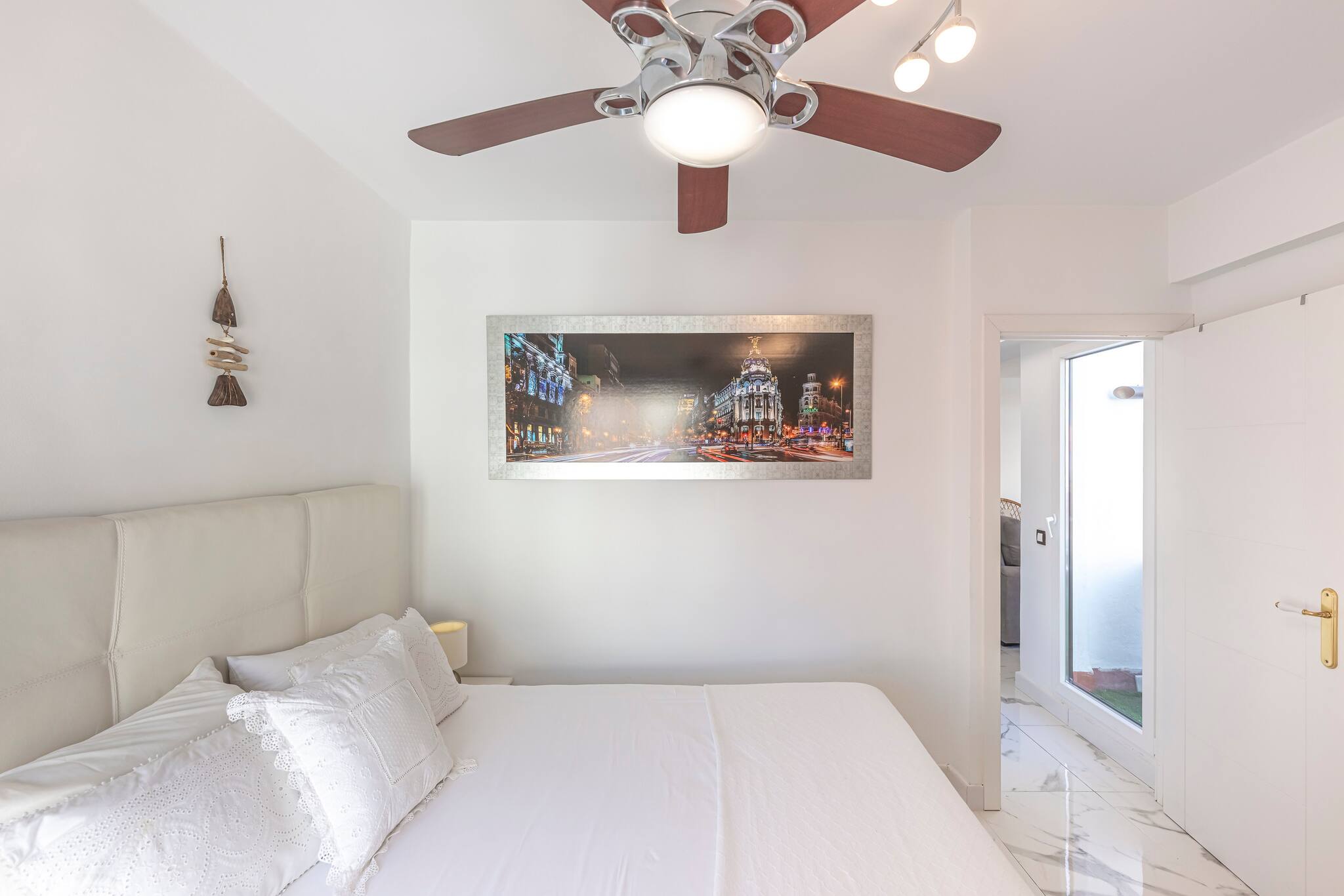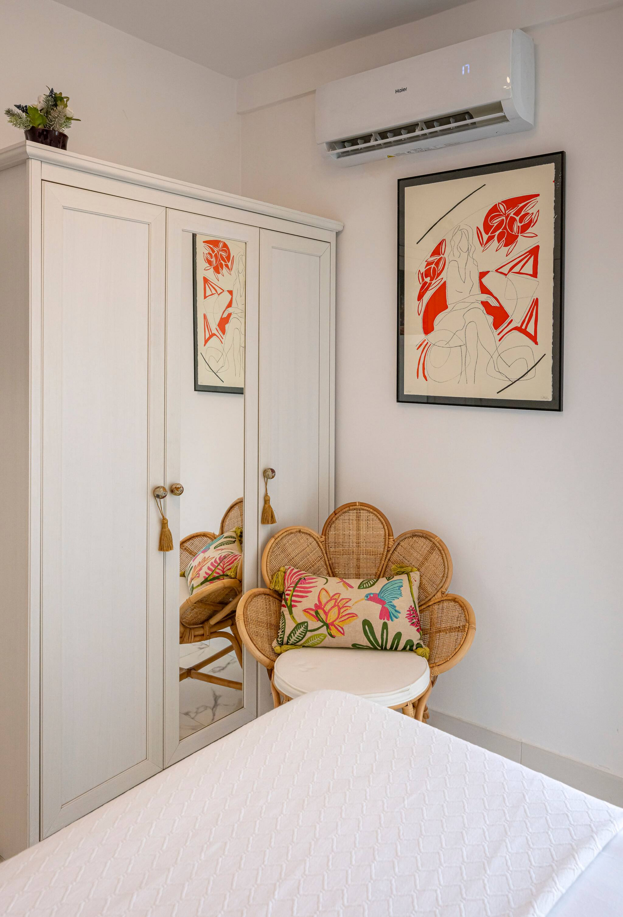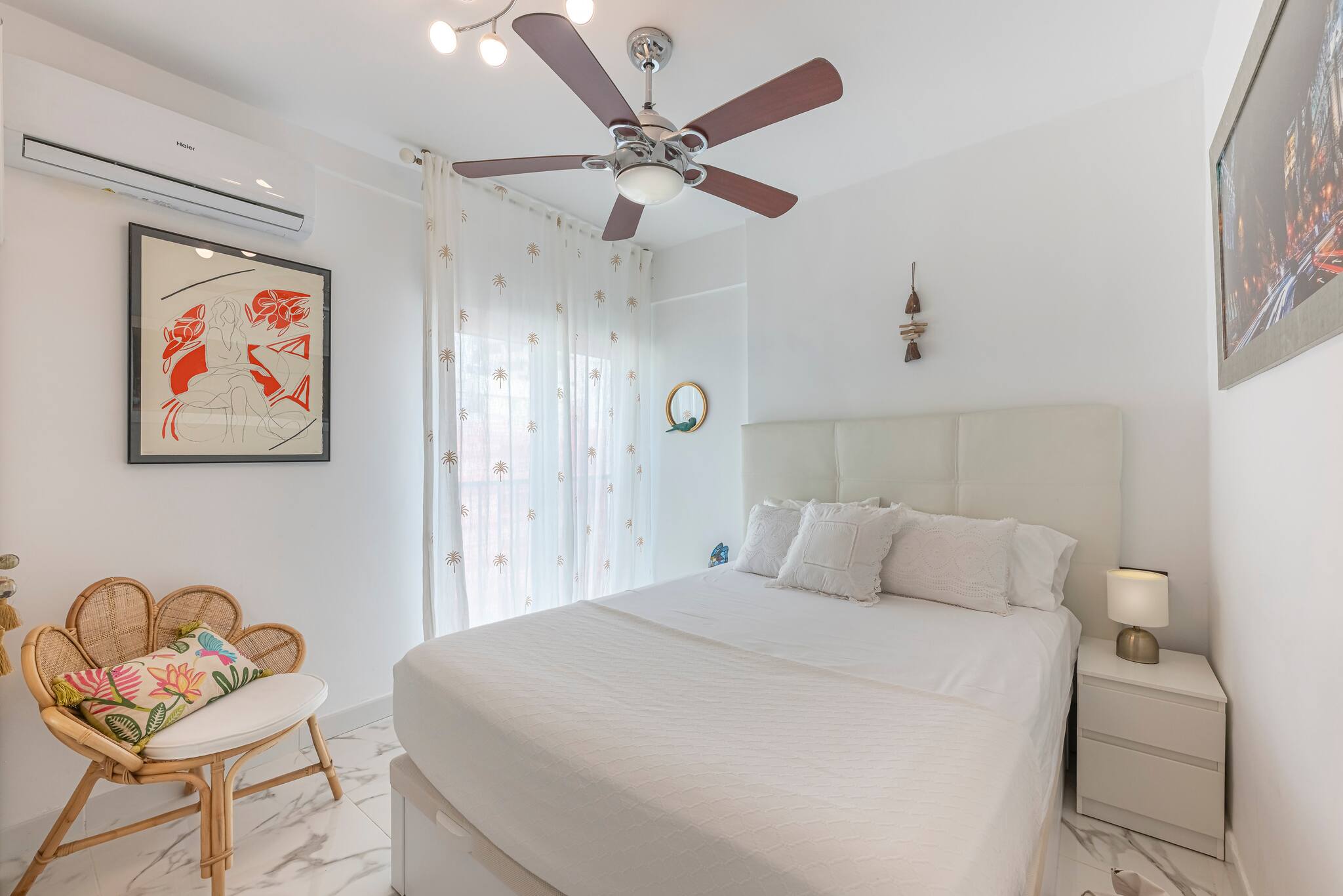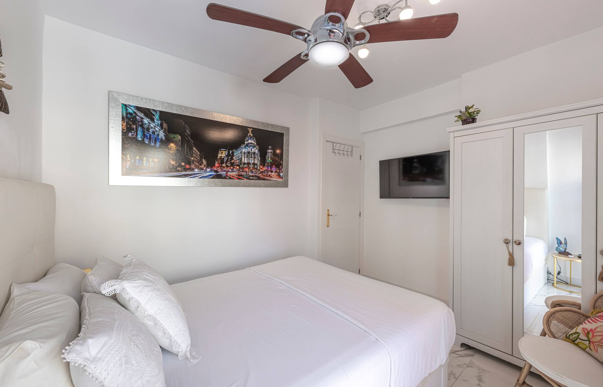 >Dormitorio: El apartamento dispone de un dormitorio luminoso, equipado con una cama doble, espacio de guardado y una mesa de noche con lámpara para mayor comodidad. También cuenta con una televisión, ventilador de techo y aire acondicionado, asegurando un ambiente fresco y confortable en cualquier época del año.