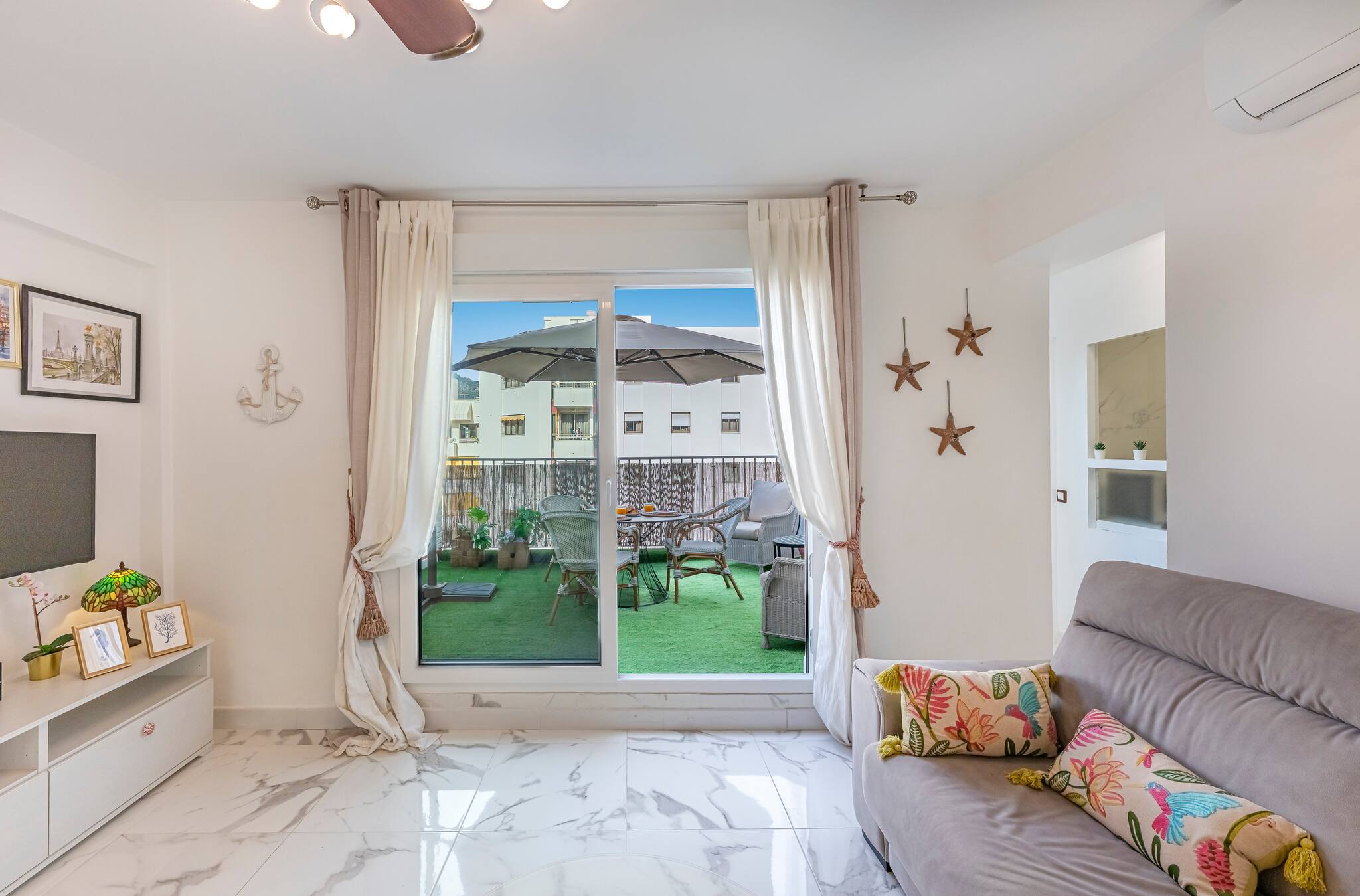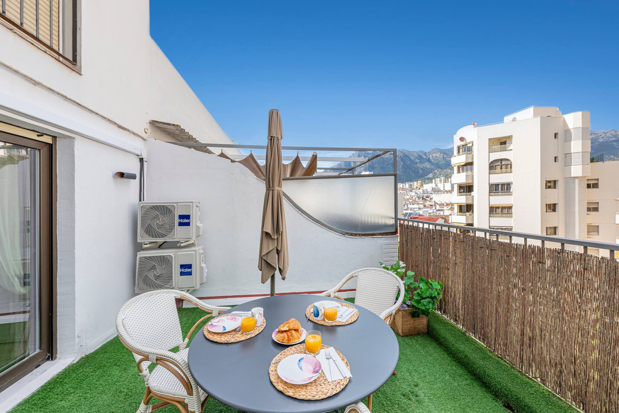 >Terraza: Uno de los mayores atractivos de la vivienda es su terraza, un espacio pensado para el descanso y el disfrute al aire libre. El césped sintético aporta un toque especial, creando un ambiente agradable para compartir comidas o momentos de relax. Está equipada con una mesa con capacidad para cuatro comensales, dos sillones individuales y una mesa auxiliar. Para mayor comodidad, cuenta con una gran sombrilla que permite disfrutar del espacio incluso en los días más soleados.