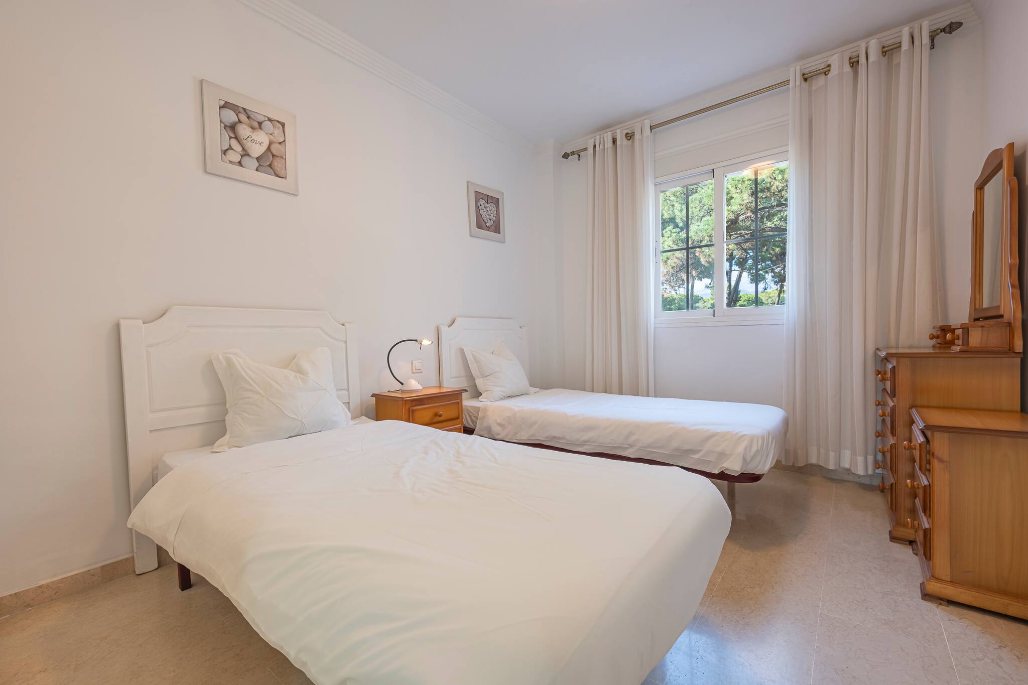 >Habitación secundaria: La habitación secundaria es acogedora y funcional, equipada con dos camas individuales y una mesa de noche con lámpara. Esta habitación también tiene amplio espacio de guardado, y una ventana que permite la entrada de luz natural.