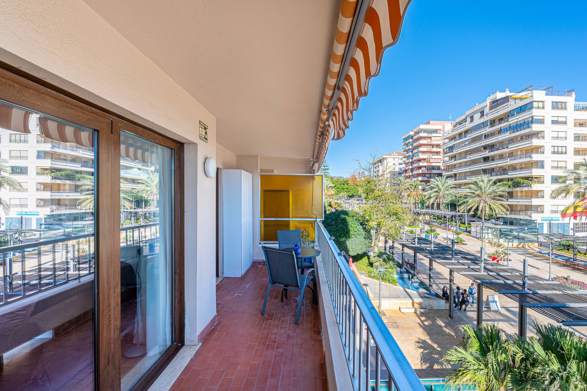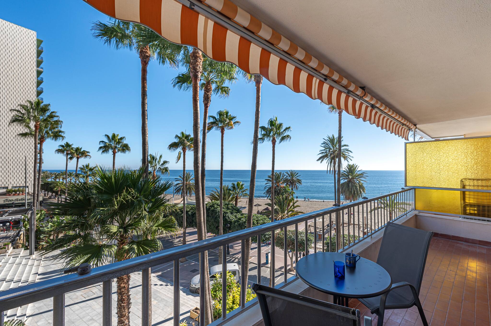 > Amplio balcón con mesa y sillas para disfrutar de desayunos o cenas al aire libre mientras contemplas unas espectaculares vistas al puerto deportivo y al mar. Rodeado de palmeras y con un ambiente costero único, es el lugar ideal para relajarse y aprovechar al máximo el clima de la Costa del Sol.
