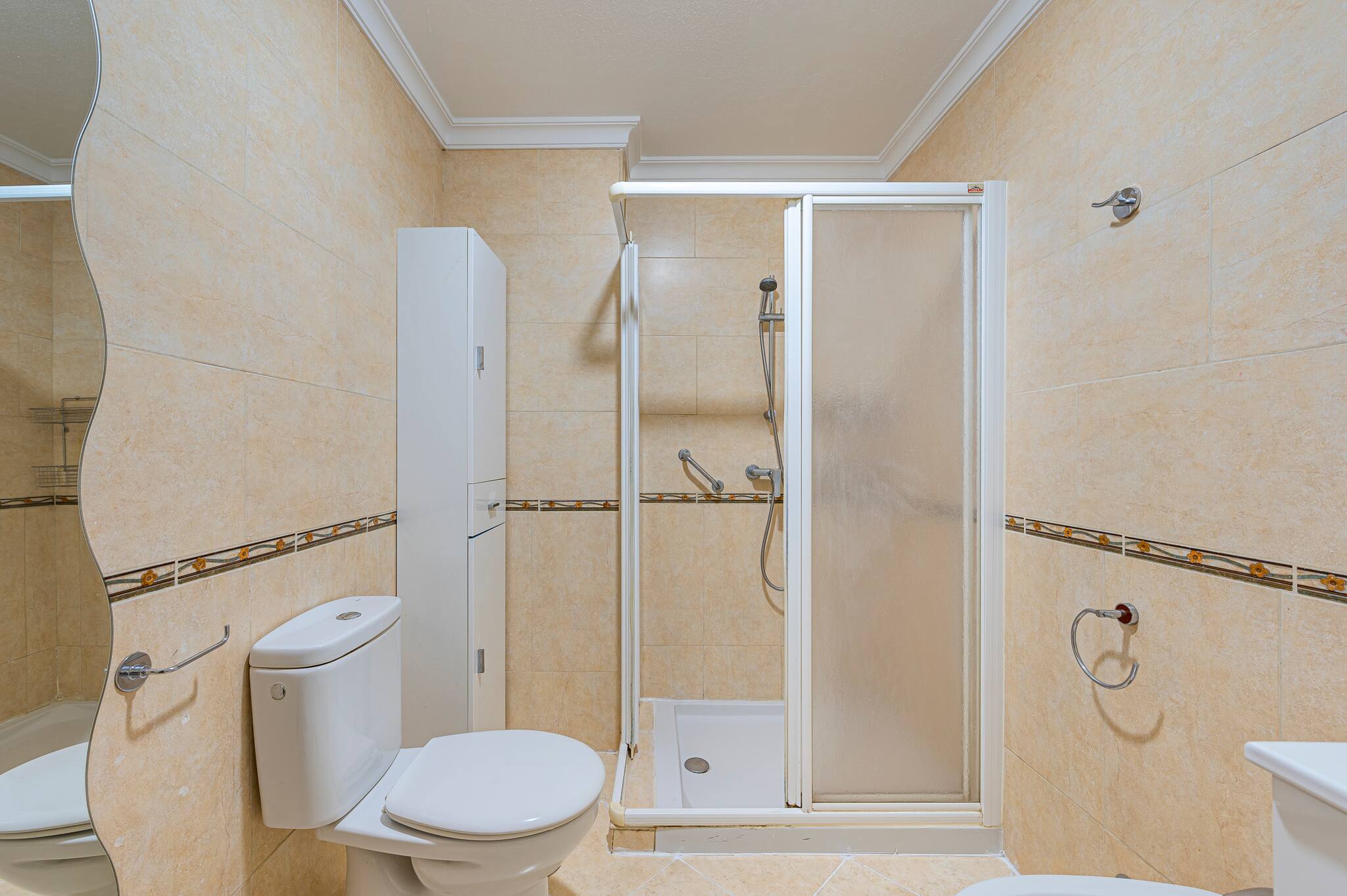 >Baño moderno y funcional con ducha cerrada de mampara, lavabo amplio con mueble de almacenaje y gran espejo iluminado. Sus acabados en tonos cálidos crean un ambiente acogedor.