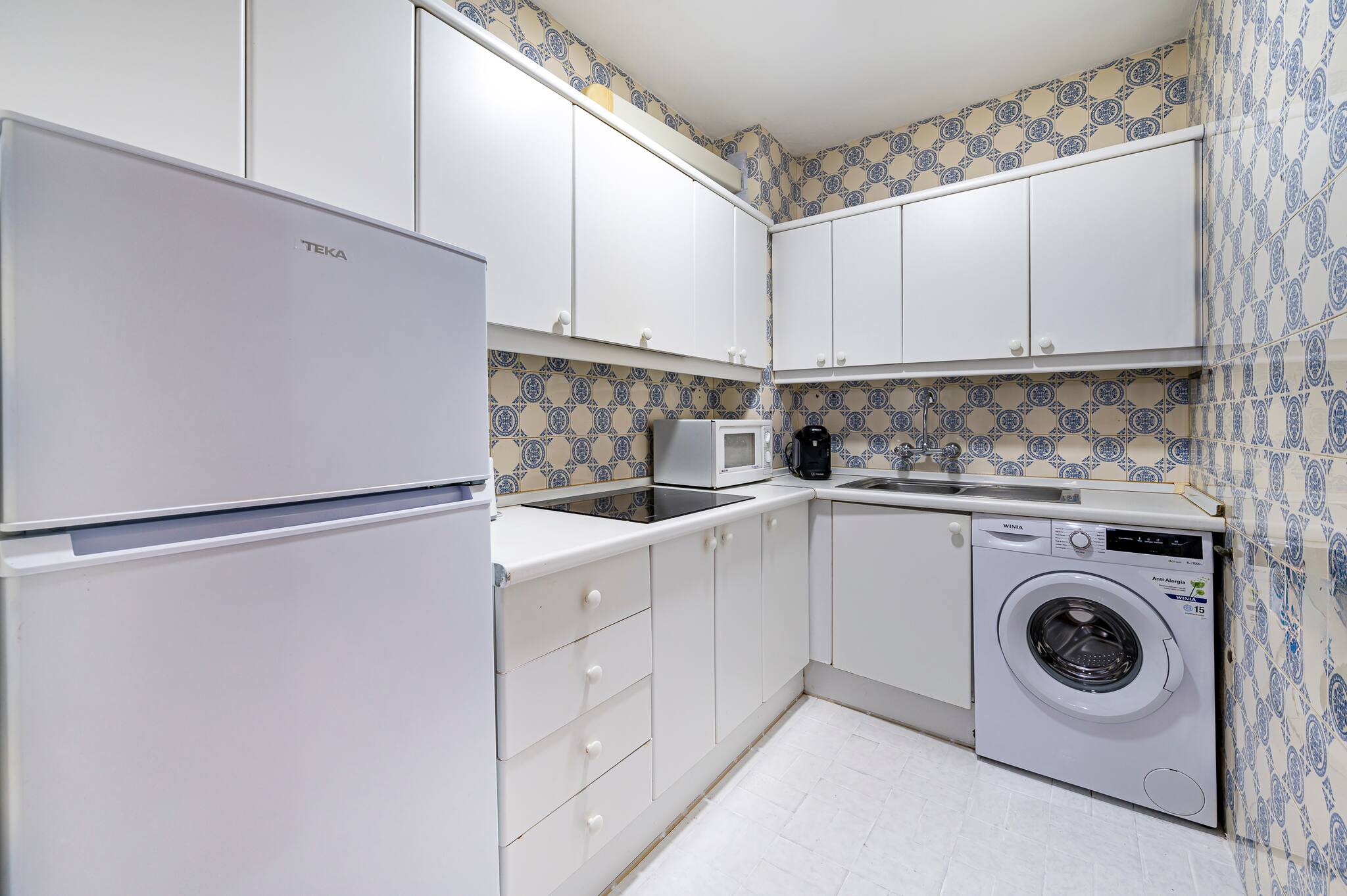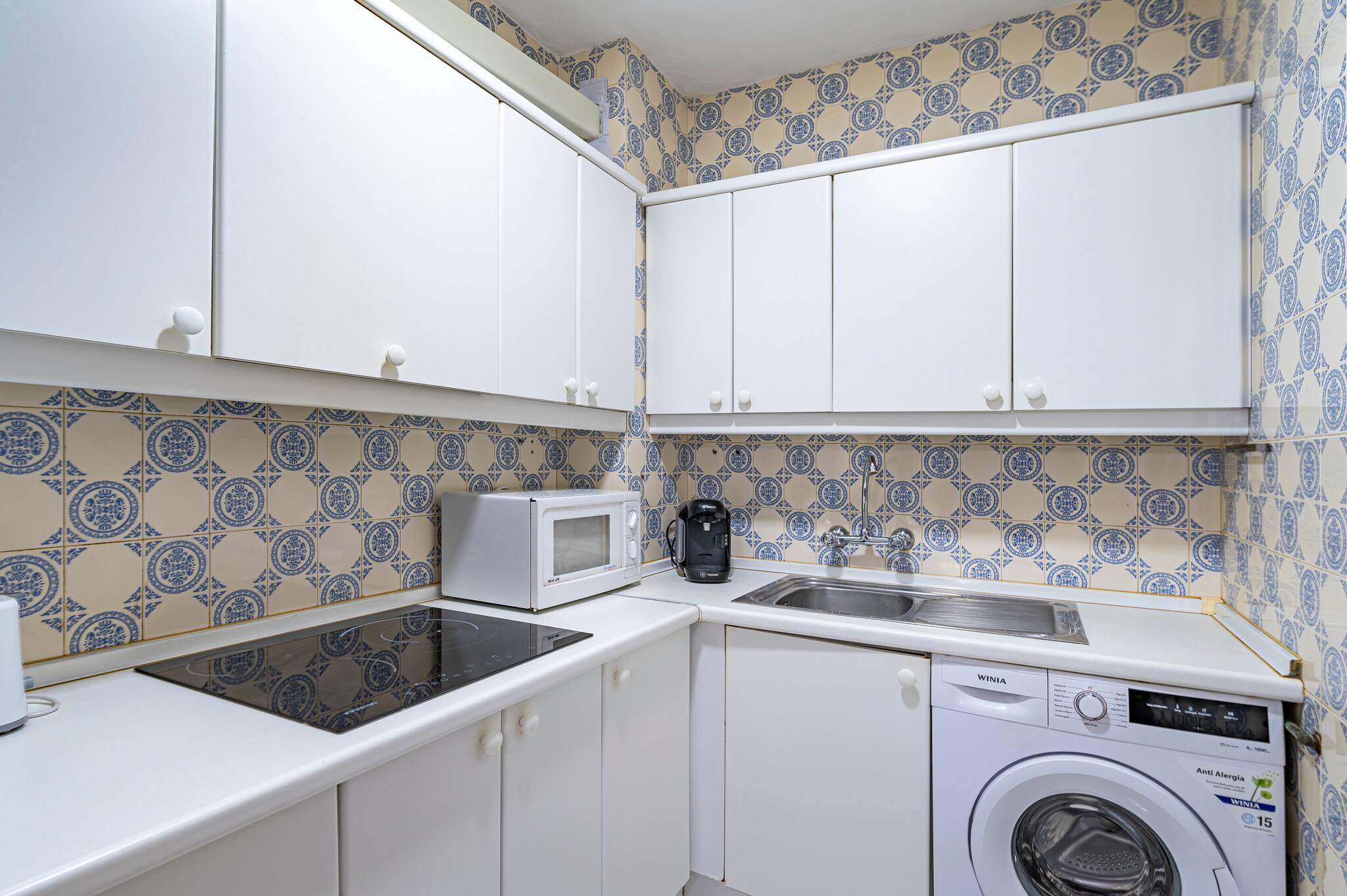 > Cocina independiente completamente equipada con electrodomésticos esenciales, incluyendo vitrocerámica, microondas, lavadora y lavavajillas. Su diseño funcional permite preparar comidas con todo lo necesario a mano.