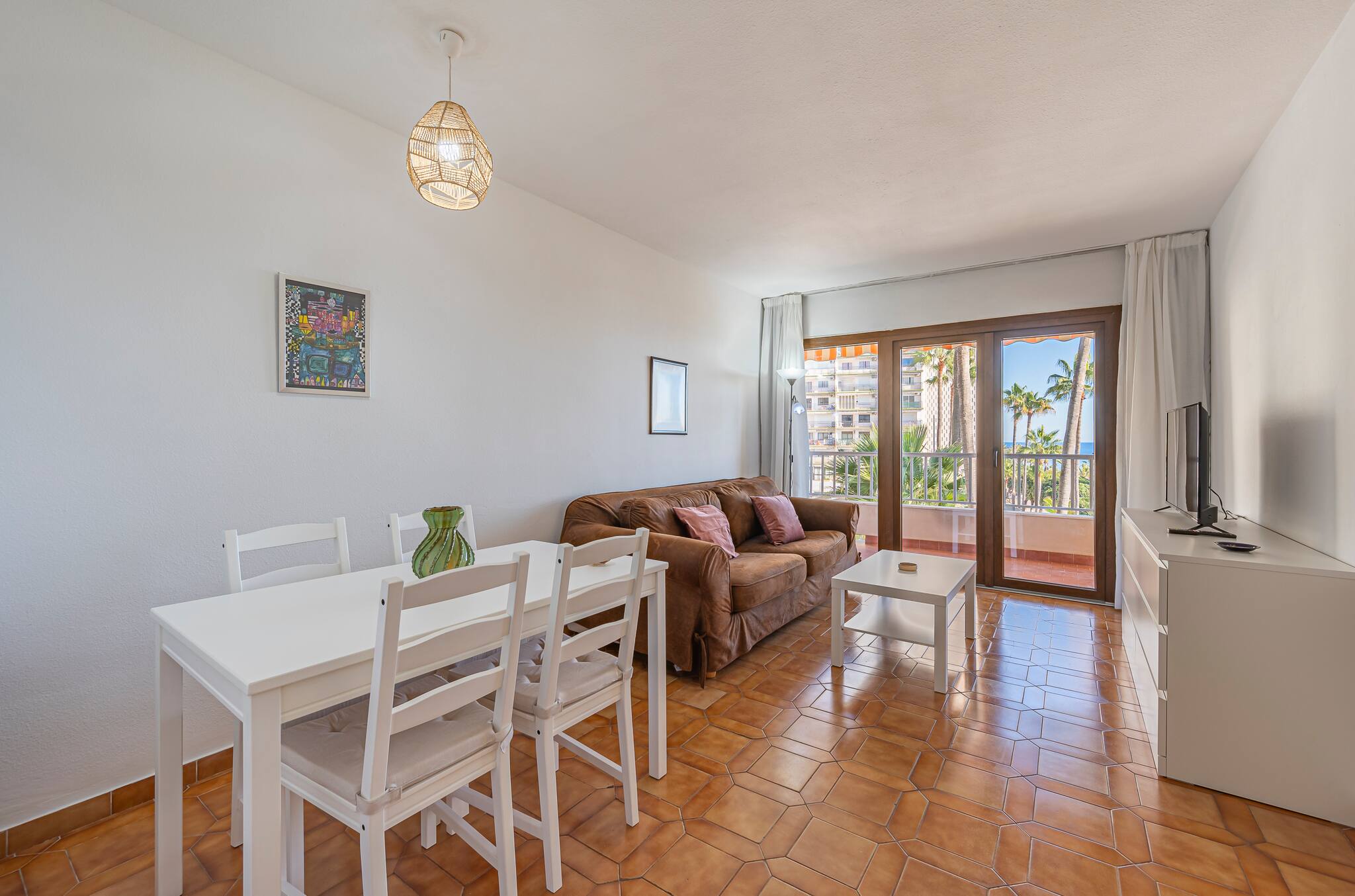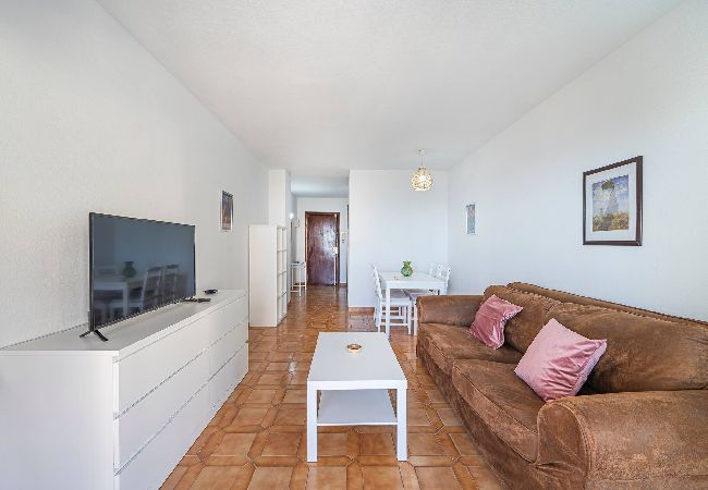 > Sector de living: con un cómodo sofá de dos cuerpos y un Smart TV que incluye Netflix y cable. Esta parte del apartamento tiene salida al balcón desde donde podéis disfrutar de unas hermosas vistas al mar.