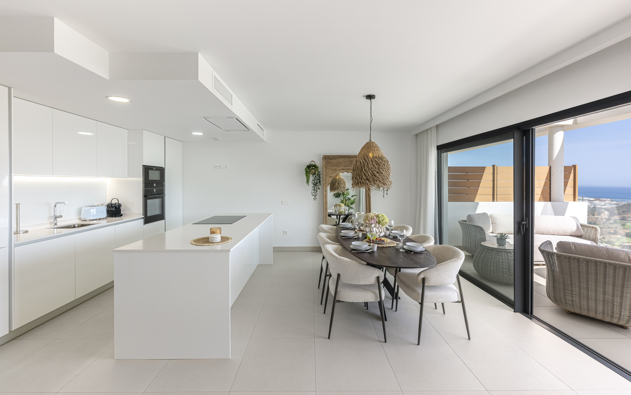 Una cocina de última generación completamente equipada con microondas, horno, lavavajillas, nevera grande, congelador y cafetera. También incluye hervidor eléctrico, tostadora y menaje completo (ollas, sartenes y utensilios) para una experiencia culinaria perfecta.