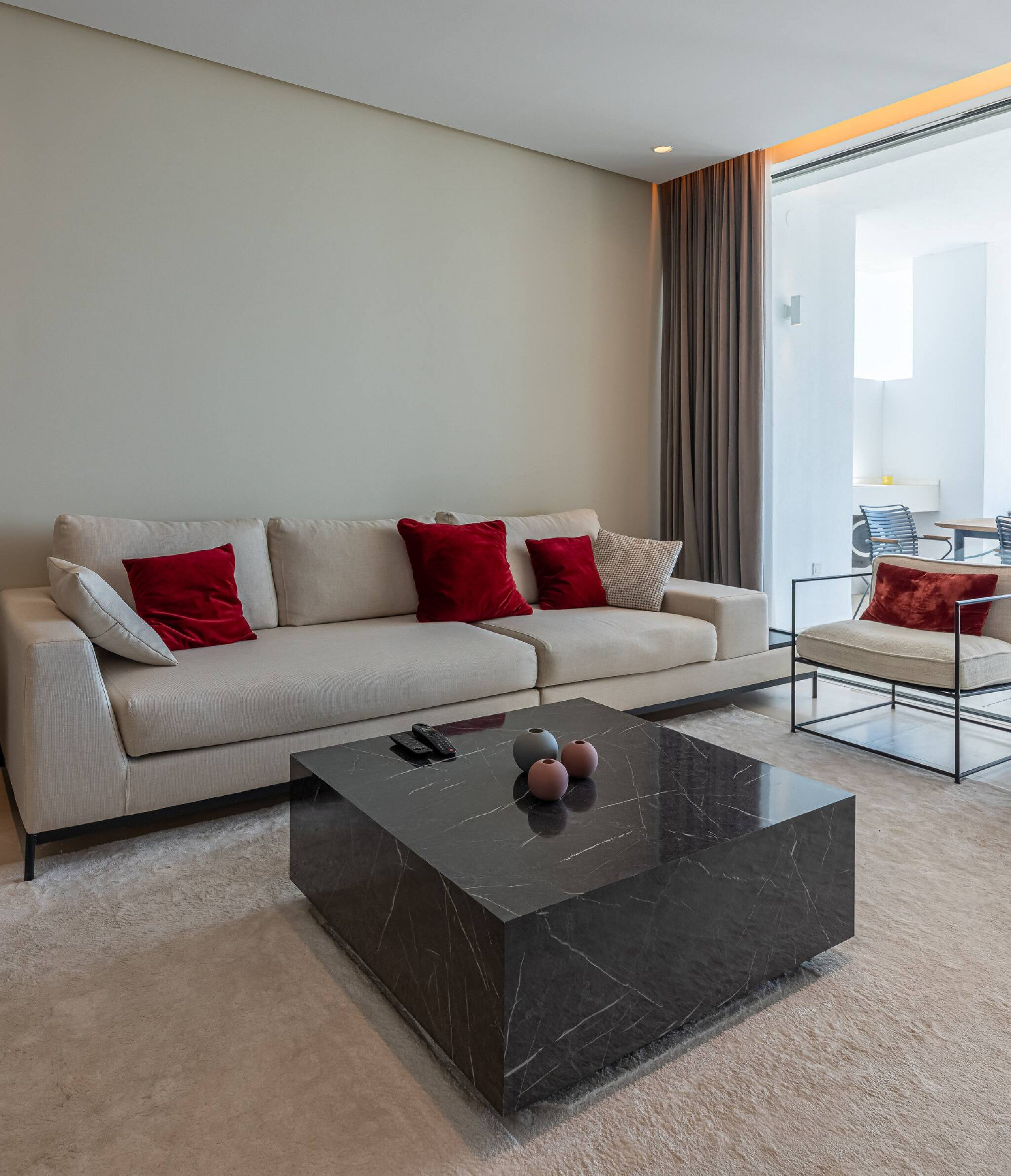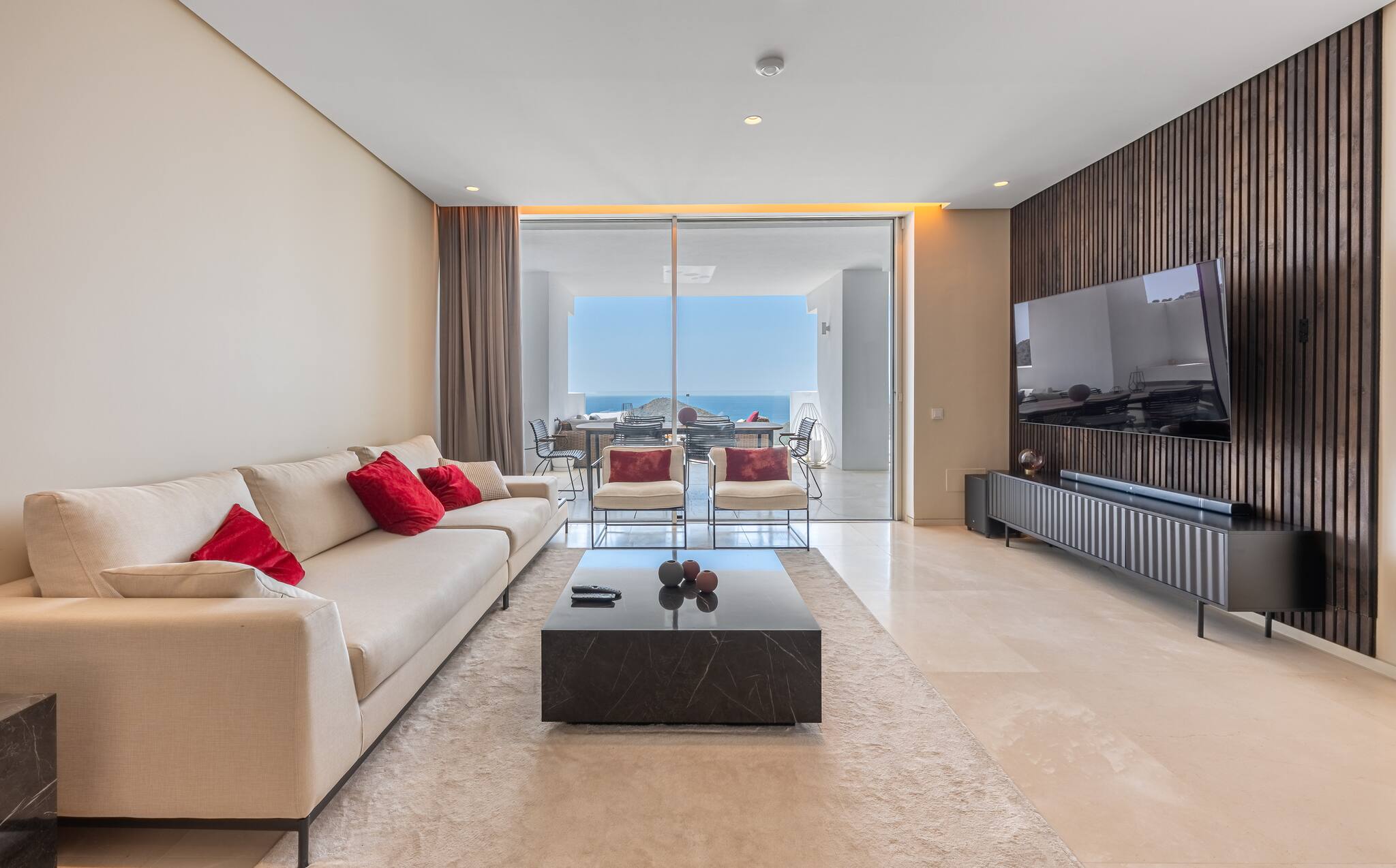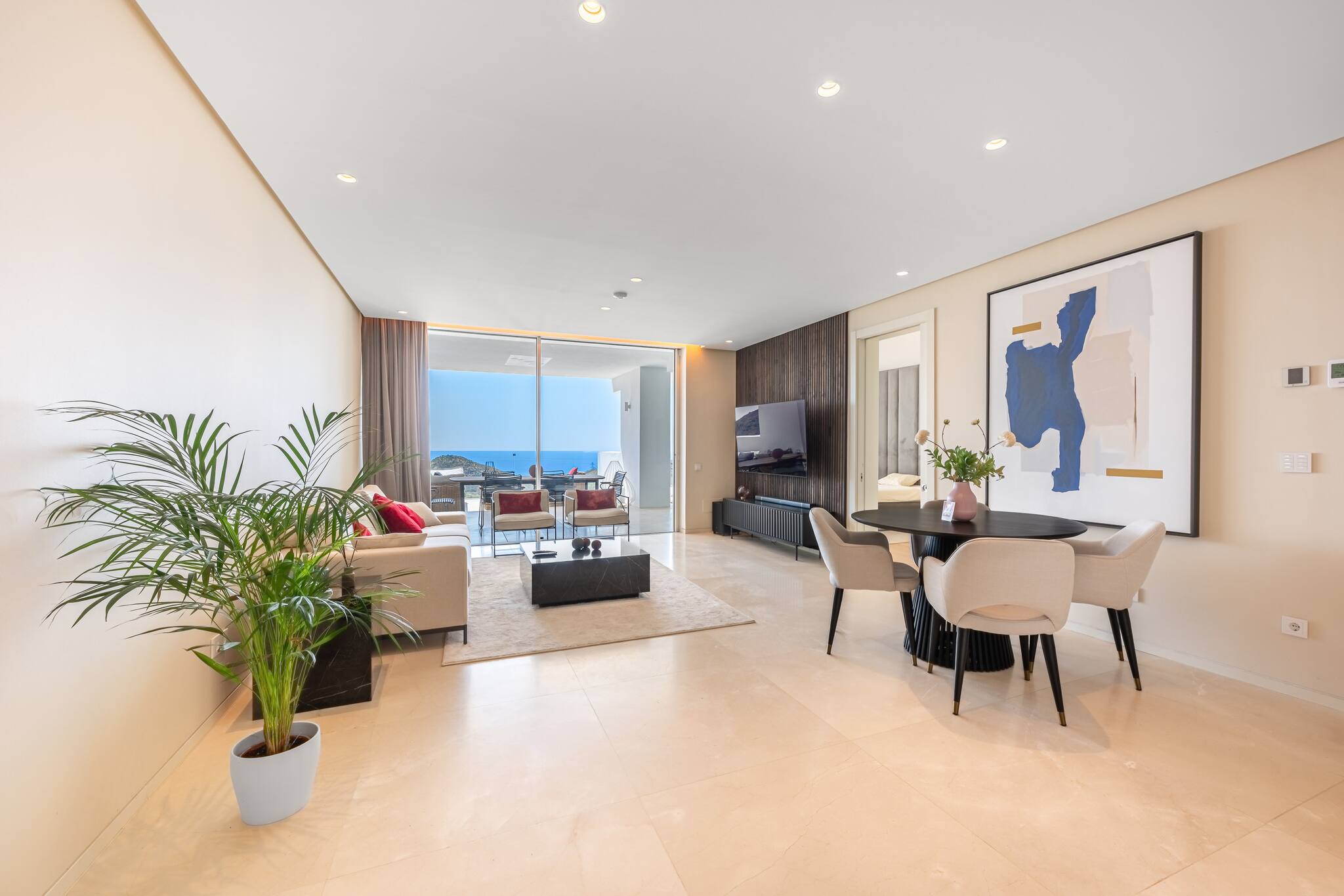 Amplio, luminoso y decorado con estilo contemporáneo, cuenta con sofá, smart TV y salida directa a la terraza con vistas al mar. Un ambiente pensado tanto para el descanso como para disfrutar en compañía.
