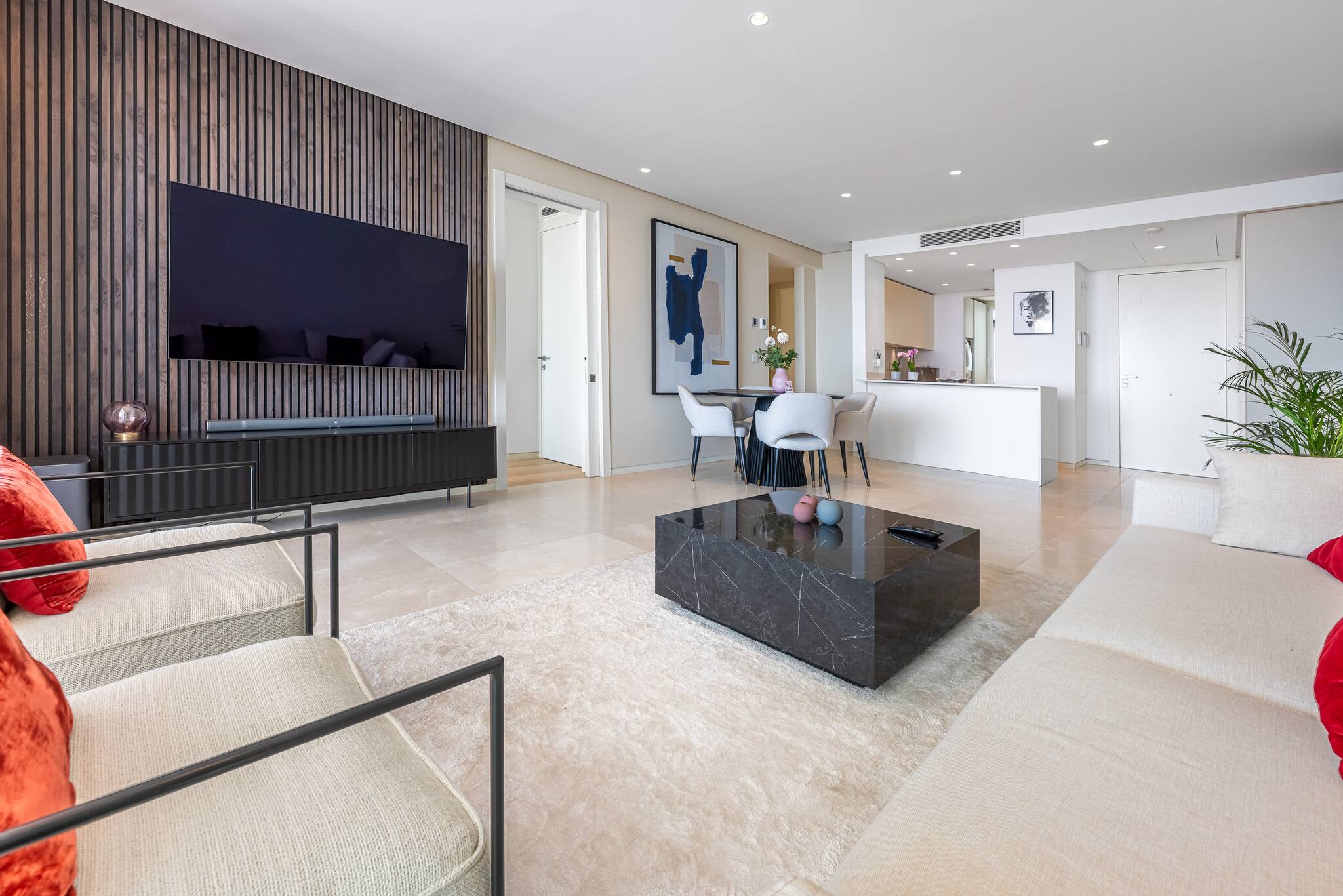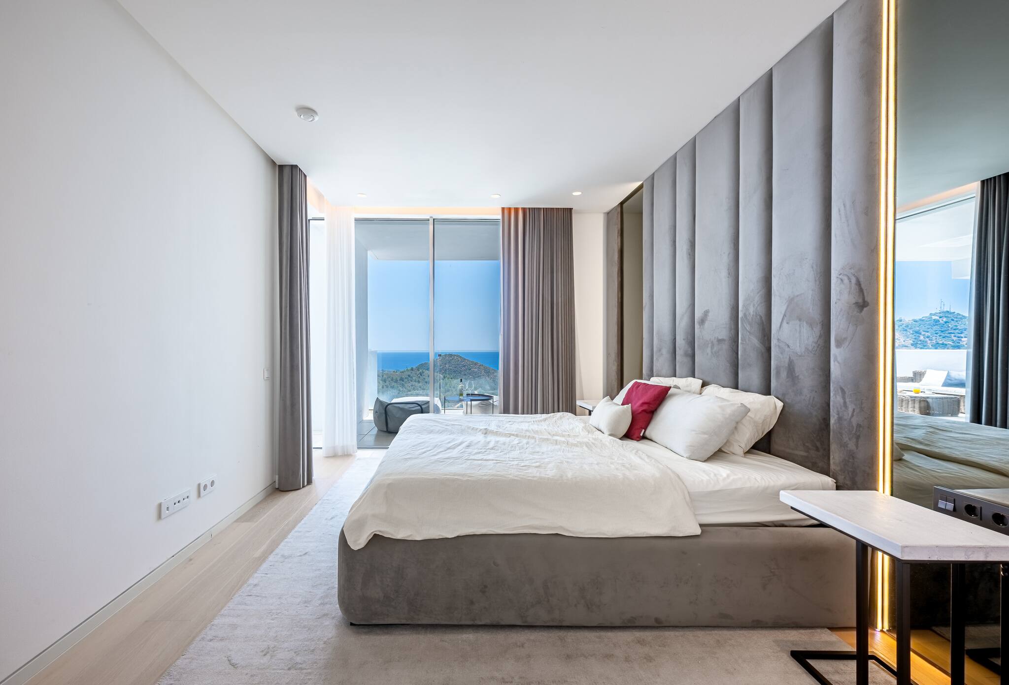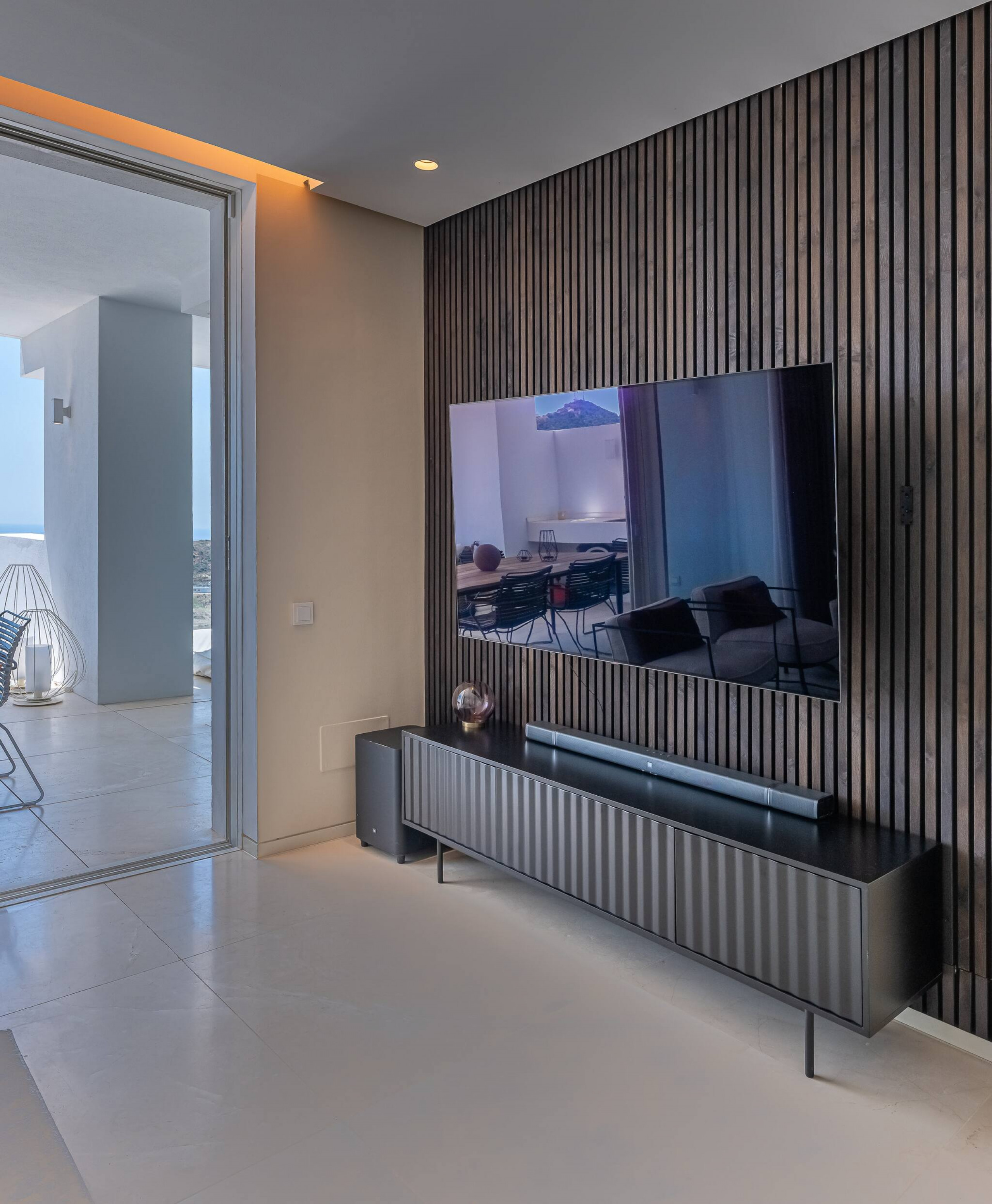 Amplio, luminoso y decorado con estilo contemporáneo, cuenta con sofá, smart TV y salida directa a la terraza con vistas al mar. Un ambiente pensado tanto para el descanso como para disfrutar en compañía.