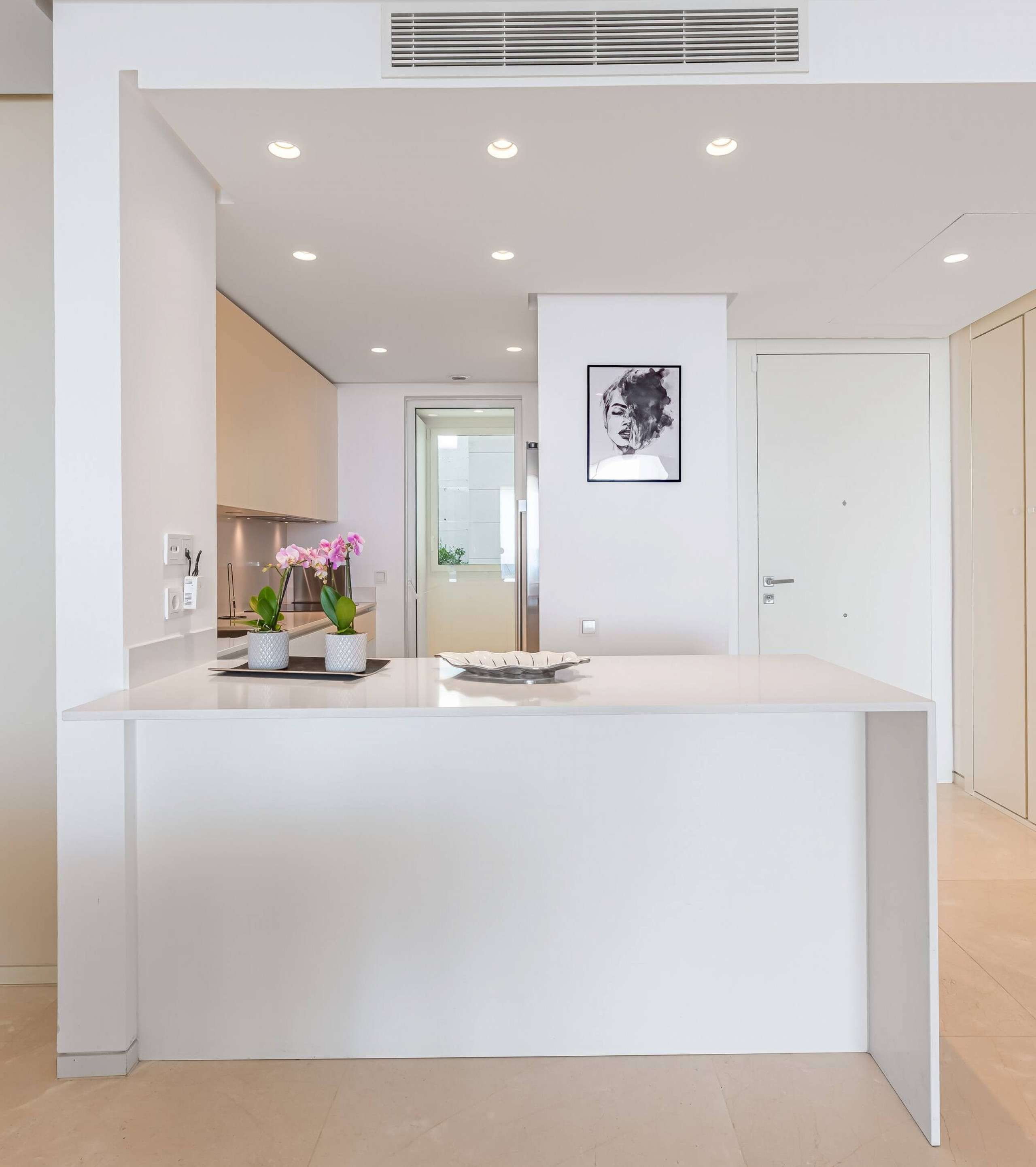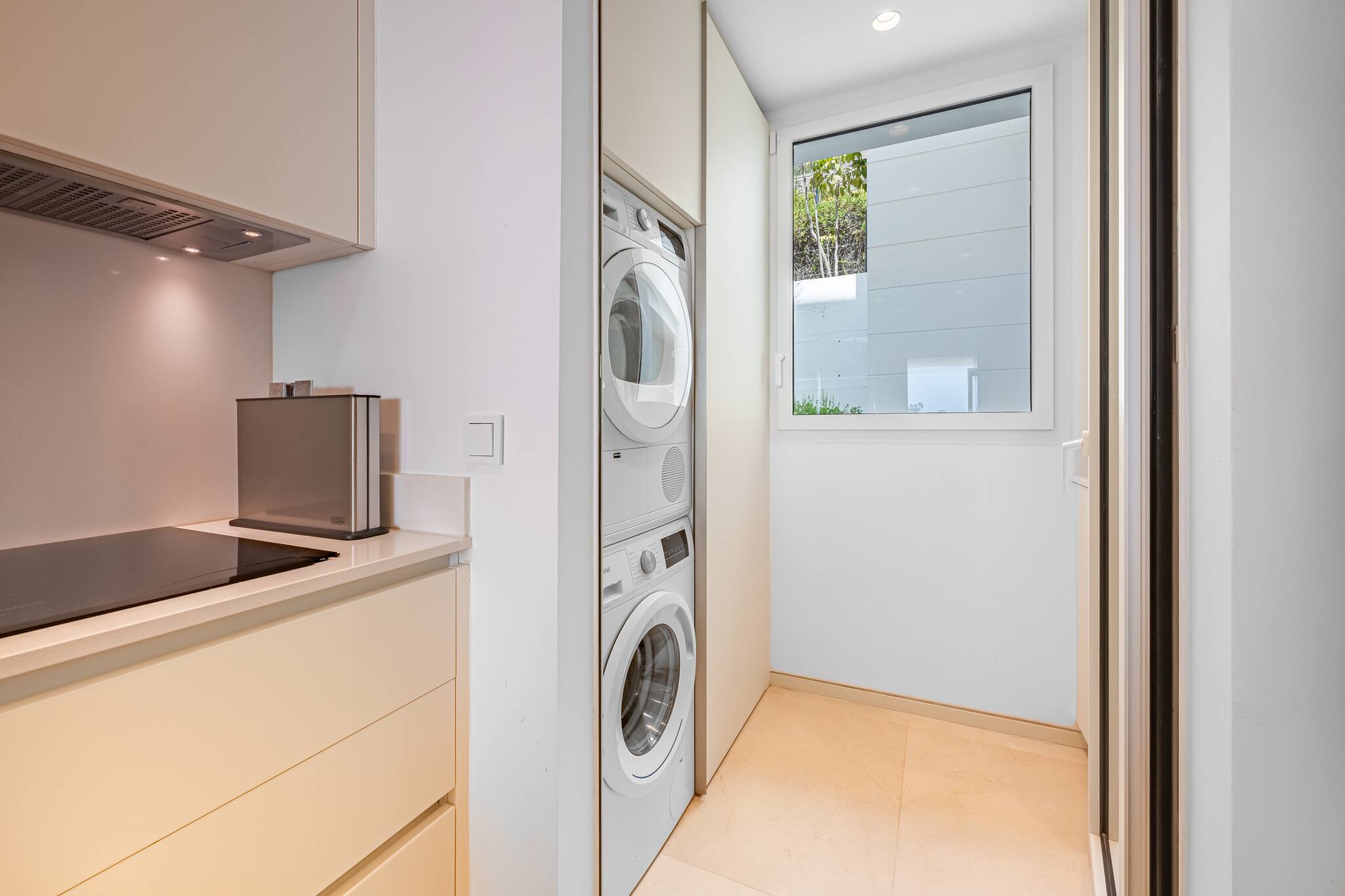 Totalmente equipada con electrodomésticos de última generación (vitrocerámica, horno, microondas, nevera americana, cafetera y más). Incluye zona de lavandería con lavadora y secadora para mayor comodidad.