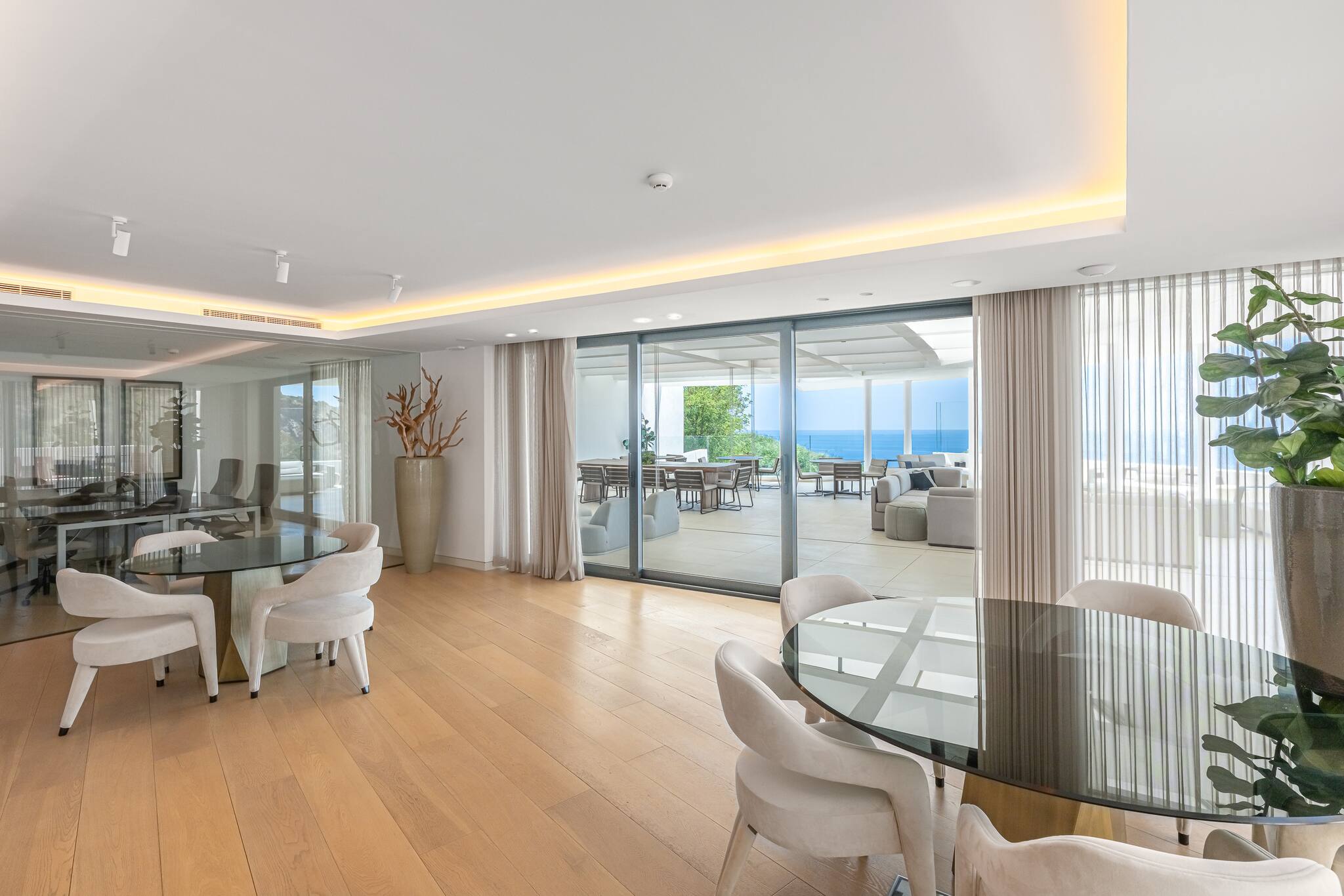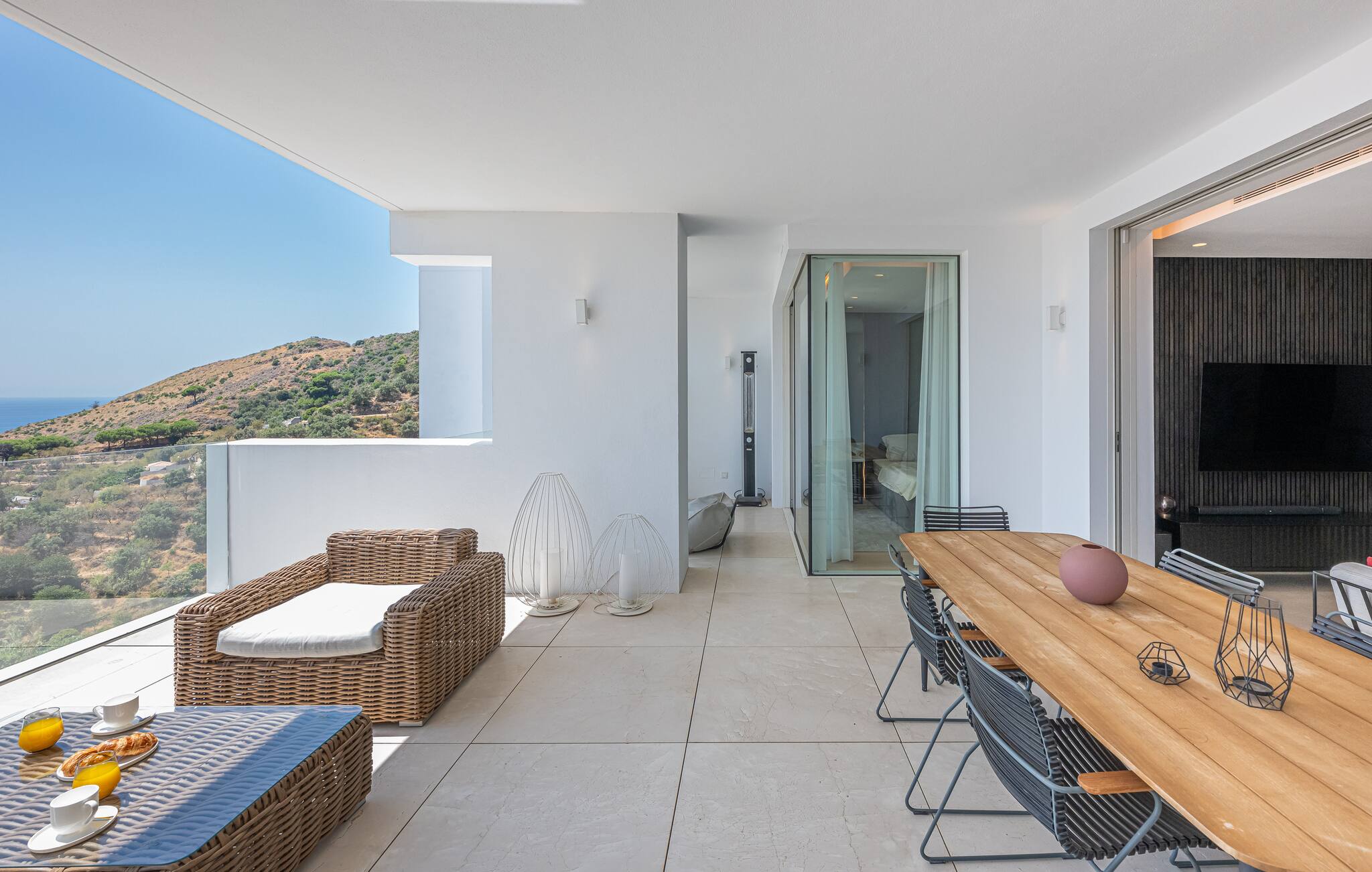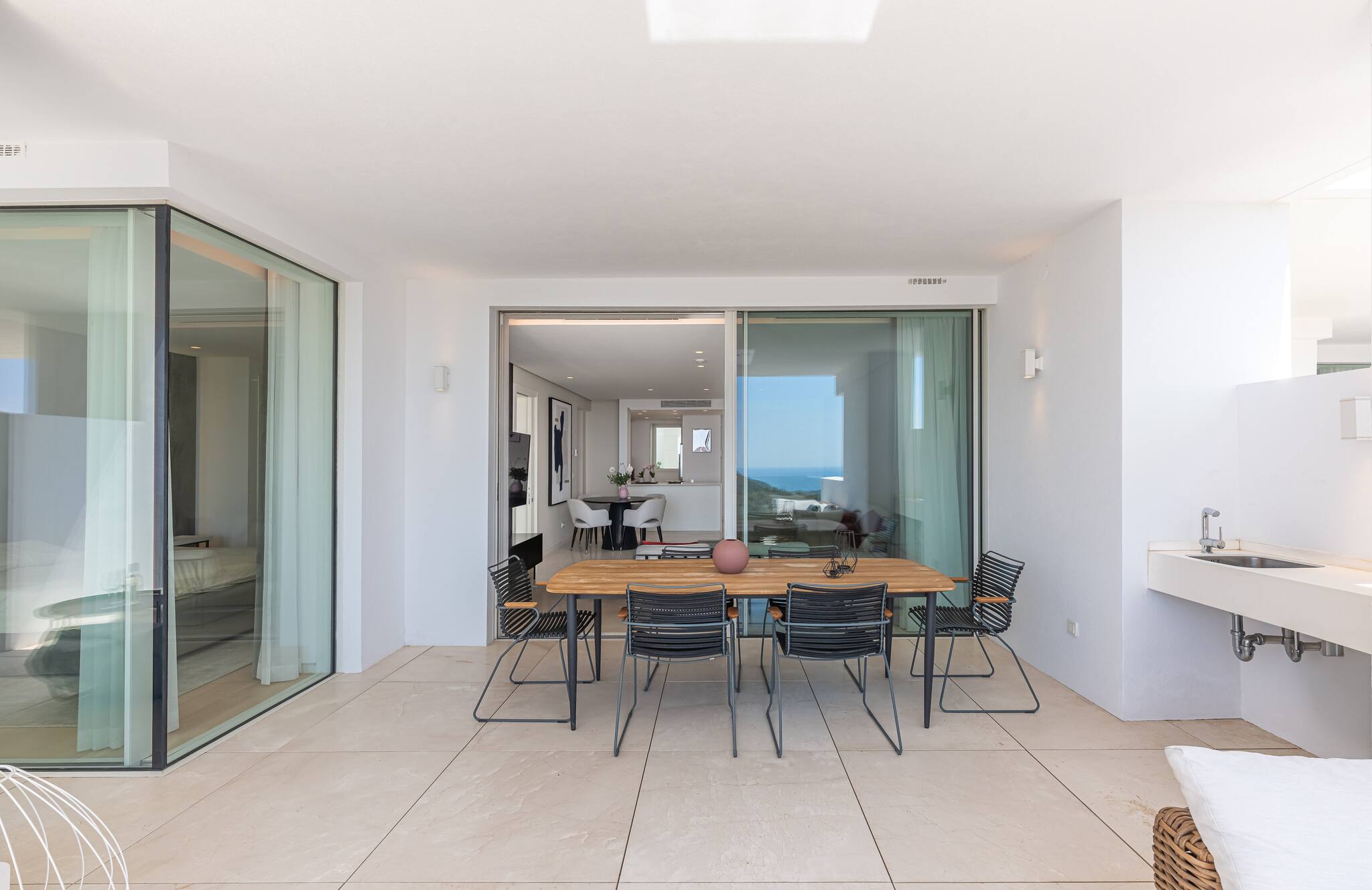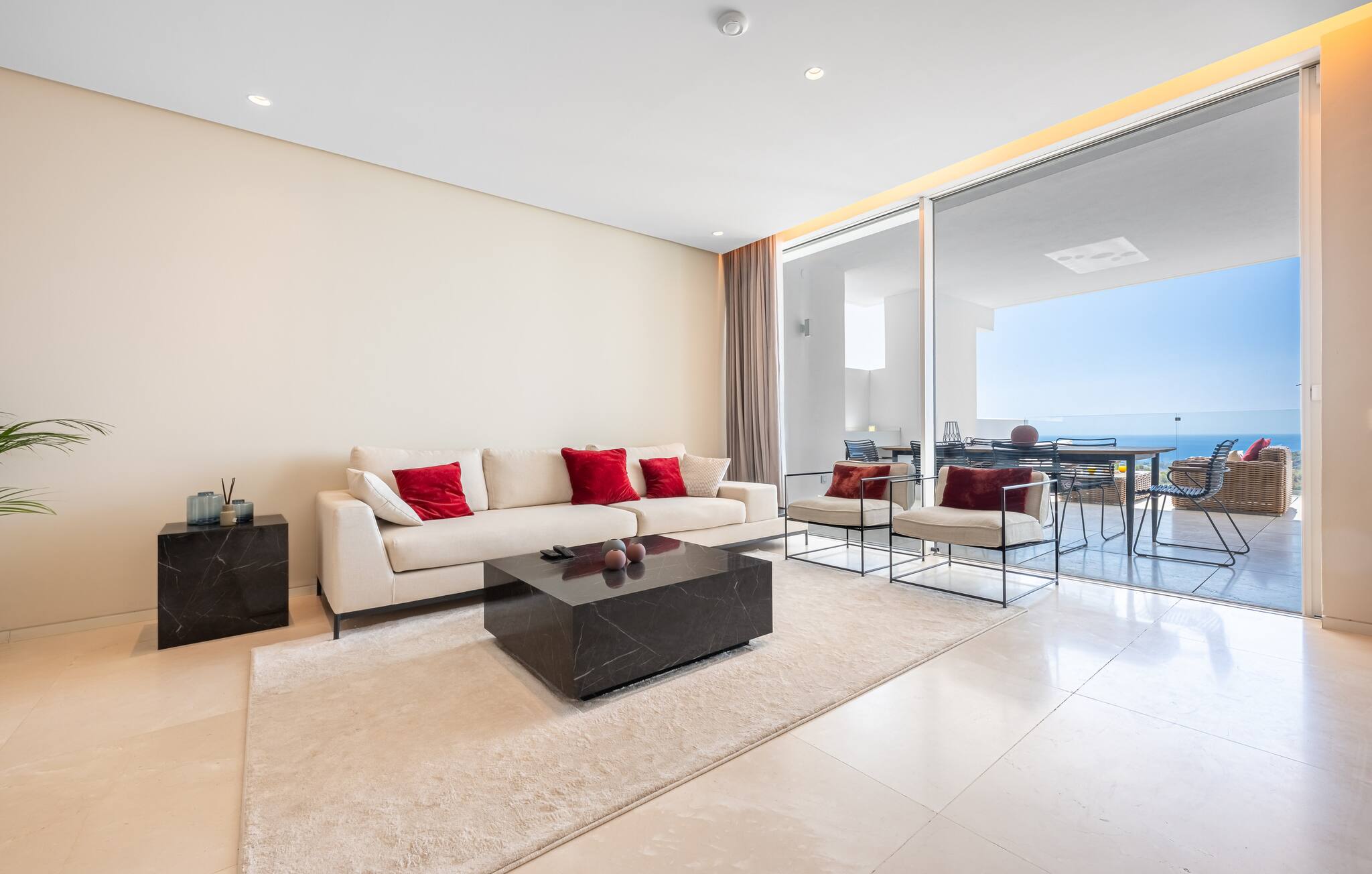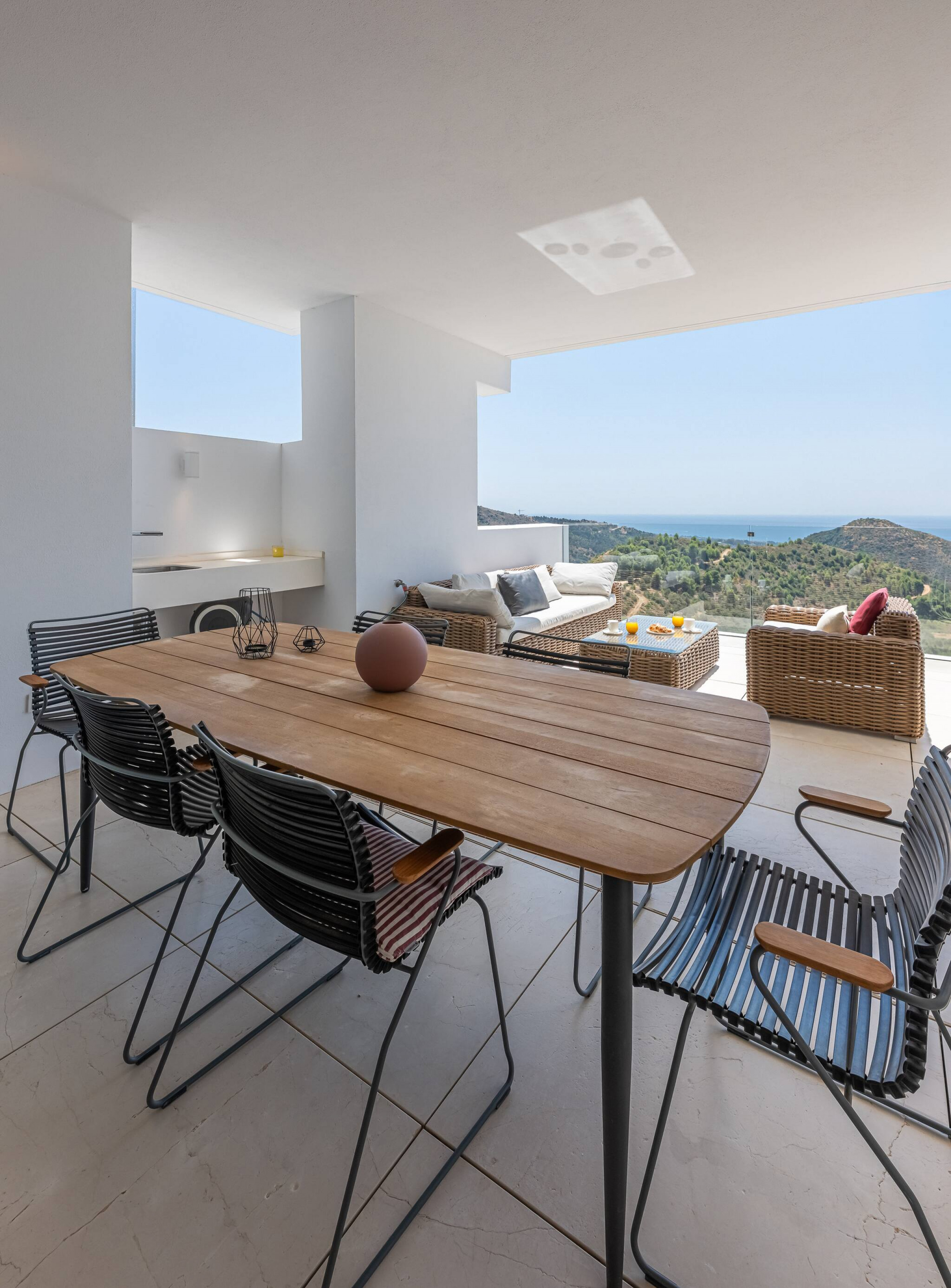 Equipada con un set de sofás y mesa de comedor exterior, perfecta para desayunar al aire libre, relajarse con un café o disfrutar de cenas al atardecer con vistas impresionantes al mar.