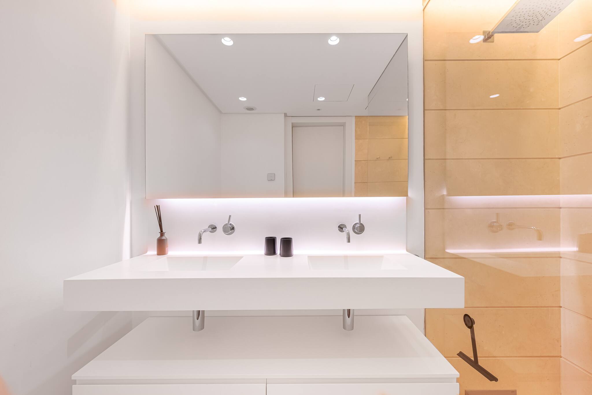 Ambos de diseño elegante con acabados de alta calidad. El principal incluye ducha tipo rain shower y doble lavabo.